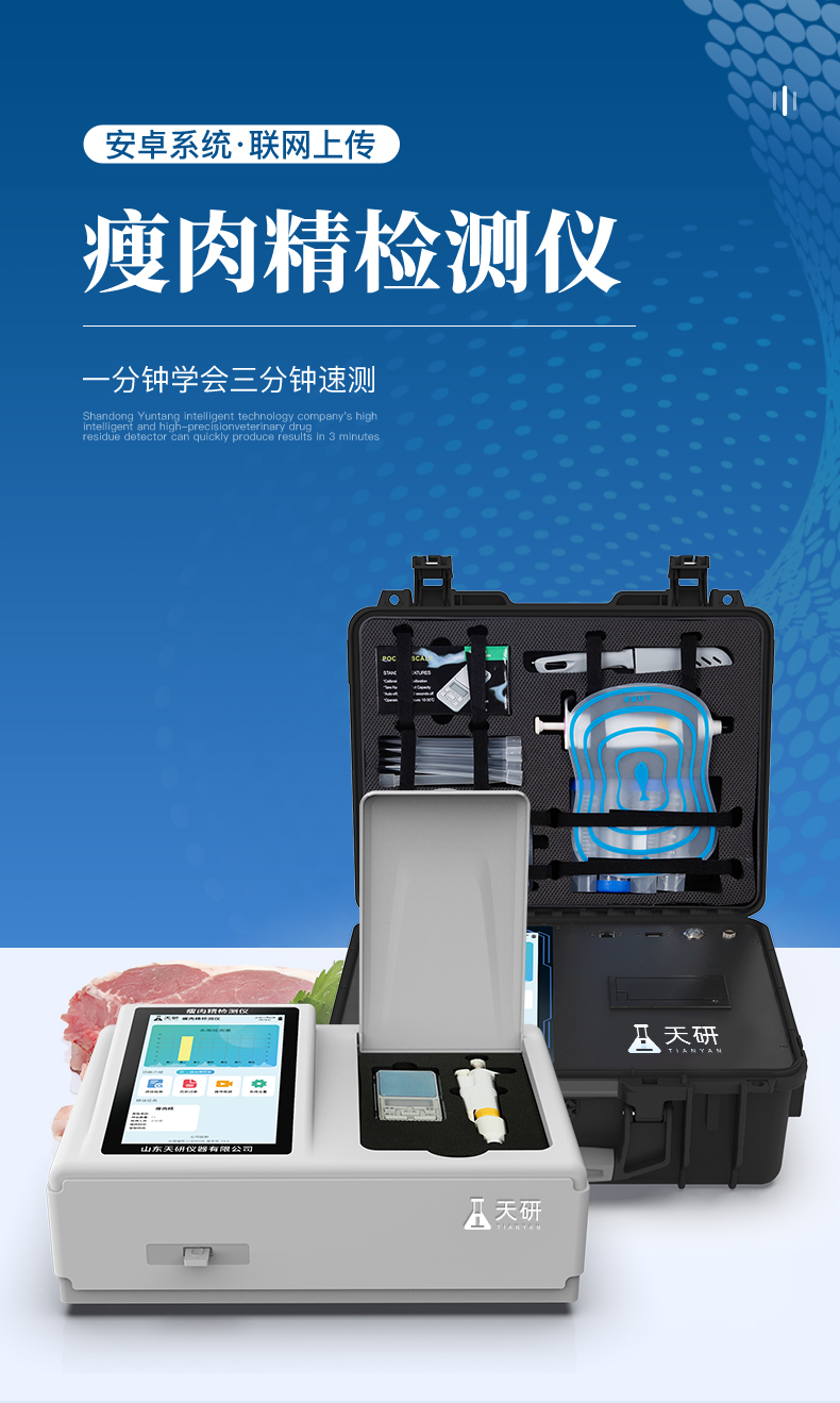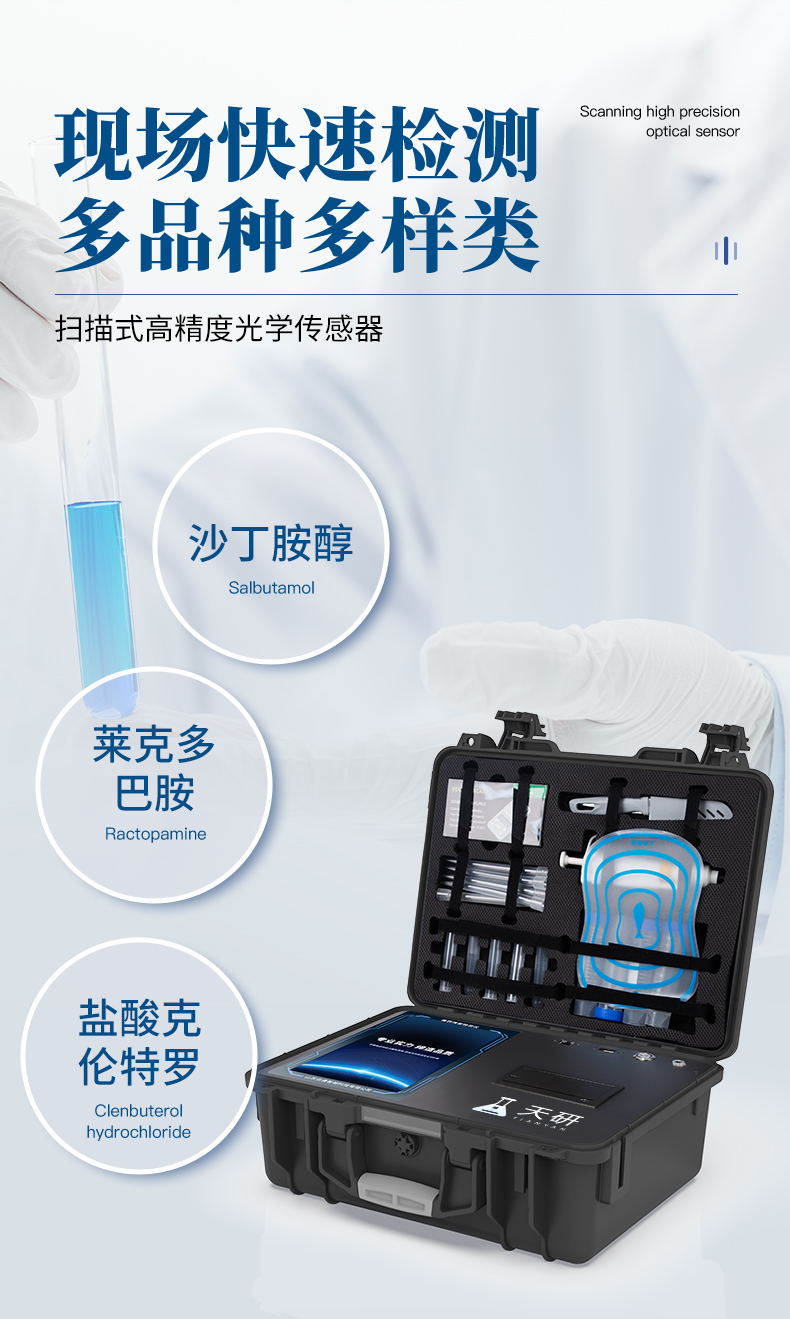 瘦肉精檢測儀可現(xiàn)場快速檢測鹽酸克倫特羅、萊克多巴胺、沙丁胺醇、己烯雌酚、喹乙醇等。儀器預(yù)留其他項(xiàng)目檢測程序和端口,根據(jù)日后需求可方便的自主增加檢測項(xiàng)目。日后可升級為檢測抗生素、獸藥殘留、動(dòng)物疫病、病害肉、的綜合類型儀器