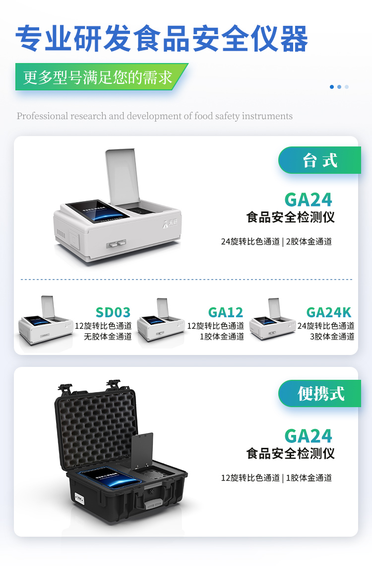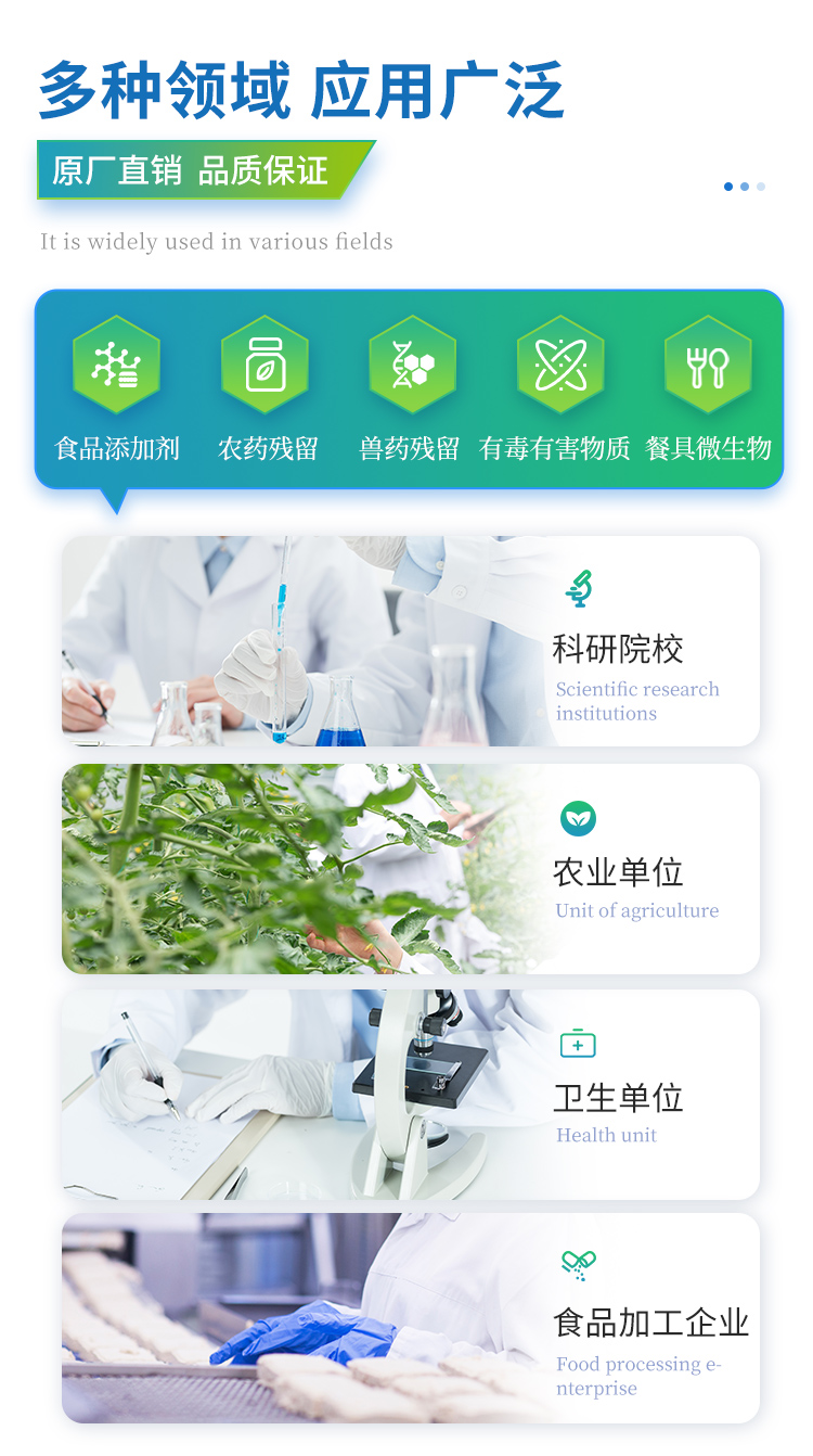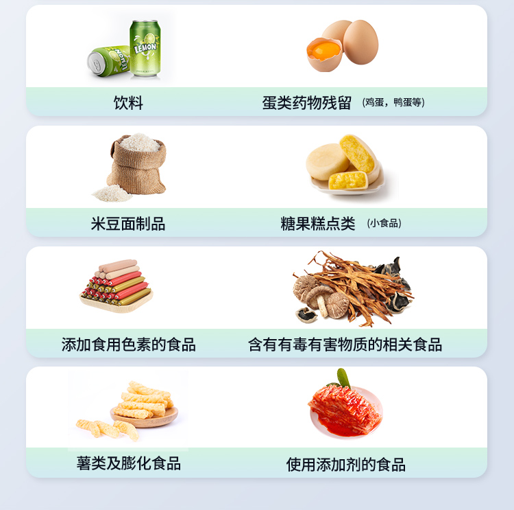 | 食品添加劑:二氧化硫、雙氧水、亞硝酸鹽、硝酸鹽、苯甲酸鈉、山梨酸鉀、糖精鈉、甜蜜素、木耳硫酸鎂等 | 有毒有害物質(zhì):甲醛、吊白塊、硼砂、過氧化苯甲酰、溴酸鉀、羅丹明B、三聚氰胺、蘇丹紅、工業(yè)堿、尿素、明礬等 | 食用油脂:過氧化值、酸價等 | 果蔬:農(nóng)藥殘留(酶抑制率法) | 病害肉:組胺、揮發(fā)性鹽基氮 | 重金屬含量: 鉛、鎘、鉻、汞、砷、錫、鎳、鋁等 | 瘦肉精激素:鹽酸克倫特羅、沙丁胺醇、萊克多巴胺、己烯雌酚等 | 抗生素殘留:四環(huán)素類、硝基呋喃類、磺胺類、β-興奮劑類、沙星類、磺胺類、喹諾酮類,甲砜霉素,氟苯尼考,金剛烷胺、替米考星、慶大霉素、林可霉素、鏈霉素、恩諾沙星、環(huán)丙沙星、頭孢啦啶、青霉素、阿莫西林等 | 水產(chǎn)品安全類:孔雀石綠、氯霉素、呋喃妥因、呋喃西林、呋喃它酮、呋喃唑酮等 | 蛋類藥物殘留:氯霉素,四環(huán)素,磺胺類,喹諾酮類,呋喃西林,呋喃它酮,呋喃妥因,呋喃唑酮,氟苯尼考,阿莫西林、頭孢氨芐、紅霉素、鏈霉素等 | 真菌毒素殘留:食用油、糧食及飼料中黃曲霉毒素B1、黃曲霉毒素總量,奶中黃曲霉毒素M1、嘔吐毒素、玉米赤霉烯酮、赭曲霉毒素A、T2毒素、伏馬毒素等 | 水酒飲品分析:酒中甲醇、乙醇、乳品及牛奶中蛋白質(zhì), | 蜂蜜成分:果糖和葡萄糖、蔗糖、淀粉酶、酸度等 | 調(diào)味品成分:食醋的總酸、醬油的總酸、芝麻油純度、谷氨酸鈉、醬油氨基酸態(tài)氮、食鹽中亞鐵氰化鉀、食鹽中碘等 | 食用色素類:紅色色素(胭脂紅、莧菜紅、莧菜紅)、黃色色素(檸檬黃、日落黃)、藍(lán)色色素(亮藍(lán))等 | 動物疫病類:禽流感、新城疫、牛羊口蹄疫、牛羊結(jié)核病、牛羊包蟲、牛羊布病、小反芻獸、豬藍(lán)耳病毒、豬瘟病毒、豬偽狂犬病毒、豬細(xì)小、豬圓環(huán)、犬細(xì)小病毒、犬瘟熱病毒、犬狂犬病毒等 |