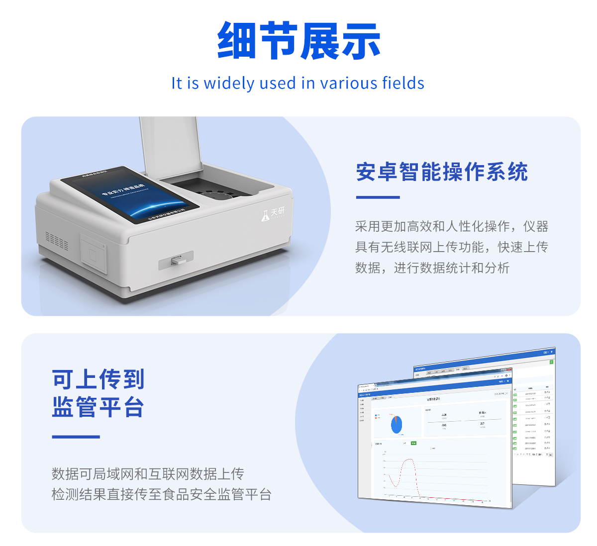 | 儀器采用臺式一體化系統(tǒng)檢測技術(shù),將分光光度模塊、膠體金檢測模塊、新型農(nóng)殘檢測模塊、數(shù)字化管理模塊、無線通訊模塊高度集成于一體,支持檢測200種食品安全檢測項目,同時預(yù)留升級檢測方法。 | 儀器檢測模塊標(biāo)準(zhǔn)化、智能化,可隨意自由組合。檢測箱體內(nèi)置多個標(biāo)準(zhǔn)檢測單元,檢測模塊可以調(diào)整配置。 | 儀器采用全新安卓智能系統(tǒng),主控芯片采用 ARM Cortex-A7,RK3288/4核處理器,10.1寸高清液晶觸摸豎屏,更加**的UI交互界面,運轉(zhuǎn)快捷;儀器配備無線通信模塊: 4G(APN)通訊模塊、Wifi模塊,藍(lán)牙傳輸,同時具有雙USB接口以及RJ45接口能以多種方式實現(xiàn)數(shù)據(jù)保存和數(shù)據(jù)傳輸功能。 | 創(chuàng)新檢測模式: | ★檢測通道:≥12通道;采用精密旋轉(zhuǎn)比色池設(shè)計,使用同芯片同光源校準(zhǔn)精度,解決不同光源之間的誤差值。1-12通道間誤差0.1%。(**號:ZL202022821055.2) | ★儀器具有自動識別比色皿檢測功能,即:將樣品比色皿放入儀器后,點擊樣品檢測,儀器自動識別比色皿進行通道檢測。 | 進口高精光源: | 高精度進口四波長冷光源,通道配置 410、520、590、630nm 波長光源,一個光源芯片驅(qū)動一個光源,誤差極小,每臺設(shè)備單獨**校準(zhǔn)光源,**比對,同時參照四種不同波段光源全方位覆蓋市面上99%的農(nóng)殘食品項目檢測。 | 膠體金模塊檢測方式: | 采用COMS實時成像技術(shù),可采集多個畫面,支持3個金標(biāo)同時讀卡,通過不同顏色的灰度變化,一秒精準(zhǔn)得出結(jié)果。 | 智能化操作系統(tǒng): | 便捷操作系統(tǒng):設(shè)備檢測時可在同一檢測界面自動對應(yīng)相關(guān)檢測通道一次性選擇1-12個樣品名稱,無須退出界面,節(jié)省操作時間。 | 數(shù)據(jù)集成系統(tǒng):設(shè)備首頁自動統(tǒng)計檢測數(shù)據(jù)包含:周檢測數(shù)據(jù)、月檢測數(shù)據(jù),全部檢測總數(shù)量,均包含檢測總數(shù),合格數(shù),不合格數(shù),以及相關(guān)柱形分析圖,對各項檢測數(shù)據(jù)清晰掌握,無需電腦查詢,更加快捷直觀。 | 項目預(yù)設(shè)系統(tǒng):支持添加單個及多個相同或不相同的任務(wù)預(yù)設(shè),一鍵快速調(diào)取,每一個任務(wù)分別可以設(shè)置不同的樣品、批次、編號、來源、備注、抽樣信息、檢測信息、受檢信息、復(fù)核信息等更多信息。無縫鏈接平臺和APP實時查看下發(fā)任務(wù)。 | 數(shù)據(jù)監(jiān)管系統(tǒng):同步對接監(jiān)管平臺,數(shù)據(jù)可局域網(wǎng)和互聯(lián)網(wǎng)數(shù)據(jù)上傳,檢測結(jié)果可選擇直接傳至食品安全監(jiān)管平臺。集成OSS輸出存儲服務(wù)、區(qū)分設(shè)備定向管理應(yīng)用,進行區(qū)域食品安全監(jiān)管及大數(shù)據(jù)分析處理與數(shù)據(jù)統(tǒng)計,檢測區(qū)域食品安全長短期動態(tài),達到食品安全問題預(yù)估、預(yù)警。 | 自定義打印系統(tǒng):內(nèi)置全新打印系統(tǒng),新創(chuàng)自定義打印方式,可按需靈活設(shè)置開啟或關(guān)閉:產(chǎn)品合格證(國家農(nóng)業(yè)部標(biāo)準(zhǔn)要求),二維碼,抽樣信息、檢測信息,受檢信息、復(fù)核信息、抽樣日期、檢測日期等信息的打印。 | 系統(tǒng)遠(yuǎn)程更新功能:可定向分客戶分儀器更新系統(tǒng),按照不同客戶后期實際需求添加項目,無需機器返廠,即可遠(yuǎn)程實時升級全新系統(tǒng),節(jié)省時間成本及避免運輸造成設(shè)備損壞。 | 儀器主機采用一體化防水、抗壓、防撞擊、防腐蝕箱體設(shè)計,同時配備交直流供電,可連接車載電源,可選配大容量充電鋰電池,滿足現(xiàn)場野外檢測需求。 | 安全證書,放心保障:儀器具有中國計量科學(xué)研究院校準(zhǔn)證書,**認(rèn)證。 |