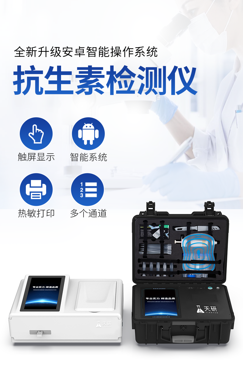 山東天研儀器有限公司生產(chǎn)的高智能食品安全檢測儀為集成化食品安全快速檢測分析設(shè)備,采用臺式一體化設(shè)計(jì),可快速檢測200多種食品安全項(xiàng)目,包含非食用化學(xué)物質(zhì)、濫用食品添加劑、農(nóng)藥殘留、獸藥殘留、重金屬、病害肉、營養(yǎng)強(qiáng)化劑、抗生素類殘留、激素類殘留、真菌毒素類殘留、化學(xué)類殘留等項(xiàng)目的定性定量檢測。目前廣泛應(yīng)用于市場監(jiān)管局、檢測中心、衛(wèi)生監(jiān)督部門、農(nóng)業(yè)部門、院校及各單位食堂、食品肉產(chǎn)品深加工企業(yè)、商超市場、司法部門、餐飲機(jī)構(gòu)、養(yǎng)殖場、屠宰場、檢驗(yàn)檢疫部門等單位。