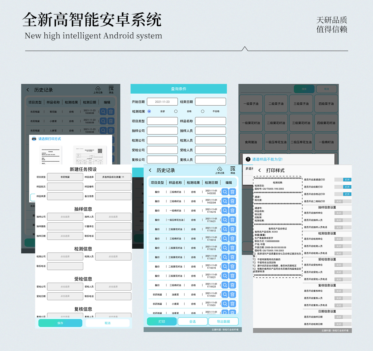 | 儀器采用手提一體化系統(tǒng)檢測技術(shù),將分光光度模塊、膠體金檢測模塊、新型農(nóng)殘檢測模塊、數(shù)字化管理模塊、無線通訊模塊高度集成于一體,支持檢測200種食品安全檢測項目,同時預(yù)留升級檢測方法。 | 儀器檢測模塊標(biāo)準(zhǔn)化、智能化,檢測項目可隨意自由組合。檢測箱體內(nèi)置多個標(biāo)準(zhǔn)檢測單元,檢測模塊可以調(diào)整配置。 | 顯示屏幕:儀器采用10.1英寸豎向液晶觸摸屏顯,搭配運行安卓智能操作系統(tǒng),主控芯片采用ARM Cortex-A7,RK3288/4核處理器,主頻1.88Ghz,操作方便,性能更強。 | 檢測通道:≥12通道;采用精密旋轉(zhuǎn)比色池設(shè)計,使用同芯片同光源校準(zhǔn)精度,解決不同光源之間的誤差值,更加準(zhǔn)確**。(1-12通道間誤差0.1%,**號:ZL202022821055.2) | 儀器光源:高精度進(jìn)口四波長冷光源,每個通道均配置 410、520、590、630nm 波長光源,標(biāo)配**的光路切換裝置,**光路切換功能可實現(xiàn)64波長,并且所有檢測項目可實現(xiàn)所有通道同時檢測。 | 設(shè)備可一鍵校準(zhǔn),自動保存校準(zhǔn)數(shù)據(jù),自動對比校驗,得到精準(zhǔn)光源,采用Android SP存儲數(shù)據(jù),光源數(shù)據(jù)永不丟失,方便每一次使用。 | 通訊接口:配備無線通信模塊、4G(APN)通訊模塊、藍(lán)牙傳輸,同時具有雙USB接口以及RJ45網(wǎng)線接口,可以多方式實現(xiàn)數(shù)據(jù)保存及數(shù)據(jù)傳輸。 | 存儲方式:支持U盤存儲,標(biāo)準(zhǔn)USB接口,免驅(qū)動安裝。檢測結(jié)果存儲容量20萬條以上,可生成Excel表格進(jìn)行拷貝,并具有登錄保護(hù)功能。 | 智能化操作系統(tǒng):: ★操作系統(tǒng):儀器可在同一檢測界面自動對應(yīng)相關(guān)檢測通道,一次性選擇1-12個樣品名稱,無需退出界面,節(jié)省操作時間。并可以對每個通道屬性和樣品信息單獨進(jìn)行編輯,例如送檢單位、人員,檢測人員等,打印時勾選打印顯示。 | ★數(shù)據(jù)集成系統(tǒng):設(shè)備首頁自動匯總分析檢測數(shù)據(jù),包含:周檢測數(shù)據(jù)、月檢測數(shù)據(jù),全部檢測總數(shù)量,均包含檢測總數(shù),合格數(shù),不合格數(shù),以及相關(guān)柱形分析圖,各項檢測數(shù)據(jù)一目了然,無需電腦查詢,更加快捷直觀。 | ★數(shù)據(jù)庫系統(tǒng):十幾項數(shù)據(jù)庫分類管理儀器:包含項目類型、項目數(shù)據(jù)、檢測數(shù)據(jù)、歷史記錄、國標(biāo)信息、曲線信息、采樣信息、檢測信息、受檢信息、復(fù)核信息、圖表信息、光源校準(zhǔn)信息、打印樣式信息、樣品庫信息等等,數(shù)據(jù)庫之間互相協(xié)調(diào)聯(lián)動保證數(shù)據(jù)的真實完整性。同時產(chǎn)品數(shù)據(jù)庫以及歷史檢測記錄支持一鍵檢索功能。 | ★限量規(guī)判系統(tǒng):具有限量查詢、添加物質(zhì)合規(guī)判定系統(tǒng)。檢測出結(jié)果后,系統(tǒng)自動調(diào)用系統(tǒng)數(shù)據(jù)庫中相關(guān)國標(biāo)進(jìn)行比對判定,客觀顯示判定結(jié)果是否合格 | ★項目預(yù)設(shè)系統(tǒng):儀器具有任務(wù)預(yù)設(shè)模塊,一鍵提前預(yù)設(shè),給出方便快捷的新檢測方案,每一個任務(wù)分別可以設(shè)置不同的樣品、批次、編號、來源、備注、抽樣信息、檢測信息、受檢信息、復(fù)核信息等更多信息。樣品送檢時一鍵調(diào)取保存信息,并可多次調(diào)取,大大提高檢測效率。 | ★數(shù)據(jù)監(jiān)管系統(tǒng):同步對接監(jiān)管平臺,數(shù)據(jù)可局域網(wǎng)和互聯(lián)網(wǎng)數(shù)據(jù)上傳,檢測結(jié)果可選擇直接傳至食品安全監(jiān)管平臺。進(jìn)行區(qū)域食品安全監(jiān)管及大數(shù)據(jù)分析處理與數(shù)據(jù)統(tǒng)計,檢測區(qū)域食品安全長短期動態(tài),達(dá)到食品安全問題預(yù)估、預(yù)警。 | ★打印系統(tǒng):內(nèi)置全新打印機(jī),新創(chuàng)自定義打印方式,可按需靈活勾選控制:產(chǎn)品合格證(國家農(nóng)業(yè)部標(biāo)準(zhǔn)要求),二維碼,抽樣信息、檢測信息,受檢信息、復(fù)核信息、抽樣日期、檢測日期等信息的打印。 | 供電模式:儀器交直流兩用,直流12V供電,可連接車載電源,可配6ah大容量充電鋰電池,電量可實時顯示,方便戶外流動測試。 | 膠體金檢測模塊:采用雙通道CMOS成像處理技術(shù)及膠體金免疫層析技術(shù),可同時讀取雙膠體金卡數(shù)據(jù),自動采集、處理分析,將檢測結(jié)果顯示,并可根據(jù)參考限值自動判斷檢測結(jié)果,可檢測常見的獸藥殘留、生物毒素、抗生素、違禁添加物等。 | ★探測技術(shù):CMOS成像探測; | ★檢測通道:1個通道; | ★檢測方式:消線法和比色法; | ★顯示模式:陰性或陽性; | 曲線形式:軌道式掃描方式,顯示金標(biāo)卡圖像,實時生成、識別CT曲線圖,無需手動調(diào)整,完成檢測后自動退出檢測卡。兼容市場上其他金標(biāo)卡,使用耗材不受限制。 | 儀器具備遠(yuǎn)程升級功能,可定向分客戶分儀器更新,開機(jī)后自動更新,并可持續(xù)性免費更新系統(tǒng)版本,無需像傳統(tǒng)產(chǎn)品返廠更新,節(jié)省時間及人力成本并避免了物流運輸返廠升級導(dǎo)致設(shè)備損壞的潛在風(fēng)險。 |