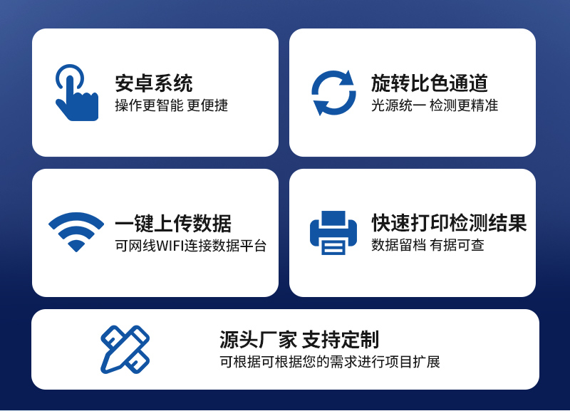 | 安卓智能操作系統(tǒng),采用更加**和人性化操作,儀器具有無線聯(lián)網(wǎng)上傳功能,快速上傳數(shù)據(jù),進(jìn)行數(shù)據(jù)統(tǒng)計(jì)和分析。 | 智能化程度高,儀器具有自檢功能:具有開機(jī)自檢和調(diào)零功能,具有自動(dòng)檢測重復(fù)性功能;同時(shí),檢測完成可自動(dòng)打印檢測報(bào)告和二維碼。手機(jī)掃碼可顯示出詳細(xì)檢測信息。 | 儀器帶有監(jiān)管平臺(tái),數(shù)據(jù)可局域網(wǎng)和互聯(lián)網(wǎng)數(shù)據(jù)上傳,檢測結(jié)果直接傳至食品安全監(jiān)管平臺(tái)。進(jìn)行區(qū)域食品安全監(jiān)管及大數(shù)據(jù)分析處理與數(shù)據(jù)統(tǒng)計(jì),檢測區(qū)域食品安全長短期動(dòng)態(tài),達(dá)到食品安全問題預(yù)估、預(yù)警 。 | 樣品處理簡單省力,整體操作快速、安全、便捷。 | 儀器具有自身保護(hù)功能,可設(shè)置用戶名及密碼,防止非工作人員操作等。 | 內(nèi)置強(qiáng)大的數(shù)據(jù)庫,可在儀器上直接選擇樣品名稱、檢測指標(biāo)、送檢單位等信息,也可在儀器上直接編輯錄入樣品名稱、檢測指標(biāo)、送檢單位等信息并保存進(jìn)樣品數(shù)據(jù)庫,方便后期操作調(diào)取使用。 | 儀器具有重新校準(zhǔn)、鎖定、恢復(fù)出廠設(shè)置功能。 |