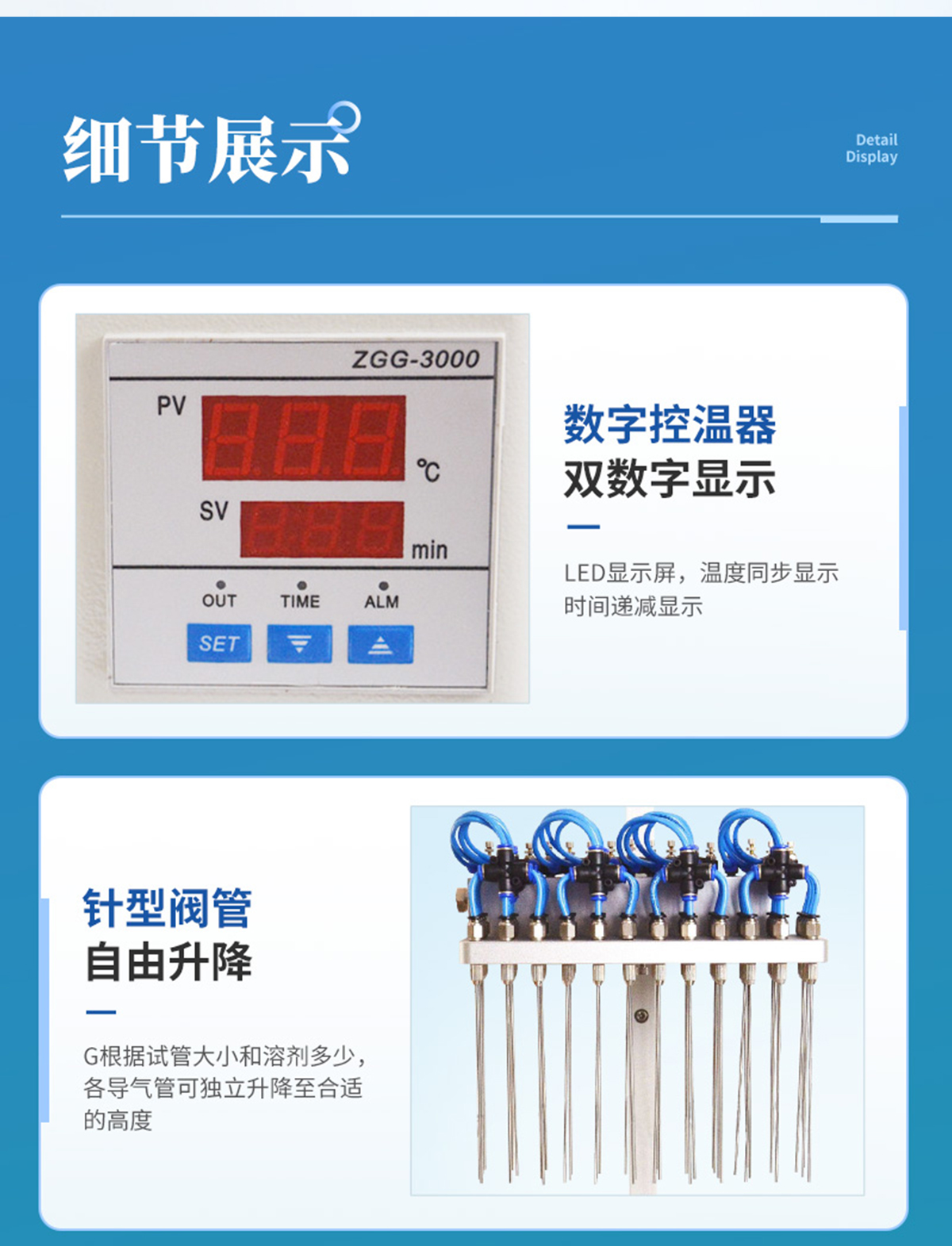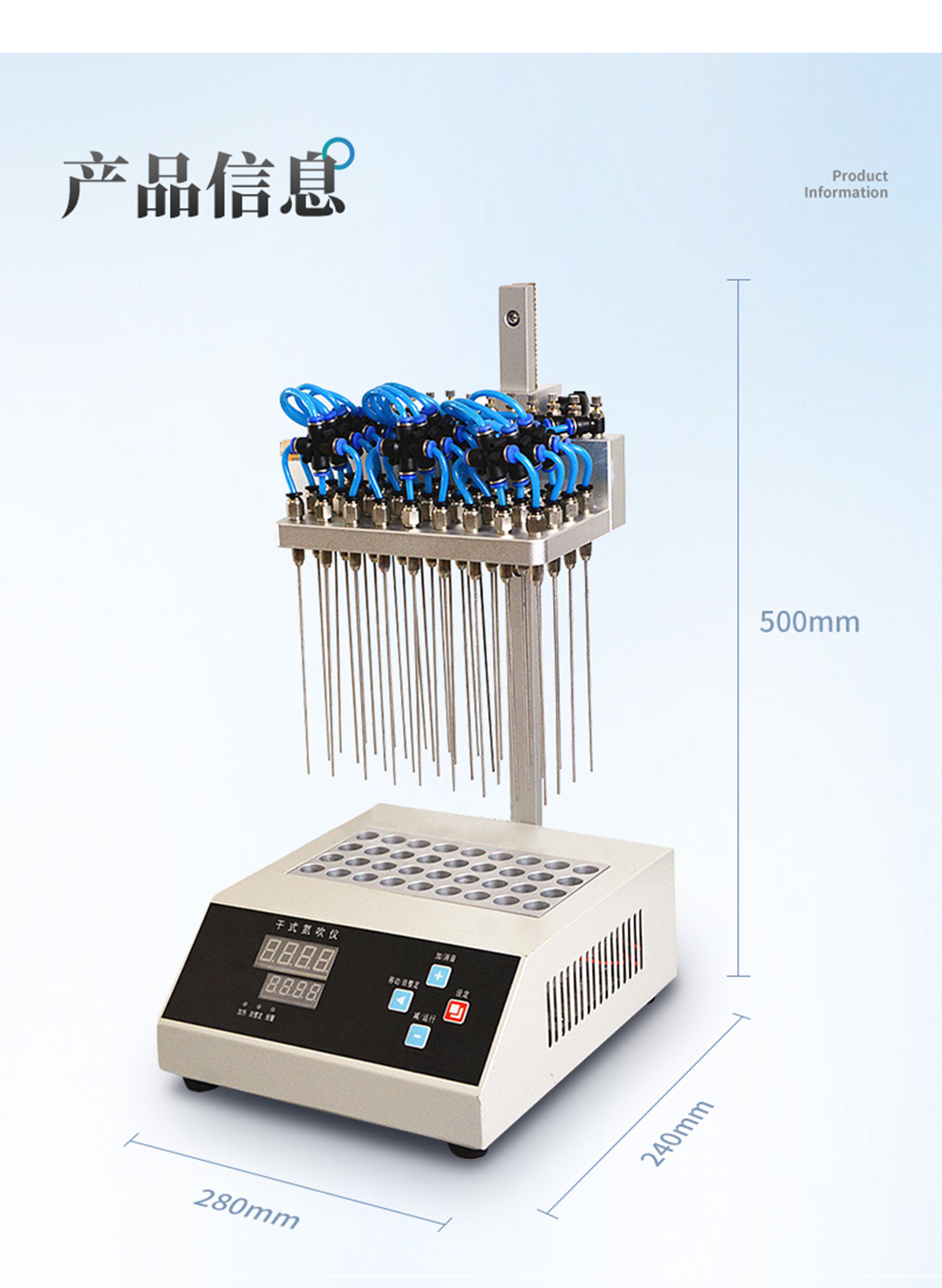 | 每個(gè)吹針都可以獨(dú)立控制,避免引起交叉污染。 | 儀器氣腔高度可以自行調(diào)節(jié),配備標(biāo)準(zhǔn)氣針長度為15厘米。 | 氮吹儀有36個(gè)氣道控制開關(guān),節(jié)約氣體,每根吹氣針的位置可獨(dú)立改變吹掃位置,使之適用不同的樣品容器及不同的樣品位置 | 在濃縮有毒溶劑時(shí),整個(gè)系統(tǒng)可置于通風(fēng)柜中,降低危險(xiǎn)。 | 內(nèi)置超溫保護(hù)裝置,自動(dòng)故障檢測及報(bào)警功能,方便實(shí)用。 | 儀器有LED顯示屏,溫度同步顯示、時(shí)間遞減顯示,可時(shí)時(shí)觀察溫度變化。 | 具有整體溫度更均勻,加熱速度快 | 本產(chǎn)品還可以作為普通的干式恒溫器使用 | 使用起來更簡便,而且溫度也可以達(dá)到150℃,可以更好濃縮樣品 |