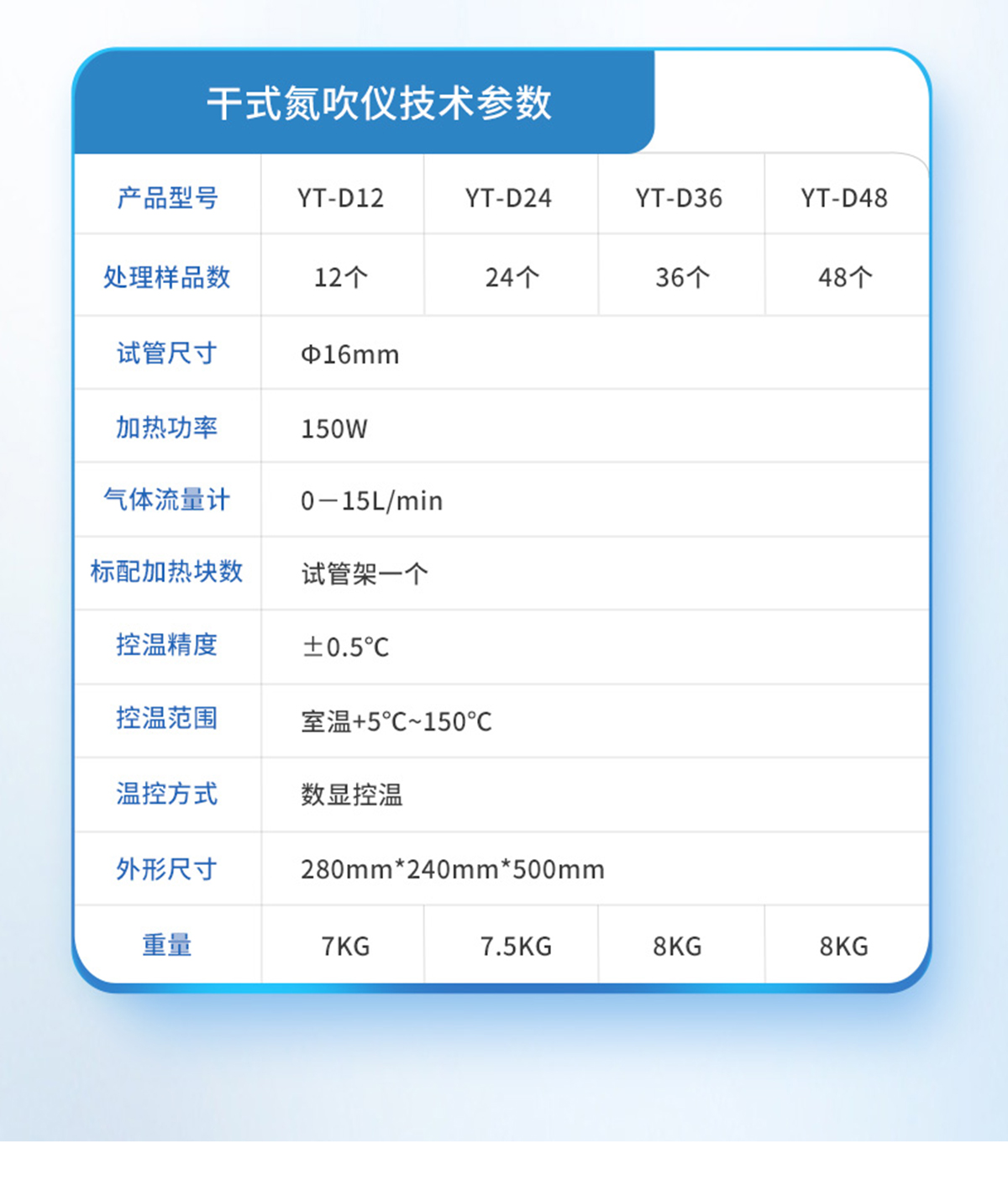 | YT-D12(12孔) | 12個(gè) | Ф16mm | 150W | 0-15L/min | 試管架一個(gè) | ±0.5℃ | 室溫+5℃~150℃ | 數(shù)顯控溫 | 280mm*240mm*500mm | 7KG |