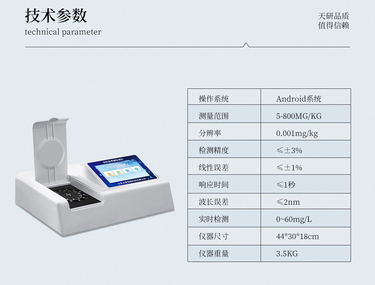| 1、智能**且方便 | ①智能芯片:主控芯片采用ARM Cortex-A7,RK3288/4核處理器,搭配安卓智能操作系統(tǒng),集實驗操作,分析結(jié)果,打印報告等功能于一體,使用方便,性能更強。 | ②大屏顯示:采用10.1英寸液晶觸摸屏,單機即可操作,無需連接外部顯示或控制器。 | ③多樣同檢:儀器具有12個檢測通道,可同時一次性檢測11個樣品,效率更高。 | ④工作預(yù)設(shè):具有任務(wù)預(yù)設(shè)模塊,一鍵提前預(yù)設(shè)樣品所有信息內(nèi)容。來樣時可直接檢測,同時可多次調(diào)取。 | ⑤數(shù)據(jù)分析:設(shè)備首頁自動匯總分析數(shù)據(jù),并繪制柱形分析圖,各項檢測數(shù)據(jù)一目了然,快捷直觀。 | ⑥高度集成:模塊高度集合,將分光光度模塊、數(shù)字化管理模塊、無線通訊模塊集成于一體。可將檢測結(jié)果進行分析,直接上傳至數(shù)據(jù)平臺,實現(xiàn)數(shù)據(jù)共享,方便后期進行數(shù)據(jù)分析與統(tǒng)計。 | ⑦遠程升級:儀器具備遠程升級功能,可遠程升級程序,無需返廠,并可持續(xù)性免費更新系統(tǒng)版本,降低成本及運輸損耗風險。 | 2、檢測精準且直觀 | ①**技術(shù):精密旋轉(zhuǎn)比色池,使用同芯片同光源校準精度,解決不同光源之間存在波長誤差的問題,更加準確**。 | ②結(jié)果直觀:儀器自動對檢測結(jié)果與國標限量值進行對比,自動判定結(jié)果是否合格,結(jié)果更直觀。 | 3、功能強大且實用 | ①存儲功能:設(shè)備可以存儲數(shù)據(jù)100000組,可在屏幕上直觀查看歷史數(shù)據(jù),可導出數(shù)據(jù)。 | ②打印功能:設(shè)備自帶打印功能,可對樣品信息及檢測結(jié)果無限次隨意打印。 | ③全新方式:新創(chuàng)自定義打印方式,可按需靈活勾選控制:二維碼,抽樣信息、檢測信息,受檢信息、復核信息、抽樣日期、檢測日期等信息的打印 | ④多重編輯:樣品信息可多重編輯,可以對每個通道屬性和樣品信息單獨進行編輯,例如樣品信息、抽樣信息、檢測信息,受檢信息、復核信息、抽樣日期、檢測日期等信息等。 | ⑤雙語設(shè)計:全中文/英文操作菜單,簡單實用,適用于不同用戶的需求。 |
