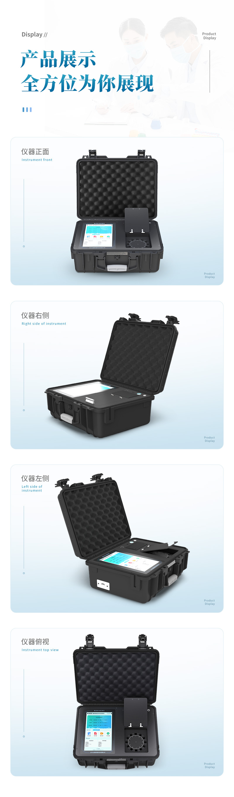 | 儀器采用手提式一體化系統(tǒng)檢測(cè)技術(shù),將分光光度模塊、膠體金檢測(cè)模塊、新型農(nóng)殘檢測(cè)模塊、數(shù)字化管理模塊、無線通訊模塊高度集成于一體,支持檢測(cè)200種食品安全檢測(cè)項(xiàng)目,同時(shí)預(yù)留升級(jí)檢測(cè)方法。 | 儀器檢測(cè)模塊標(biāo)準(zhǔn)化、智能化,檢測(cè)項(xiàng)目可隨意自由組合。檢測(cè)箱體內(nèi)置多個(gè)標(biāo)準(zhǔn)檢測(cè)單元,檢測(cè)模塊可以調(diào)整配置。 | 顯示屏幕:儀器采用10.1英寸豎向液晶觸摸屏顯,搭配運(yùn)行安卓智能操作系統(tǒng),主控芯片采用ARM Cortex-A7,RK3288/4核處理器,主頻1.88Ghz,操作方便,性能更強(qiáng)。 | 檢測(cè)通道:≥12通道;采用精密旋轉(zhuǎn)比色池設(shè)計(jì),使用同芯片同光源校準(zhǔn)精度,解決不同光源之間的誤差值,更加準(zhǔn)確**。(1-12通道間誤差0.1%,**號(hào):ZL202022821055.2) | 儀器光源:高精度進(jìn)口四波長(zhǎng)冷光源,每個(gè)通道均配置 410、520、590、630nm 波長(zhǎng)光源,標(biāo)配**的光路切換裝置,**光路切換功能可實(shí)現(xiàn)64波長(zhǎng),并且所有檢測(cè)項(xiàng)目可實(shí)現(xiàn)所有通道同時(shí)檢測(cè)。 | 設(shè)備可一鍵校準(zhǔn),自動(dòng)保存校準(zhǔn)數(shù)據(jù),自動(dòng)對(duì)比校驗(yàn),得到精準(zhǔn)光源,采用Android SP存儲(chǔ)數(shù)據(jù),光源數(shù)據(jù)永不丟失,方便每一次使用。 | 通訊接口:配備無線通信模塊、4G(APN)通訊模塊、藍(lán)牙傳輸,同時(shí)具有雙USB接口以及RJ45網(wǎng)線接口,可以多方式實(shí)現(xiàn)數(shù)據(jù)保存及數(shù)據(jù)傳輸 | 存儲(chǔ)方式:支持U盤存儲(chǔ),標(biāo)準(zhǔn)USB接口,免驅(qū)動(dòng)安裝。檢測(cè)結(jié)果存儲(chǔ)容量20萬(wàn)條以上,可生成Excel表格進(jìn)行拷貝,并具有登錄保護(hù)功能。 | 智能化操作系統(tǒng): | 1)操作系統(tǒng):儀器可在同一檢測(cè)界面自動(dòng)對(duì)應(yīng)相關(guān)檢測(cè)通道,一次性選擇1-12個(gè)樣品名稱,無需退出界面,節(jié)省操作時(shí)間。并可以對(duì)每個(gè)通道屬性和樣品信息單獨(dú)進(jìn)行編輯,例如送檢單位、人員,檢測(cè)人員等,打印時(shí)勾選打印顯示。 | 2)數(shù)據(jù)集成系統(tǒng):設(shè)備首頁(yè)自動(dòng)匯總分析檢測(cè)數(shù)據(jù),包含:周檢測(cè)數(shù)據(jù)、月檢測(cè)數(shù)據(jù),全部檢測(cè)總數(shù)量,均包含檢測(cè)總數(shù),合格數(shù),不合格數(shù),以及相關(guān)柱形分析圖,各項(xiàng)檢測(cè)數(shù)據(jù)一目了然,無需電腦查詢,更加快捷直觀。 | 3)數(shù)據(jù)庫(kù)系統(tǒng):十幾項(xiàng)數(shù)據(jù)庫(kù)分類管理儀器:包含項(xiàng)目類型、項(xiàng)目數(shù)據(jù)、檢測(cè)數(shù)據(jù)、歷史記錄、國(guó)標(biāo)信息、曲線信息、采樣信息、檢測(cè)信息、受檢信息、復(fù)核信息、圖表信息、光源校準(zhǔn)信息、打印樣式信息、樣品庫(kù)信息等等,數(shù)據(jù)庫(kù)之間互相協(xié)調(diào)聯(lián)動(dòng)保證數(shù)據(jù)的真實(shí)完整性。同時(shí)產(chǎn)品數(shù)據(jù)庫(kù)以及歷史檢測(cè)記錄支持一鍵檢索功能。 | 4)限量規(guī)判系統(tǒng):具有限量查詢、添加物質(zhì)合規(guī)判定系統(tǒng)。檢測(cè)出結(jié)果后,系統(tǒng)自動(dòng)調(diào)用系統(tǒng)數(shù)據(jù)庫(kù)中相關(guān)國(guó)標(biāo)進(jìn)行比對(duì)判定,客觀顯示判定結(jié)果是否合格。 | 5)項(xiàng)目預(yù)設(shè)系統(tǒng):儀器具有任務(wù)預(yù)設(shè)模塊,一鍵提前預(yù)設(shè),給出方便快捷的新檢測(cè)方案,每一個(gè)任務(wù)分別可以設(shè)置不同的樣品、批次、編號(hào)、來源、備注、抽樣信息、檢測(cè)信息、受檢信息、復(fù)核信息等更多信息。樣品送檢時(shí)一鍵調(diào)取保存信息,并可多次調(diào)取,大大提高檢測(cè)效率。 | 6)數(shù)據(jù)監(jiān)管系統(tǒng):同步對(duì)接監(jiān)管平臺(tái),數(shù)據(jù)可局域網(wǎng)和互聯(lián)網(wǎng)數(shù)據(jù)上傳,檢測(cè)結(jié)果可選擇直接傳至食品安全監(jiān)管平臺(tái)。進(jìn)行區(qū)域食品安全監(jiān)管及大數(shù)據(jù)分析處理與數(shù)據(jù)統(tǒng)計(jì),檢測(cè)區(qū)域食品安全長(zhǎng)短期動(dòng)態(tài),達(dá)到食品安全問題預(yù)估、預(yù)警。 | 7)打印系統(tǒng):內(nèi)置全新打印機(jī),新創(chuàng)自定義打印方式,可按需靈活勾選控制:產(chǎn)品合格證(國(guó)家農(nóng)業(yè)部標(biāo)準(zhǔn)要求),二維碼,抽樣信息、檢測(cè)信息,受檢信息、復(fù)核信息、抽樣日期、檢測(cè)日期等信息的打印。 | 供電模式:儀器交直流兩用,直流12V供電,可連接車載電源,可配6ah大容量充電鋰電池,電量可實(shí)時(shí)顯示,方便戶外流動(dòng)測(cè)試。 | 膠體金檢測(cè)模塊:采用雙通道CMOS成像處理技術(shù)及膠體金免疫層析技術(shù),可同時(shí)讀取雙膠體金卡數(shù)據(jù),自動(dòng)采集、處理分析,將檢測(cè)結(jié)果顯示,并可根據(jù)參考限值自動(dòng)判斷檢測(cè)結(jié)果,可檢測(cè)常見的獸藥殘留、生物毒素、抗生素、違禁添加物等。 | 1)探測(cè)技術(shù):CMOS成像探測(cè); | 2)檢測(cè)通道:1個(gè)通道; | 3)檢測(cè)方式:消線法和比色法; | 4)顯示模式:陰性或陽(yáng)性; | 5)曲線