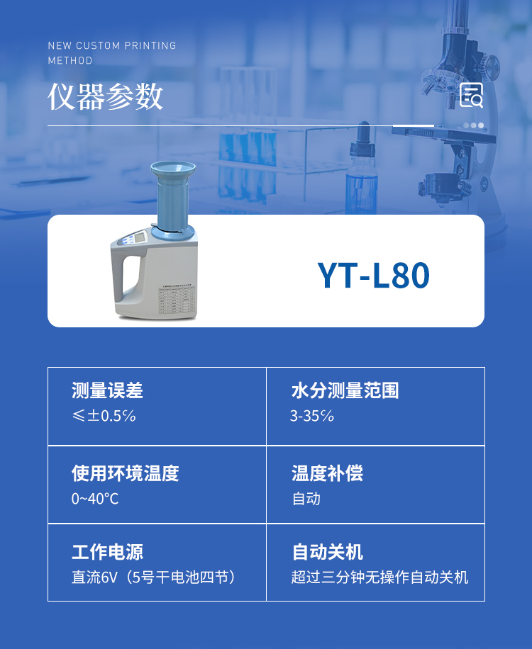 TY-L80型糧食水分測定儀是老型糧食水分測定儀的升級產(chǎn)品、在原來的基礎(chǔ)上增加了自動累加測量次數(shù),計算平均值功能和容量自動換算顯示功能,其性能更穩(wěn)定可靠,擁有外觀設(shè)計國家**,外形新穎美觀,完**與國外同類產(chǎn)品媲美,是水分測量儀器理想的升級換代產(chǎn)品。