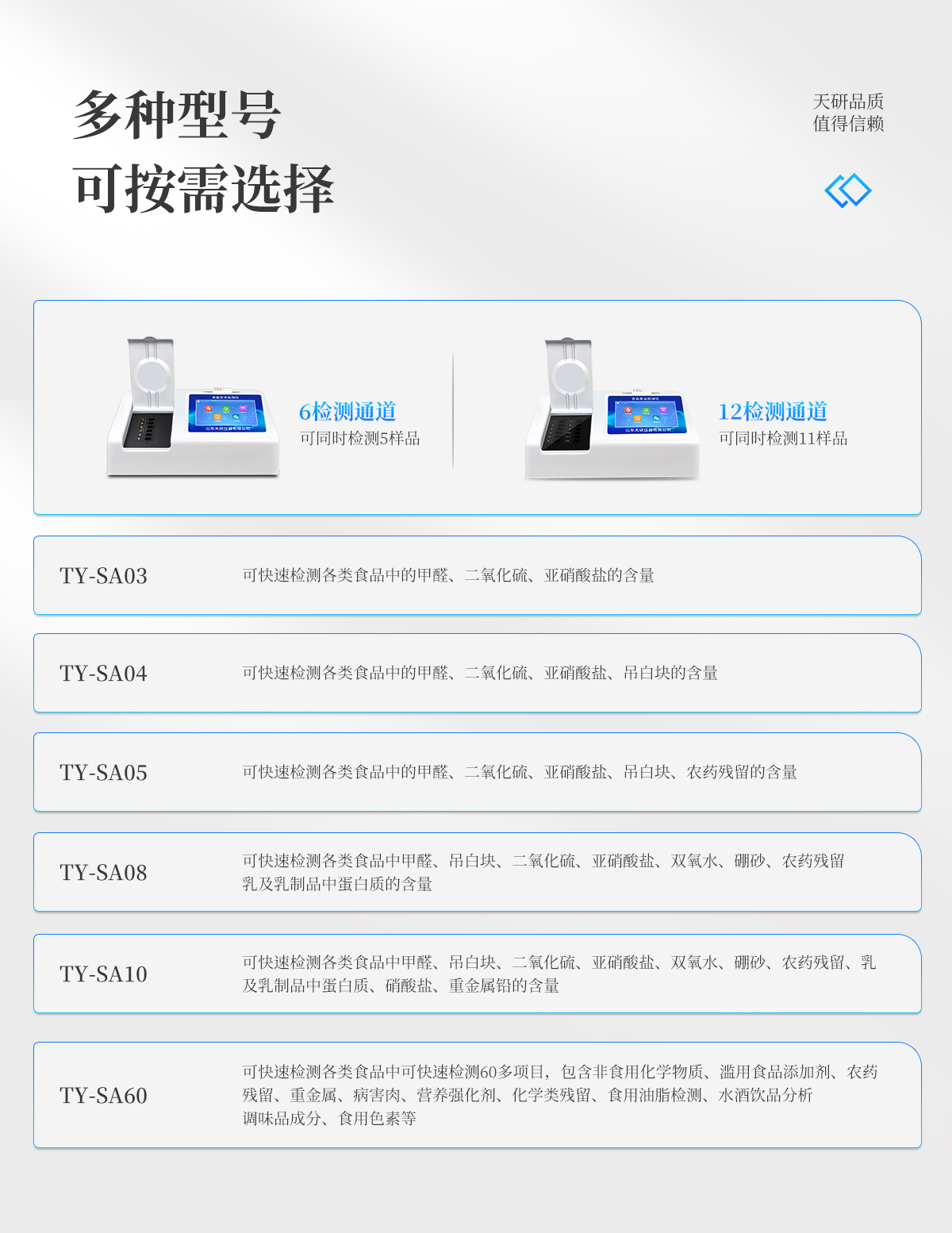 | 儀器采用臺式一體化系統(tǒng)檢測技術(shù),將分光光度模塊、新型農(nóng)殘檢測模塊、數(shù)字化管理模塊、無線通訊模塊高度集成于一體,支持檢測200種食品安全檢測項(xiàng)目,同時預(yù)留升級檢測方法。 | 儀器檢測模塊標(biāo)準(zhǔn)化、智能化,可隨意自由組合。檢測箱體內(nèi)置多個標(biāo)準(zhǔn)檢測單元,檢測模塊可以調(diào)整配置。 | 儀器采用全新安卓智能系統(tǒng),主控芯片采用 ARM Cortex-A7,RK3288/4核處理器,10.1寸高清液晶觸摸豎屏,更加**的UI交互界面,運(yùn)轉(zhuǎn)快捷;儀器配備無線通信模塊: 4G(APN)通訊模塊、Wifi模塊,藍(lán)牙傳輸,同時具有雙USB接口以及RJ45接口能以多種方式實(shí)現(xiàn)數(shù)據(jù)保存和數(shù)據(jù)傳輸功能。 | 創(chuàng)新檢測模式: | ★檢測通道:≥12通道;采用精密旋轉(zhuǎn)比色池設(shè)計,使用同芯片同光源校準(zhǔn)精度,解決不同光源之間的誤差值。1-12通道間誤差0.1%。(**號:ZL202022821055.2) | ★儀器具有自動識別比色皿檢測功能,即:將樣品比色皿放入儀器后,點(diǎn)擊樣品檢測,儀器自動識別比色皿進(jìn)行通道檢測。 | 進(jìn)口高精光源: | 高精度進(jìn)口四波長冷光源,通道配置 410、520、590、630nm 波長光源,一個光源芯片驅(qū)動一個光源,誤差極小,每臺設(shè)備單獨(dú)**校準(zhǔn)光源,**比對,同時參照四種不同波段光源全方位覆蓋市面上99%的農(nóng)殘食品項(xiàng)目檢測。 | 智能化操作系統(tǒng): | 便捷操作系統(tǒng):設(shè)備檢測時可在同一檢測界面自動對應(yīng)相關(guān)檢測通道一次性選擇1-12個樣品名稱,無須退出界面,節(jié)省操作時間。 | 數(shù)據(jù)集成系統(tǒng):設(shè)備首頁自動統(tǒng)計檢測數(shù)據(jù)包含:周檢測數(shù)據(jù)、月檢測數(shù)據(jù),全部檢測總數(shù)量,均包含檢測總數(shù),合格數(shù),不合格數(shù),以及相關(guān)柱形分析圖,對各項(xiàng)檢測數(shù)據(jù)清晰掌握,無需電腦查詢,更加快捷直觀。 | 項(xiàng)目預(yù)設(shè)系統(tǒng):支持添加單個及多個相同或不相同的任務(wù)預(yù)設(shè),一鍵快速調(diào)取,每一個任務(wù)分別可以設(shè)置不同的樣品、批次、編號、來源、備注、抽樣信息、檢測信息、受檢信息、復(fù)核信息等更多信息。無縫鏈接平臺和APP實(shí)時查看下發(fā)任務(wù)。 | 數(shù)據(jù)監(jiān)管系統(tǒng):同步對接監(jiān)管平臺,數(shù)據(jù)可局域網(wǎng)和互聯(lián)網(wǎng)數(shù)據(jù)上傳,檢測結(jié)果可選擇直接傳至食品安全監(jiān)管平臺。集成OSS輸出存儲服務(wù)、區(qū)分設(shè)備定向管理應(yīng)用,進(jìn)行區(qū)域食品安全監(jiān)管及大數(shù)據(jù)分析處理與數(shù)據(jù)統(tǒng)計,檢測區(qū)域食品安全長短期動態(tài),達(dá)到食品安全問題預(yù)估、預(yù)警。 | 自定義打印系統(tǒng):內(nèi)置全新打印系統(tǒng),新創(chuàng)自定義打印方式,可按需靈活設(shè)置開啟或關(guān)閉:產(chǎn)品合格證(國家農(nóng)業(yè)部標(biāo)準(zhǔn)要求),二維碼,抽樣信息、檢測信息,受檢信息、復(fù)核信息、抽樣日期、檢測日期等信息的打印。 | 系統(tǒng)遠(yuǎn)程更新功能:可定向分客戶分儀器更新系統(tǒng),按照不同客戶后期實(shí)際需求添加項(xiàng)目,無需機(jī)器返廠,即可遠(yuǎn)程實(shí)時升級全新系統(tǒng),節(jié)省時間成本及避免運(yùn)輸造成設(shè)備損壞。 | 儀器主機(jī)采用一體化防水、抗壓、防撞擊、防腐蝕箱體設(shè)計,同時配備交直流供電,可連接車載電源,可選配大容量充電鋰電池,滿足現(xiàn)場野外檢測需求。 | 安全證書,放心保障:儀器具有中國計量科學(xué)研究院校準(zhǔn)證書,**認(rèn)證。 |