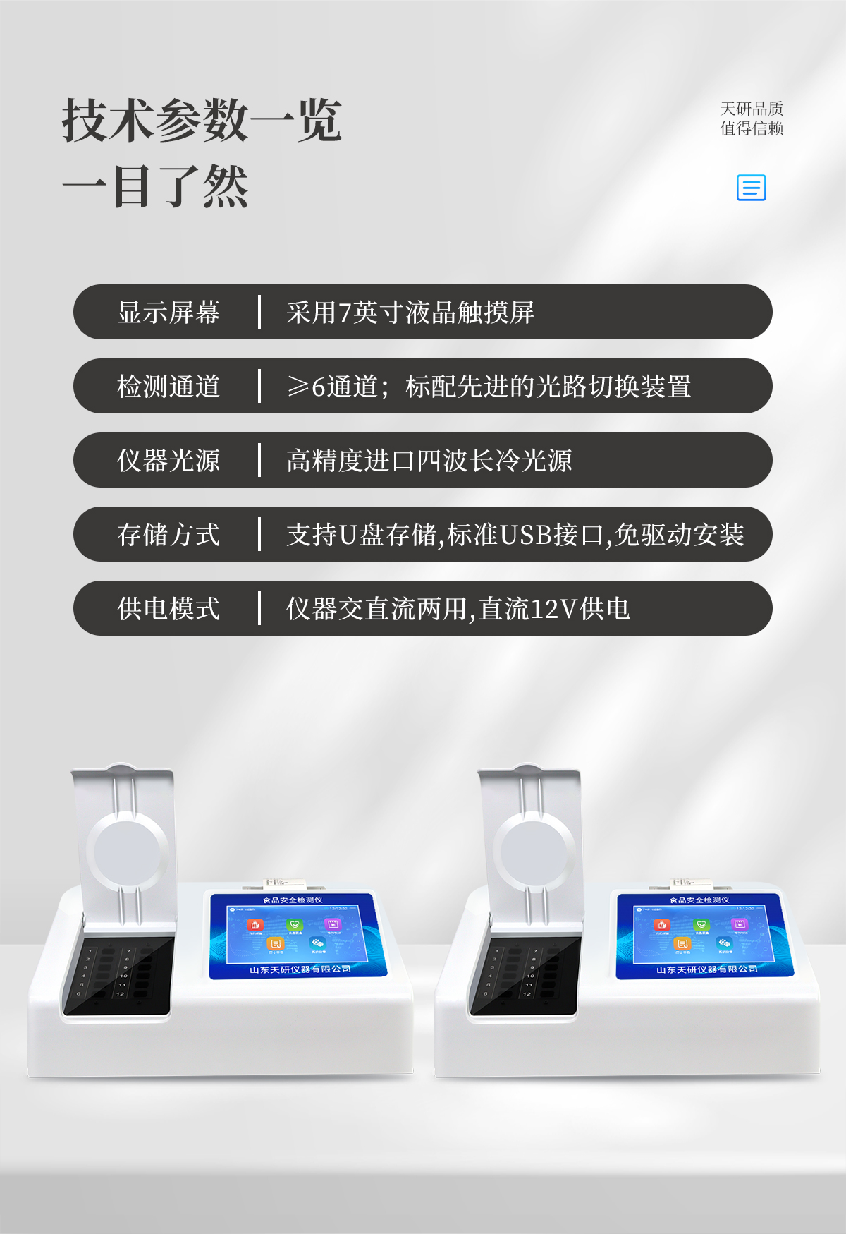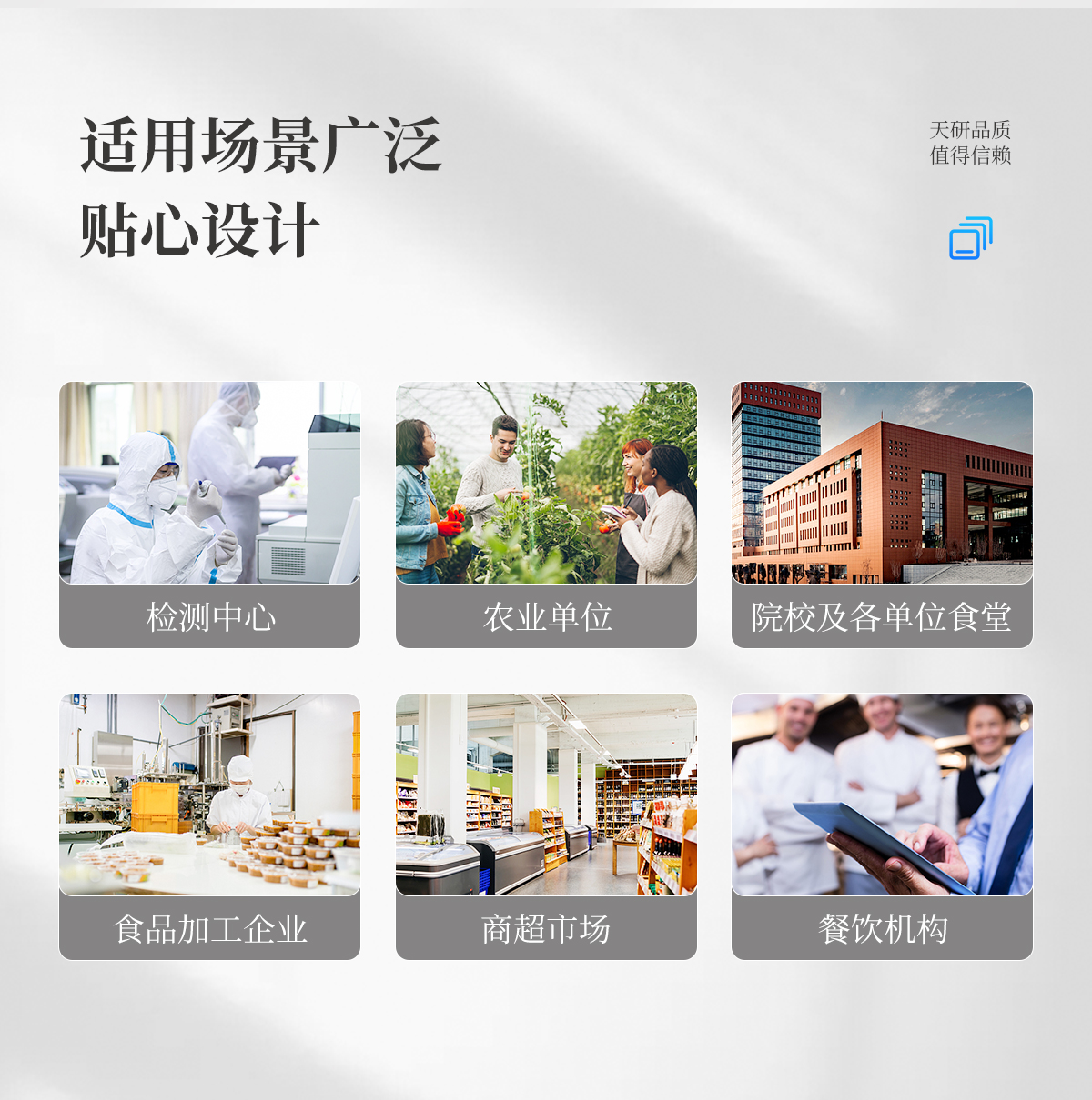 | 安卓智能操作系統(tǒng),采用更加**UI交互界面,儀器具有wifi聯(lián)網(wǎng)上傳、4G聯(lián)網(wǎng)傳輸、GPRS無線遠(yuǎn)傳、網(wǎng)線連接功能,快速批量上傳數(shù)據(jù)。 | 智能化程度高,儀器具有自檢功能:具有開機(jī)自檢和調(diào)零功能,具有自動檢測重復(fù)性功能。 | 新一代高速熱敏打印機(jī),檢測完成可自動打印或批量打印檢測報告和二維碼。 | 儀器帶有監(jiān)管平臺,數(shù)據(jù)可局域網(wǎng)和互聯(lián)網(wǎng)數(shù)據(jù)上傳,檢測結(jié)果直接傳至食品安全監(jiān)管平臺。進(jìn)行區(qū)域食品安全監(jiān)管及大數(shù)據(jù)分析處理與數(shù)據(jù)統(tǒng)計,檢測區(qū)域食品安全長短期動態(tài),達(dá)到食品安全問題預(yù)估、預(yù)警 | 一體化主機(jī),包含光電比色檢測模塊、膠體金免疫層析檢測模塊。 | 一體化便攜式快檢設(shè)備,滿足現(xiàn)場及流動檢測使用需求,能夠在同一軟件下實現(xiàn)所有檢測項目的檢測,并可通過同一窗口直觀顯示檢測結(jié)果。 | 膠體金模塊檢測方式:軌道式自動傳輸掃描,檢測完成后自動退出檢測卡。 | CT線自動識別,無需手動調(diào)整。 | 儀器具有多品類多種類樣品菜單庫,可靈活選擇檢測樣品,不同的檢測通道可同時檢測不同的樣品項目。也可在儀器上直接編輯錄入樣品名稱、檢測指標(biāo)、送檢單位等信息并保存進(jìn)樣品數(shù)據(jù)庫。 | 儀器內(nèi)置操作視頻,是您身邊的化驗指導(dǎo)專家。 | 樣品處理簡單省力,整體操作快速、安全、便捷。 | 儀器具有自身保護(hù)功能,可設(shè)置用戶名及密碼,防止非工作人員操作等。 | 高靈敏度,高檢測精度,高重復(fù)性精度,掃描式高精度光學(xué)傳感器。 | 儀器具有重新校準(zhǔn)、鎖定、恢復(fù)出廠設(shè)置功能。 | 結(jié)果判定線可修改,對照值標(biāo)定值可保存,斷電不丟失數(shù)據(jù)。 | 兼容市場上所有的膠體金卡,使用耗材不受限制,極大增強(qiáng)用戶使用體驗。 |