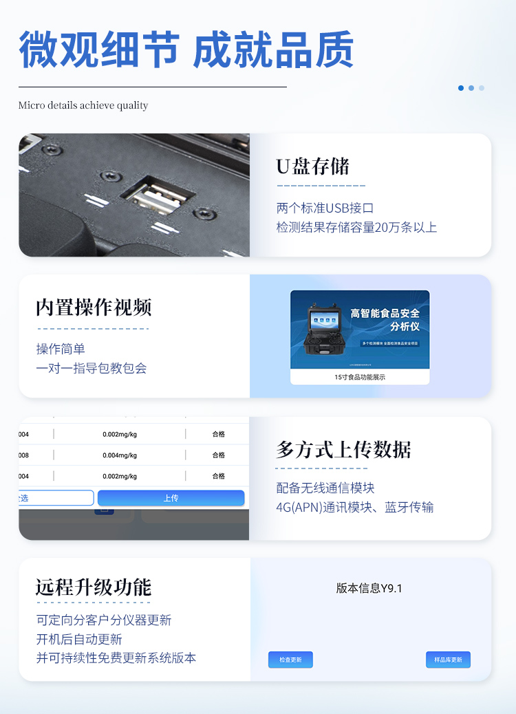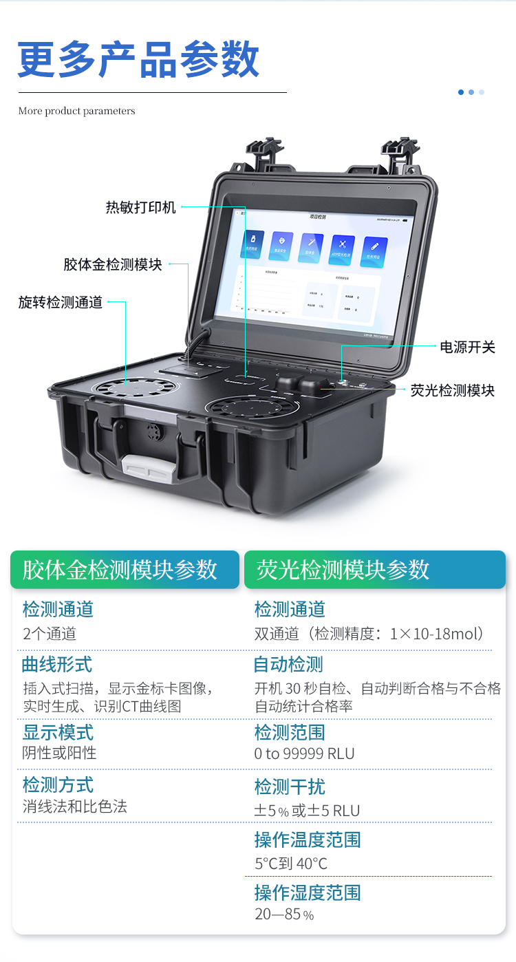 | 功能構(gòu)成:主要包括分光光度模塊、新型農(nóng)殘檢測模塊、膠體金檢測模塊、熒光檢測模塊、數(shù)字化管理模塊等,所有模塊集成一體,可快速檢測200多種食品安全項目,如獸藥殘留、農(nóng)藥殘留、非法添加劑、細(xì)菌數(shù)值等指標(biāo)。 | 檢測樣品種類:餐具及廚房用品、瓜果蔬菜及其制品、水產(chǎn)品及其制品、畜禽產(chǎn)品及其制品、嬰幼兒乳品及奶粉制品、蜂蜜、糧油及其制品、調(diào)味品(食醋、醬油、味精、鹽等)、酒類茶葉及其制品、食用菌、飲料、蛋類藥物殘留(雞蛋,鴨蛋等)、米豆面制品、糖果糕點類(小食品)、薯類及膨化食品、瓶(桶)裝飲用水、添加食用色素的食品、使用添加劑的食品、含有有毒有害物質(zhì)的相關(guān)食品。 | 顯示屏幕:儀器采用15.6英寸液晶觸摸屏顯,搭配運行安卓智能操作系統(tǒng),主控芯片采用ARM Cortex-A7,RK3288/4核處理器,主頻1.88Ghz,操作方便,性能更強(qiáng)。 | 供電模式:儀器交直流兩用,直流12V供電,可連接車載電源,配18ah大容量充電鋰電池,電量可實時顯示,無外部電源條件下可持續(xù)工作至少 4 小時。 | 檢測通道:≥24通道;采用精密旋轉(zhuǎn)比色池設(shè)計,使用同芯片同光源校準(zhǔn)精度,解決不同光源之間的誤差值,更加準(zhǔn)確**,采用高精度進(jìn)口四波長冷光源,每個通道均配置 410、520、590、630nm 波長光源,標(biāo)配**的光路切換裝置,**光路切換功能可實現(xiàn)64波長,并且所有檢測項目可實現(xiàn)所有通道同時檢測. | 通訊接口:配備無線通信模塊、4G(APN)通訊模塊、藍(lán)牙傳輸,同時具有雙USB接口以及RJ45網(wǎng)線接口,可以多方式實現(xiàn)數(shù)據(jù)保存及數(shù)據(jù)傳輸。 | 存儲方式:支持U盤存儲,兩個標(biāo)準(zhǔn)USB接口,免驅(qū)動安裝。檢測結(jié)果存儲容量20萬條以上,可生成Excel表格進(jìn)行拷貝,并具有登錄保護(hù)功能。 | 操作系統(tǒng):儀器可在同一檢測界面自動對應(yīng)相關(guān)檢測通道,一次性選擇不少于11個樣品名稱,無需退出界面,節(jié)省操作時間。并可以對每個通道屬性和樣品信息單獨進(jìn)行編輯,例如送檢單位、人員,檢測人員等,打印時勾選打印顯示。 | 數(shù)據(jù)集成系統(tǒng):設(shè)備首頁自動匯總分析檢測數(shù)據(jù),包含:周檢測數(shù)據(jù)、月檢測數(shù)據(jù),全部檢測總數(shù)量,包含檢測總數(shù),合格數(shù),不合格數(shù),以及相關(guān)柱形分析圖,各項檢測數(shù)據(jù)一目了然,無需電腦查詢,更加快捷直觀。 | 數(shù)據(jù)庫系統(tǒng):十幾項數(shù)據(jù)庫分類管理儀器:包含項目類型、項目數(shù)據(jù)、檢測數(shù)據(jù)、歷史記錄、國標(biāo)信息、曲線信息、采樣信息、檢測信息、受檢信息、復(fù)核信息、圖表信息、光源校準(zhǔn)信息、打印樣式信息、樣品庫信息等等,數(shù)據(jù)庫之間互相協(xié)調(diào)聯(lián)動保證數(shù)據(jù)的真實完整性。同時產(chǎn)品數(shù)據(jù)庫以及歷史檢測記錄支持一鍵檢索功能。 | 限量規(guī)判系統(tǒng):具有限量查詢、添加物質(zhì)合規(guī)判定系統(tǒng)。檢測出結(jié)果后,系統(tǒng)自動調(diào)用系統(tǒng)數(shù)據(jù)庫中相關(guān)國標(biāo)進(jìn)行比對判定,客觀顯示判定結(jié)果是否合格。 | 項目預(yù)設(shè)系統(tǒng):儀器具有任務(wù)預(yù)設(shè)模塊,一鍵提前預(yù)設(shè),給出方便快捷的新檢測方案,每一個任務(wù)分別可以設(shè)置不同的樣品、批次、編號、來源、備注、抽樣信息、檢測信息、受檢信息、復(fù)核信息等更多信息。樣品送檢時一鍵調(diào)取保存信息,并可多次調(diào)取,適用于大批量檢測業(yè)務(wù),可以大大提高檢測效率。 | 數(shù)據(jù)監(jiān)管系統(tǒng):同步對接監(jiān)管平臺,數(shù)據(jù)可局域網(wǎng)和互聯(lián)網(wǎng)數(shù)據(jù)上傳,檢測結(jié)果可直接傳至食品安全監(jiān)管平臺。進(jìn)行區(qū)域食品安全監(jiān)管及大數(shù)據(jù)分析處理與數(shù)據(jù)統(tǒng)計,監(jiān)測區(qū)域食品安全長短期動態(tài)及問題預(yù)估、預(yù)警 | 全新打印系統(tǒng):內(nèi)置全新打印機(jī),新創(chuàng)自定義打印方式,可按需靈活勾選控制:產(chǎn)品合格證(國家農(nóng)業(yè)部標(biāo)準(zhǔn)要求),二維碼,抽樣信息、檢測信息,受檢信息、復(fù)核信息、抽樣日期、檢測日期等信息的打印。 | A4紙版本報告打印功能:設(shè)備擁有兩種結(jié)果展示方式,可以自動生成A4打印模板和小票打印模板兩種樣式,可通過WiFi及網(wǎng)線等方式連接外置打印機(jī)可進(jìn)行打印。 | 膠體金檢測模塊:采用單通道CMOS成像處理技術(shù)及膠體金免疫層析技術(shù),可讀取膠體金卡數(shù)據(jù),自動采集、處理分析,將檢測結(jié)果顯示,并可根據(jù)參考限值自動判斷檢測結(jié)果,可檢測常見的獸藥殘留、生物毒素、抗生素、違禁添加物等。 | 可即時檢測單聯(lián)卡及三聯(lián)卡; | 檢測通道:2個通道; | 檢測方式:消線法和比色法; | 顯示模式:陰性或陽性; | 曲線形式:插入式掃描方式,顯示金標(biāo)卡圖像,實時生成、識別CT曲線圖,無需手動調(diào)整。兼容市場上其他金標(biāo)卡,使用耗材不受限制。 | 熒光檢測模塊:快速檢測水質(zhì)中微生物、固體物細(xì)菌含量。利用“熒光素酶—熒光素體系”快速檢測
