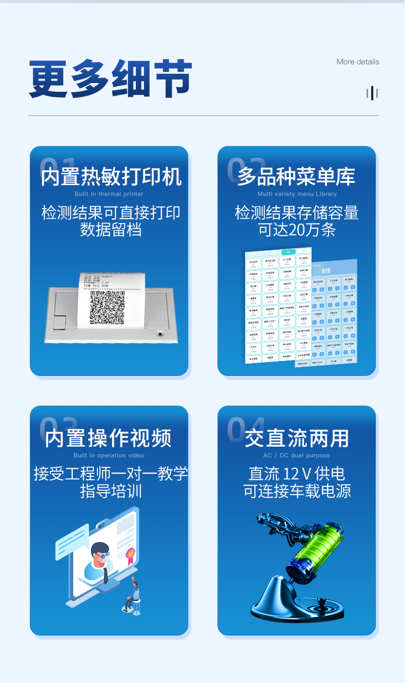 | 儀器采用10.1英寸液晶觸摸屏顯,搭配運行安卓智能操作系統(tǒng),主控芯片采用ARM Cortex-A7,RK3288/4核處理器,主頻1.88Ghz,運轉(zhuǎn)速度更快速,性能更強。 | 儀器功能包括:膠體金檢測模塊、數(shù)字化管理模塊、無線通訊模塊等,可以滿足同一軟件下實現(xiàn)所有檢測項目的檢測,并在同一窗口展示檢測結(jié)果。 | 一體化便攜式快檢設(shè)備,采用交直流兩用供電方式,可連接車載電源,配備6ah大容量充電鋰電池,可以滿足現(xiàn)場及流動檢測使用的需求。儀器尺寸:43×35×20cm, 主機凈重:5.1kg | 系統(tǒng)自帶數(shù)據(jù)集成模塊,設(shè)備首頁自動統(tǒng)計檢測數(shù)據(jù)包含:周檢測數(shù)據(jù)、月檢測數(shù)據(jù),全部檢測總數(shù)量,均包含檢測總數(shù),合格數(shù),不合格數(shù),以及相關(guān)柱形分析圖,對各項檢測數(shù)據(jù)清晰掌握,無需電腦查詢,更加快捷直觀。 | 儀器具有任務(wù)預(yù)設(shè)模塊,可在樣品送檢前提前預(yù)設(shè)樣品名稱、檢測指標、送檢單位等信息,樣品送檢時一鍵調(diào)取保存信息,檢測更加方便快捷。 | 膠體金檢測模塊:軌道式自動傳輸掃描方式,可實時顯示金標卡實時圖像,系統(tǒng)自動分析并呈現(xiàn)出CT曲線圖,CT線自動識別,無需手動調(diào)整,完成檢測后自動退出檢測卡。 結(jié)果判定線可修改,對照值標定值可保存,斷電不丟失數(shù)據(jù)。 兼容市場上其他膠體金卡,使用耗材不受限制,極大增強用戶使用體驗。 | 儀器檢測系統(tǒng)擁有龐大數(shù)據(jù)庫,并且構(gòu)建了完善的檢索、修訂功能。食品庫涵蓋多種樣品名稱,可按需添加或刪除、編輯樣品名稱;產(chǎn)品數(shù)據(jù)庫以及歷史檢測記錄支持一鍵檢索功能。 | 系統(tǒng)打印自定義化,打印格式多樣化,產(chǎn)品合格證(國家標準要求),二維碼,抽樣信息、檢測信息,受檢信息、復(fù)核信息、抽樣日期、檢測日期等信息結(jié)果,可按需求自行設(shè)置打印內(nèi)容。 | A4紙版本報告打印功能(可選配):設(shè)備擁有兩種結(jié)果展示方式,可以自動生成A4打印模板和小票打印模板兩種樣式,可通過WiFi及網(wǎng)線等方式鏈接外置打印機可進行打印 | 儀器具有 wifi 聯(lián)網(wǎng)上傳、RJ45網(wǎng)線連接功能,可以快速上傳數(shù)據(jù)。同步對接監(jiān)管平臺,數(shù)據(jù)可局域網(wǎng)和互聯(lián)網(wǎng)數(shù)據(jù)上傳,檢測結(jié)果直接傳至食品安全監(jiān)管平臺。進行區(qū)域食品安全監(jiān)管及大數(shù)據(jù)分析處理與數(shù)據(jù)統(tǒng)計,檢測區(qū)域食品安全長短期動態(tài),達到食品安全問題預(yù)估、預(yù)警。 | 設(shè)備支持U盤存儲,標準USB接口,免驅(qū)動安裝。檢測結(jié)果存儲容量20萬條以上,可生成Excel表格,進行一鍵拷貝,并具有登錄保護功能,可設(shè)置用戶名及密碼,規(guī)范不同人員操作權(quán)限,防止非工作人員操作,并且可以進行重新校準、鎖定、恢復(fù)出廠設(shè)置功能。儀器固件可升級,后期檢測項目可擴充。 | 儀器具備遠程升級功能,可定向分客戶分儀器更新,開機后自動更新,并可持續(xù)性免費更新系統(tǒng)版本,無需像傳統(tǒng)產(chǎn)品返廠更新,節(jié)省時間及人力成本并避免了物流運輸返廠升級導(dǎo)致設(shè)備損壞的潛在風(fēng)險。 |