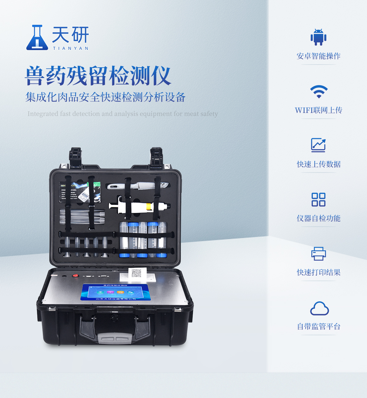 | 安卓智能操作系統(tǒng),采用更加**和人性化操作,儀器具有網(wǎng)線連接、wifi聯(lián)網(wǎng)上傳、4G無(wú)線遠(yuǎn)傳功能,快速上傳數(shù)據(jù)。 | 智能化程度高,儀器具有自檢功能:具有開機(jī)自檢和調(diào)零功能,具有自動(dòng)檢測(cè)重復(fù)性功能。 | 新一代高速熱敏打印機(jī),檢測(cè)完成可自動(dòng)打印檢測(cè)報(bào)告和二維碼。 | 儀器帶有監(jiān)管平臺(tái)。數(shù)據(jù)可局域網(wǎng)和互聯(lián)網(wǎng)數(shù)據(jù)上傳,檢測(cè)結(jié)果直接傳至食品安全監(jiān)管平臺(tái)。進(jìn)行區(qū)域食品安全監(jiān)管及大數(shù)據(jù)分析處理與數(shù)據(jù)統(tǒng)計(jì),檢測(cè)區(qū)域食品安全長(zhǎng)短期動(dòng)態(tài),達(dá)到食品安全問(wèn)題預(yù)估、預(yù)警。 | 一體化便攜式快檢設(shè)備,滿足現(xiàn)場(chǎng)及流動(dòng)檢測(cè)使用需求,能夠在同一軟件下實(shí)現(xiàn)所有檢測(cè)項(xiàng)目的檢測(cè),并可通過(guò)同一窗口直觀顯示檢測(cè)結(jié)果。 | 膠體金模塊檢測(cè)方式:軌道式自動(dòng)傳輸掃描,檢測(cè)完成后自動(dòng)退出檢測(cè)卡。 | CT線自動(dòng)識(shí)別,無(wú)需手動(dòng)調(diào)整。 | 儀器具有品類多種類樣品菜單庫(kù),可靈活選擇檢測(cè)樣品,不同的檢測(cè)通道可同時(shí)檢測(cè)不同的樣品項(xiàng)目。 | 樣品處理簡(jiǎn)單省力,整體操作快速、安全、便捷。 | 儀器具有自身保護(hù)功能,可設(shè)置用戶名及密碼,防止非工作人員操作等。 | 高靈敏度,高檢測(cè)精度,高重復(fù)性精度,掃描式高精度光學(xué)傳感器。 | 內(nèi)置強(qiáng)大的數(shù)據(jù)庫(kù),可在儀器上直接選擇樣品名稱、檢測(cè)指標(biāo)、送檢單位等信息,也可在儀器上直接編輯錄入樣品名稱、檢測(cè)指標(biāo)、送檢單位等信息并保存進(jìn)樣品數(shù)據(jù)庫(kù)。 | 儀器具有重新校準(zhǔn)、鎖定、恢復(fù)出廠設(shè)置功能。 | 支持U盤存儲(chǔ)。 結(jié)果判定線可修改,對(duì)照值標(biāo)定值可保存,斷電不丟失數(shù)據(jù)。 | 兼容市場(chǎng)上所有的膠體金卡,使用耗材不受限制,極大增強(qiáng)用戶使用體驗(yàn)。 |