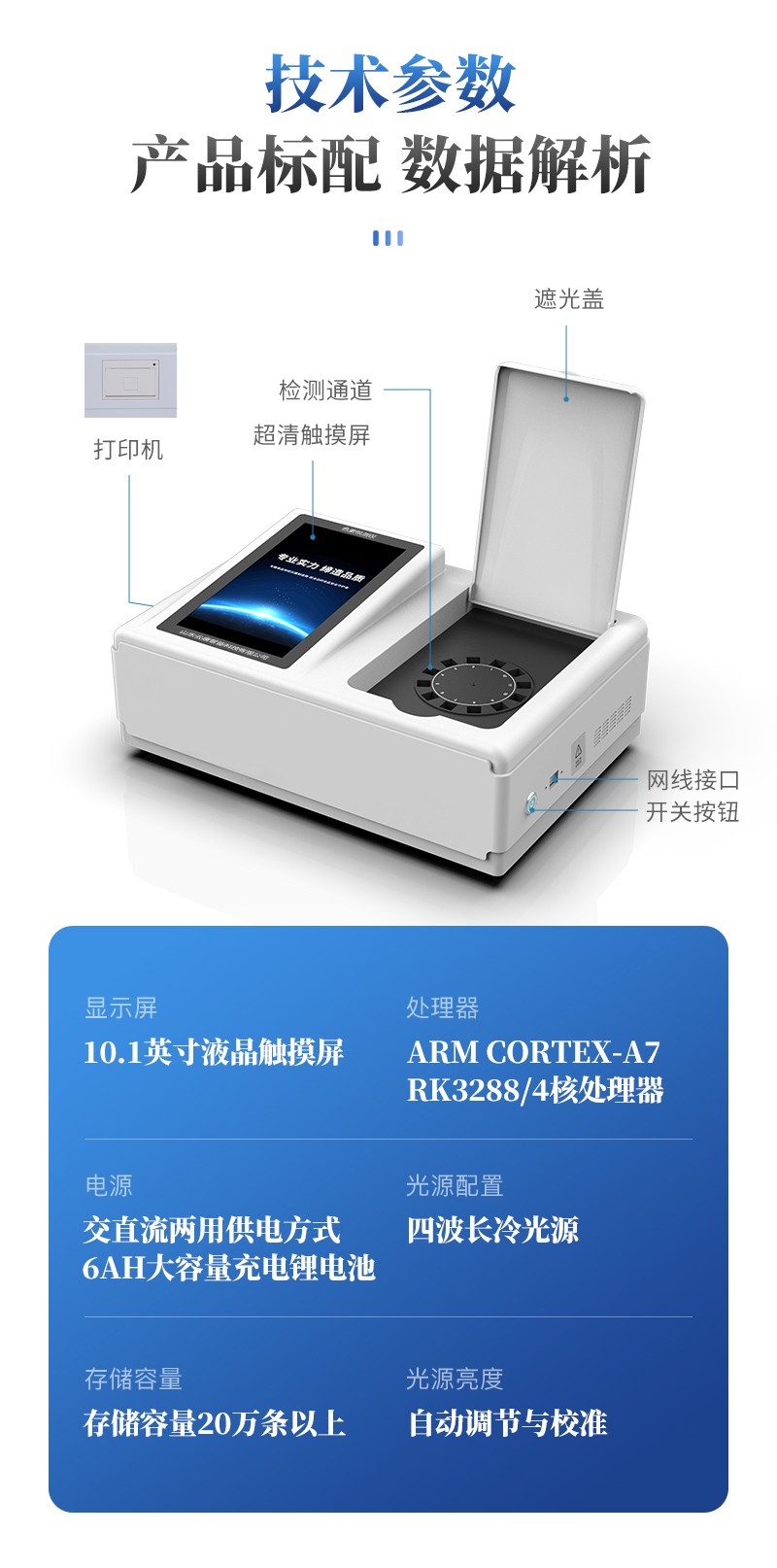 | 儀器采用臺(tái)式一體化系統(tǒng)檢測(cè)技術(shù),將分光光度模塊、新型農(nóng)殘檢測(cè)模塊、數(shù)字化管理模塊、無線通訊模塊高度集成于一體,支持檢測(cè)200種食品安全檢測(cè)項(xiàng)目,同時(shí)預(yù)留升級(jí)檢測(cè)方法。 | 儀器檢測(cè)模塊標(biāo)準(zhǔn)化、智能化,可隨意自由組合。檢測(cè)箱體內(nèi)置多個(gè)標(biāo)準(zhǔn)檢測(cè)單元,檢測(cè)模塊可以調(diào)整配置。 | 儀器采用全新安卓智能系統(tǒng),主控芯片采用 ARM Cortex-A7,RK3288/4核處理器,10.1寸高清液晶觸摸豎屏,更加**的UI交互界面,運(yùn)轉(zhuǎn)快捷;儀器配備無線通信模塊: 4G(APN)通訊模塊、Wifi模塊,藍(lán)牙傳輸,同時(shí)具有雙USB接口以及RJ45接口能以多種方式實(shí)現(xiàn)數(shù)據(jù)保存和數(shù)據(jù)傳輸功能。 | 創(chuàng)新檢測(cè)模式: | ★檢測(cè)通道:≥12通道;采用精密旋轉(zhuǎn)比色池設(shè)計(jì),使用同芯片同光源校準(zhǔn)精度,解決不同光源之間的誤差值。1-12通道間誤差0.1%。(**號(hào):ZL202022821055.2) | ★儀器具有自動(dòng)識(shí)別比色皿檢測(cè)功能,即:將樣品比色皿放入儀器后,點(diǎn)擊樣品檢測(cè),儀器自動(dòng)識(shí)別比色皿進(jìn)行通道檢測(cè)。 | 進(jìn)口高精光源: | 高精度進(jìn)口四波長(zhǎng)冷光源,通道配置 410、520、590、630nm 波長(zhǎng)光源,一個(gè)光源芯片驅(qū)動(dòng)一個(gè)光源,誤差極小,每臺(tái)設(shè)備單獨(dú)**校準(zhǔn)光源,**比對(duì),同時(shí)參照四種不同波段光源全方位覆蓋市面上99%的農(nóng)殘食品項(xiàng)目檢測(cè)。 | 智能化操作系統(tǒng): | 便捷操作系統(tǒng):設(shè)備檢測(cè)時(shí)可在同一檢測(cè)界面自動(dòng)對(duì)應(yīng)相關(guān)檢測(cè)通道一次性選擇1-12個(gè)樣品名稱,無須退出界面,節(jié)省操作時(shí)間。 | 數(shù)據(jù)集成系統(tǒng):設(shè)備首頁自動(dòng)統(tǒng)計(jì)檢測(cè)數(shù)據(jù)包含:周檢測(cè)數(shù)據(jù)、月檢測(cè)數(shù)據(jù),全部檢測(cè)總數(shù)量,均包含檢測(cè)總數(shù),合格數(shù),不合格數(shù),以及相關(guān)柱形分析圖,對(duì)各項(xiàng)檢測(cè)數(shù)據(jù)清晰掌握,無需電腦查詢,更加快捷直觀。 | 項(xiàng)目預(yù)設(shè)系統(tǒng):支持添加單個(gè)及多個(gè)相同或不相同的任務(wù)預(yù)設(shè),一鍵快速調(diào)取,每一個(gè)任務(wù)分別可以設(shè)置不同的樣品、批次、編號(hào)、來源、備注、抽樣信息、檢測(cè)信息、受檢信息、復(fù)核信息等更多信息。無縫鏈接平臺(tái)和APP實(shí)時(shí)查看下發(fā)任務(wù)。 | 數(shù)據(jù)監(jiān)管系統(tǒng):同步對(duì)接監(jiān)管平臺(tái),數(shù)據(jù)可局域網(wǎng)和互聯(lián)網(wǎng)數(shù)據(jù)上傳,檢測(cè)結(jié)果可選擇直接傳至食品安全監(jiān)管平臺(tái)。集成OSS輸出存儲(chǔ)服務(wù)、區(qū)分設(shè)備定向管理應(yīng)用,進(jìn)行區(qū)域食品安全監(jiān)管及大數(shù)據(jù)分析處理與數(shù)據(jù)統(tǒng)計(jì),檢測(cè)區(qū)域食品安全長(zhǎng)短期動(dòng)態(tài),達(dá)到食品安全問題預(yù)估、預(yù)警。 | 自定義打印系統(tǒng):內(nèi)置全新打印系統(tǒng),新創(chuàng)自定義打印方式,可按需靈活設(shè)置開啟或關(guān)閉:產(chǎn)品合格證(國(guó)家農(nóng)業(yè)部標(biāo)準(zhǔn)要求),二維碼,抽樣信息、檢測(cè)信息,受檢信息、復(fù)核信息、抽樣日期、檢測(cè)日期等信息的打印。 | 系統(tǒng)遠(yuǎn)程更新功能:可定向分客戶分儀器更新系統(tǒng),按照不同客戶后期實(shí)際需求添加項(xiàng)目,無需機(jī)器返廠,即可遠(yuǎn)程實(shí)時(shí)升級(jí)全新系統(tǒng),節(jié)省時(shí)間成本及避免運(yùn)輸造成設(shè)備損壞。 | 儀器主機(jī)采用一體化防水、抗壓、防撞擊、防腐蝕箱體設(shè)計(jì),同時(shí)配備交直流供電,可連接車載電源,可選配大容量充電鋰電池,滿足現(xiàn)場(chǎng)野外檢測(cè)需求。 | 安全證書,放心保障:儀器具有中國(guó)計(jì)量科學(xué)研究院校準(zhǔn)證書,**認(rèn)證。 |