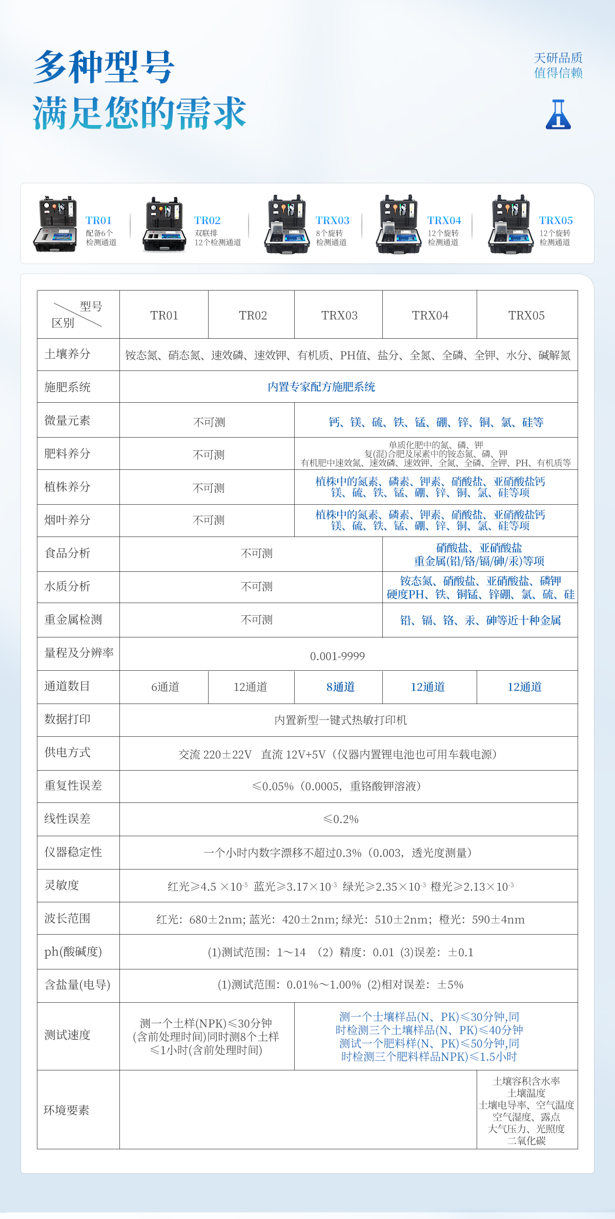 產(chǎn)品簡介:(新開發(fā),農(nóng)資經(jīng)銷商、農(nóng)技體系普及型)(新一代智能型,內置測土配方施肥功能,圖譜診斷,二維碼打印,數(shù)據(jù)上傳,及測試用到的所有配件,保證用戶只需提供純凈水即可完成氮磷鉀有機質pH含鹽量的準確測定?。┢放疲禾煅? 型號:TY-TR01產(chǎn)品簡介:配套齊全:該儀器集藥、器、儀為一體,攜帶方便,相當于一個