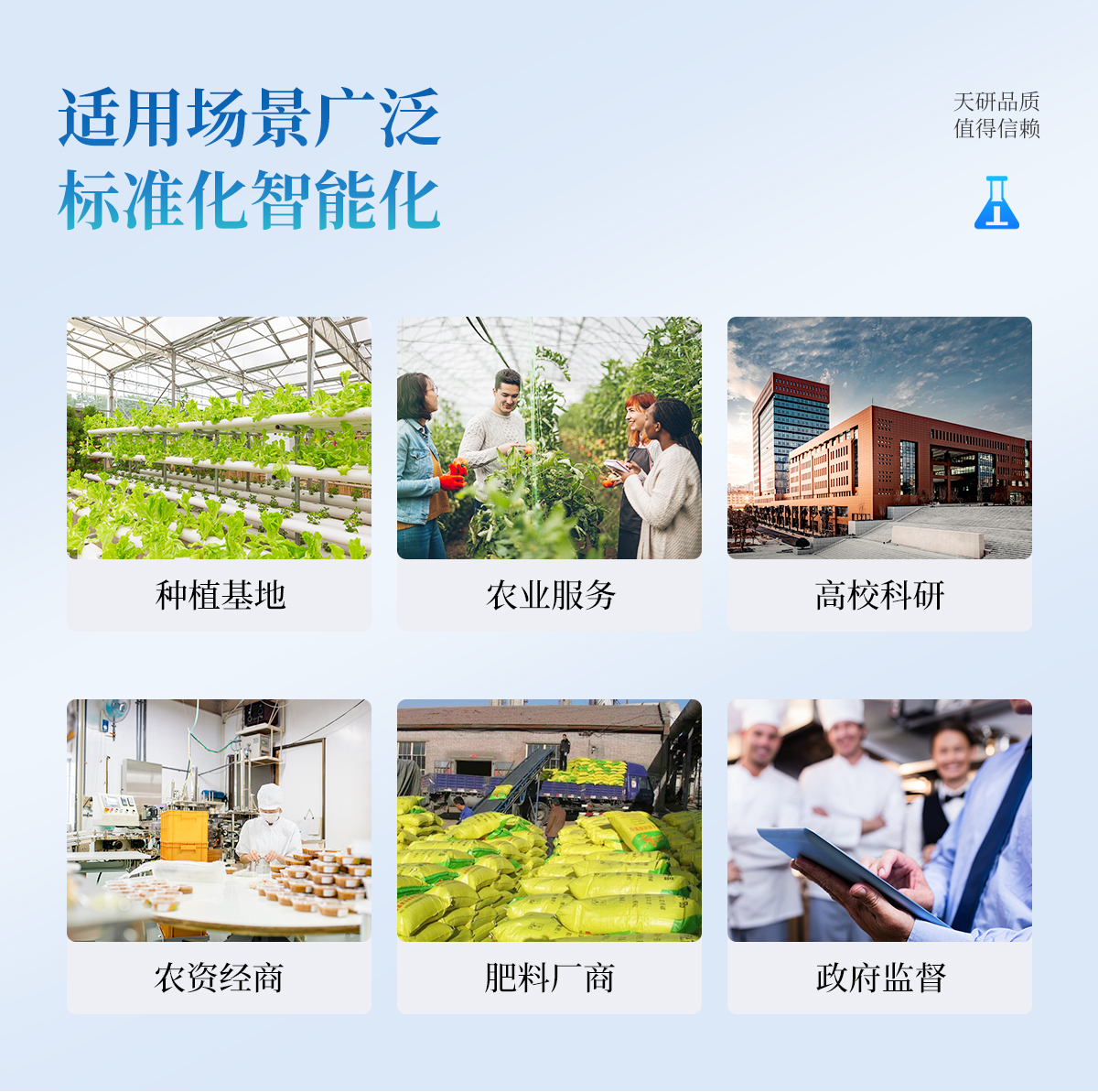 | 土壤養(yǎng)分:土壤銨態(tài)氮、土壤有效磷、土壤速效鉀、土壤硝態(tài)氮、土壤水解氮、土壤全氮、土壤全磷、土壤全鉀、土壤有機質(丘林法)、土壤有機質(浸提法)、土壤總有機碳、土壤碳氮比、PH值、含鹽量、水分。 | 土壤中微量元素:土壤鈣、土壤鎂、土壤硫、土壤硅、土壤硼、土壤鐵、土壤銅、土壤錳、土壤鋅、土壤氯、土壤鉬; | 土壤重金屬:土壤鉛、土壤砷、土壤鎘、土壤鉻、土壤汞、土壤鎳、土壤鋁、土壤氟、土壤鈦、土壤硒。 |