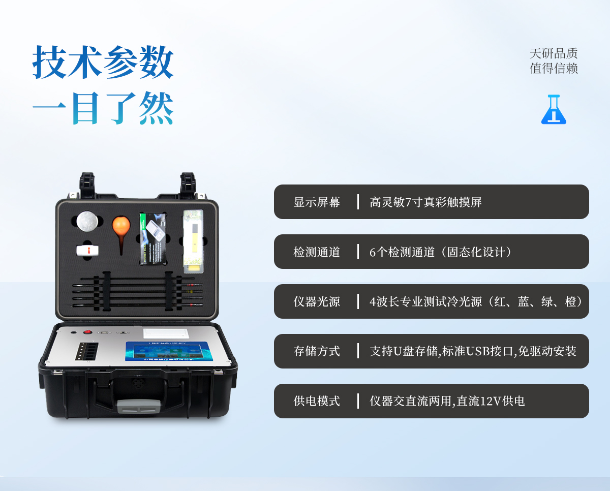 | 1、本儀器集各功能于一身,無需用戶自配附件,可靈活流動檢測。 | 2、安卓智能操作系統(tǒng),主控芯片采用ARM Cortex-A7,RK3288/4核處理器,主頻1.88Ghz,運轉速度更快速,穩(wěn)定性更強。 | 3、6個檢測通道(固態(tài)化設計),一次性可快速檢測6個樣品,極大提升檢測效率,降低檢測成本。 | 4、檢測過程中內置校準功能,智能恒流穩(wěn)壓,光強自動校準,確保檢測準確度。 | 5、內置作物專家施肥系統(tǒng),可對百余種全國農(nóng)業(yè)經(jīng)濟作物、果樹等的目標產(chǎn)量計算推薦施肥量,依據(jù)施肥配方科學指導農(nóng)業(yè)生產(chǎn)。測土配方施肥結果可打印,打印內容包含:作物種類、肥料種類、目標產(chǎn)量、需求總量、建議施肥方案。 | 6、儀器標配wifi無線上傳、4G聯(lián)網(wǎng)傳輸、GPRS無線遠傳功能,快速上傳數(shù)據(jù)。 | 7、儀器內置大容量內存,支持查看全部歷史檢測記錄,以及傳輸所有檢測數(shù)據(jù)。 | 8、配有智慧云農(nóng)業(yè)平臺,儀器連入無線網(wǎng)絡后,可將檢測數(shù)據(jù)可選擇性或批量無線上傳,方便用戶進行長期數(shù)據(jù)管理和可視化分析 | 9、儀器同時具有USB接口、以太網(wǎng)接口,并可隨時用U盤拷貝出數(shù)據(jù)。 | 10、可用手機隨時登錄云平臺在線移動查看歷史數(shù)據(jù) | 11、內置植物營養(yǎng)診斷標準圖譜,根據(jù)各農(nóng)作物營養(yǎng)缺失的圖片,進行葉面對比,診斷豐缺。 | 12、4波長專業(yè)測試冷光源(紅、藍、綠、橙),光源波長穩(wěn)定,長時間連續(xù)工作光源無溫漂現(xiàn)象,壽命長達10萬小時級別,重現(xiàn)性好,準確度高。 | 13、比色池部分采用標準1cm比色皿,無機械位移及磨損,光路測試定位**,有效屏蔽外光干擾,保證檢測結果優(yōu)于國標要求。 | 14、儀器系統(tǒng)內帶有樣品前處理操作視頻,各種樣品檢測方法點擊視頻模塊即可觀看,檢測人員無需自學說明書,指導教學方便快速,方便新手快速操作。 | 15、內置新一代高速熱敏打印機(無需色帶),打印內容包含:檢測單位、檢測人員、檢測項目、通道號、吸光度、養(yǎng)分含量(mg/kg)、檢測時間、以及二維碼等信息 | 16、高靈敏7寸真彩觸摸屏,采用更加**和人性化操作,高清晰高交互顯示,大程度降低傳統(tǒng)儀器的繁瑣操作和失誤。 | 17、內置時鐘功能,方便操作時間記錄,長期歷史追溯。 | 18、可設置多賬戶賬號密碼登錄,**UI交互界面,不同的用戶可自由添加編輯檢測信息,保存后可長期使用。 | 19、GPS功能:可在野外作業(yè)時記錄經(jīng)緯度地點,滿足特殊用戶需求。 | 20、內置低電壓提示功能,可在檢測時明確電量,避免測試數(shù)據(jù)偏移,同時具有斷電保護功能,斷電自動保存數(shù)據(jù),防止數(shù)據(jù)丟失。 | 21、交直流兩用供電方式,內置大容量充電鋰電池,滿電狀態(tài)下可連續(xù)工作10余小時,同時可外接車載電源蓄電。 | 22、儀器具有中英文切換功能,可滿足出口要求。 | 23、高強度PVC工程塑料手提箱設計,堅固耐用,便于攜帶。 |