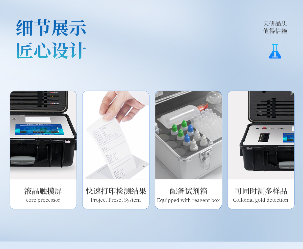 | 配套齊全:該儀器集藥、器、儀為一體,攜帶方便,相當于一個小型移動實驗室,無需用戶自配附件,亦可靈活野外流動測試。適于農(nóng)業(yè)服務部門或農(nóng)資經(jīng)銷商、合作社、肥料廠商、大種植戶測土施肥。 | 檢測功能全:測試項目國內外全面,除標配試劑外,其他各類藥劑均可加配選購。 | 操作簡便、速度快捷,配套整套附件及成品藥劑開瓶即用,無須配置。 |