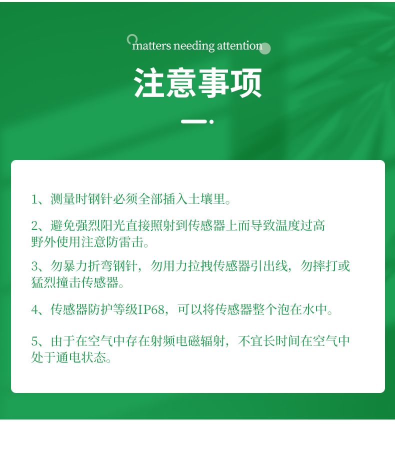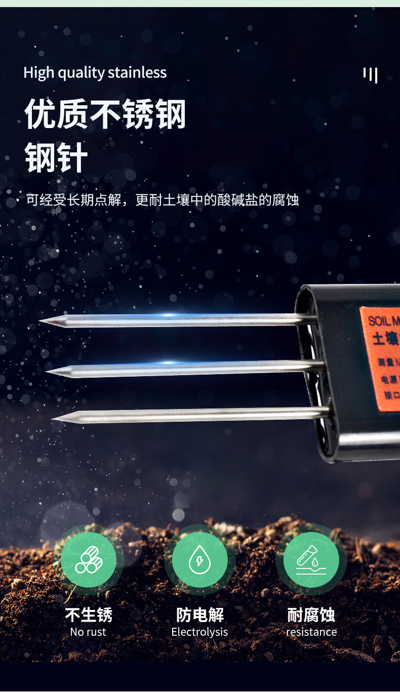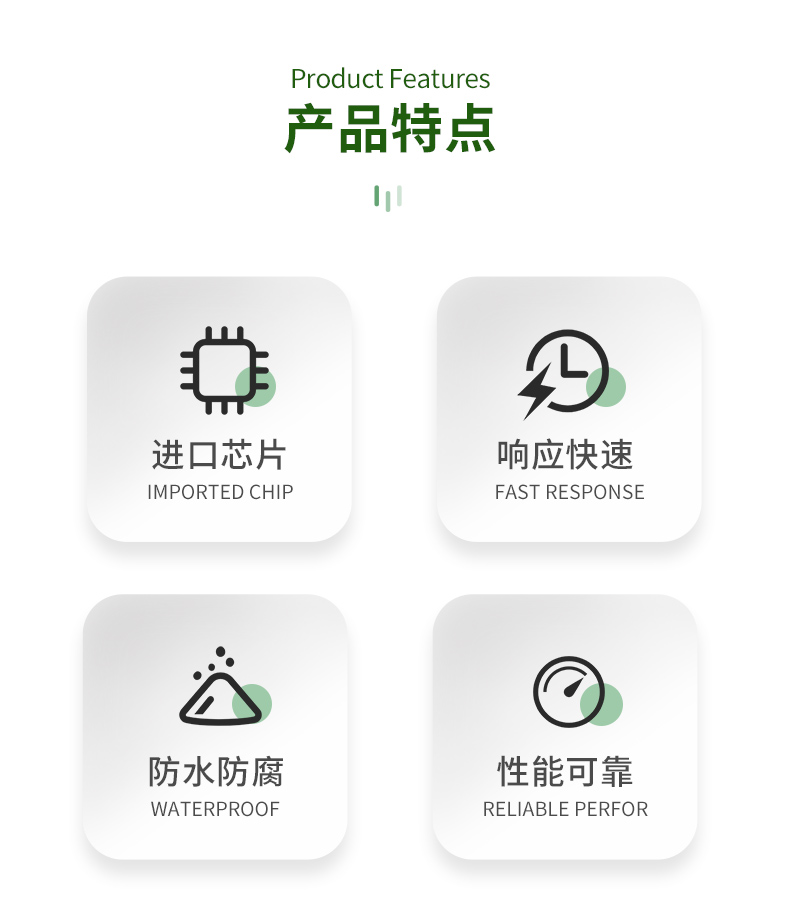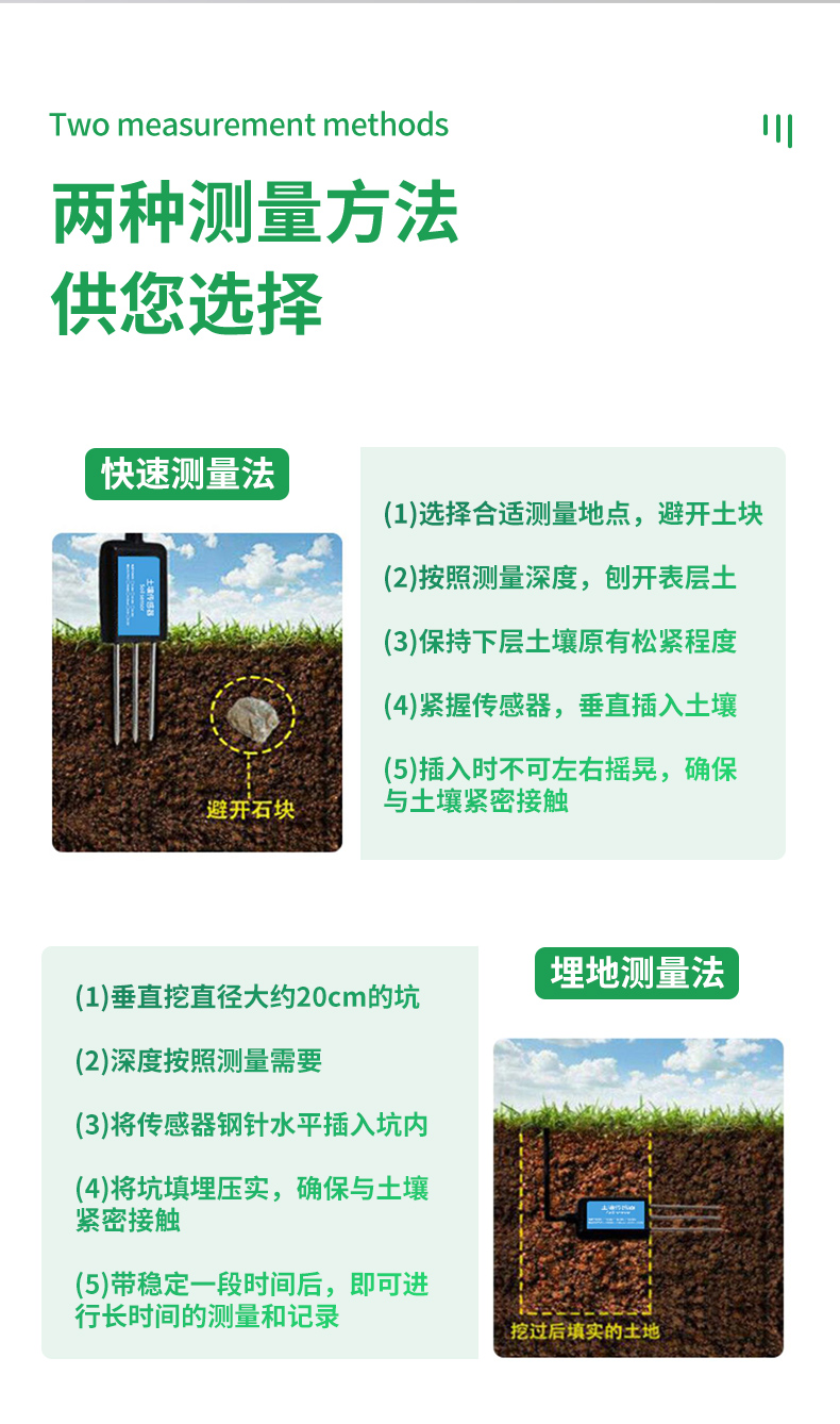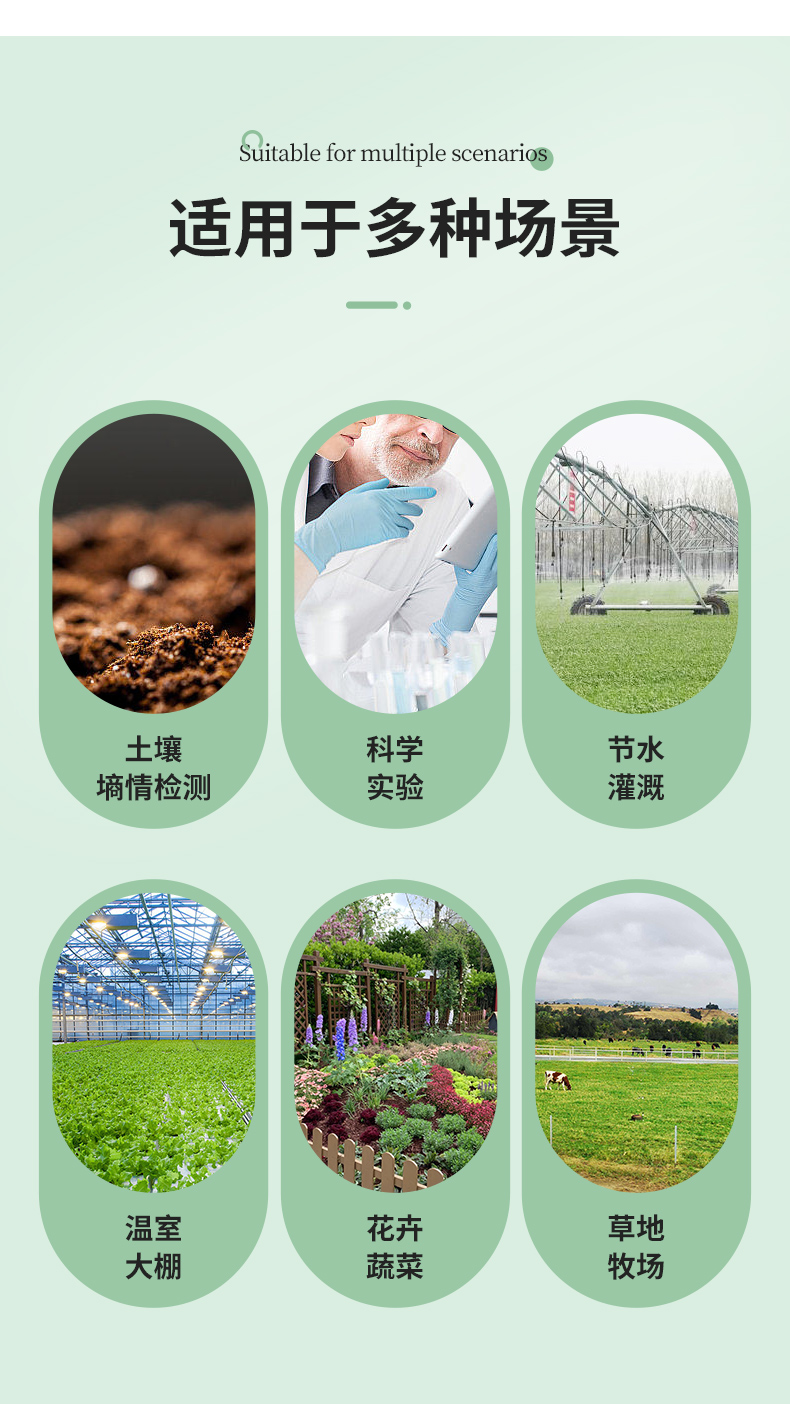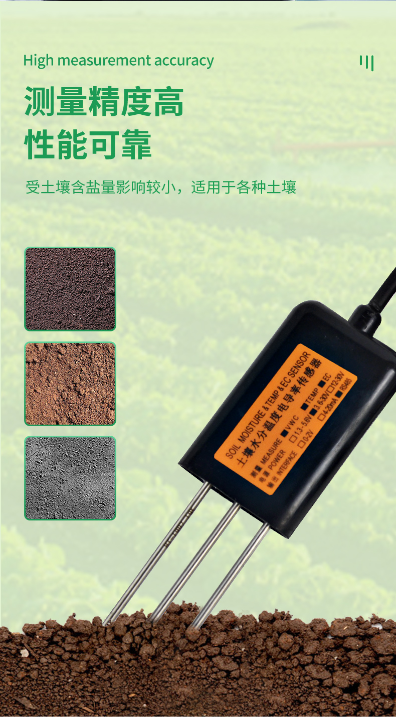 | (1)土壤含水率、電導率以及溫度三參數合一。 | (2)也可用于水肥一體溶液、以及其他營養(yǎng)液與基質的電導率。 | (3)電極采用特殊處理的合金材料,可承受較強的外力沖擊,不易損壞。 | (4)完全密封,耐酸堿腐蝕,可埋入土壤或直接投入水中進行長期動態(tài)檢測。 | (5)精度高,響應快,互換性好,探針插入式設計保證測量**,性能可靠。 | (6)完善的保護電路與多種信號輸出接口可選。 |
