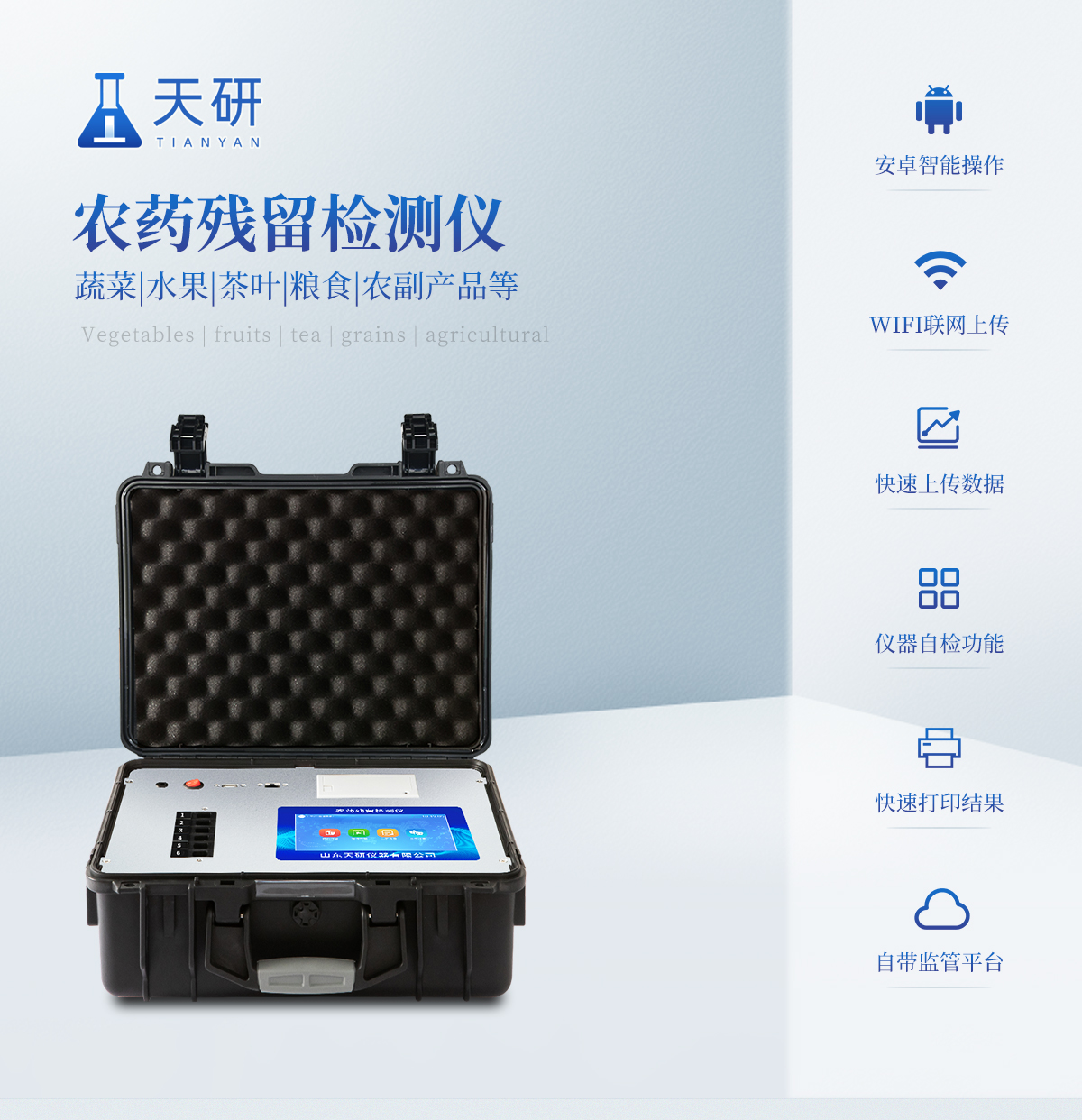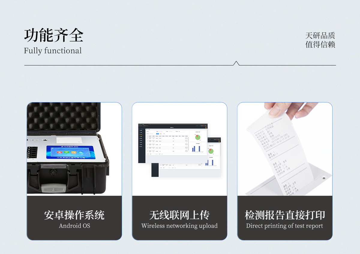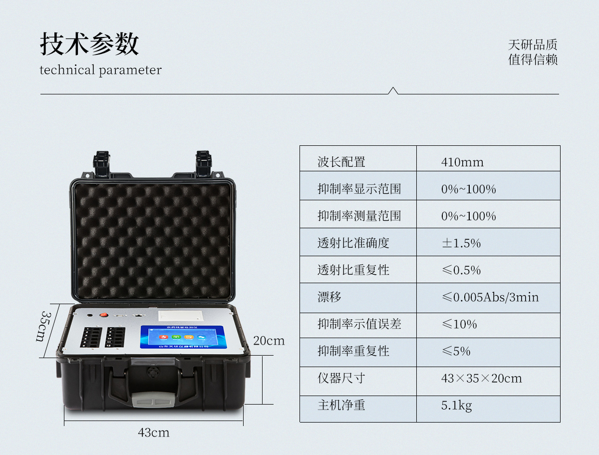 | 機(jī)箱采用工業(yè)級(jí)ABS工程塑料箱,方便攜帶,穩(wěn)固耐用,便于流動(dòng)測試。 | 智能操作系統(tǒng),采用更加人性化操作,主控采用多核處理器,主頻1.88Ghz,運(yùn)轉(zhuǎn)速度更快速,穩(wěn)定性更強(qiáng)。 | 自動(dòng)判斷樣品是否合格,檢測結(jié)果更加直觀。 | 儀器具有100多種蔬菜名稱菜單庫,分類管理,并可按需添加或刪除蔬菜名,編輯蔬菜名稱,可直接打印出蔬菜名稱。 | 檢測通道:12個(gè)檢測通道,可以同時(shí)測試多個(gè)樣品,循環(huán)檢測,即放即檢,每個(gè)樣品由程序控制分別獨(dú)立工作,不會(huì)互相干擾。 | 儀器具有wifi聯(lián)網(wǎng)功能,可將數(shù)據(jù)快速上傳電腦,進(jìn)行數(shù)據(jù)管理與統(tǒng)計(jì),4G信號(hào)GPRS遠(yuǎn)傳功能,可插手機(jī)卡實(shí)現(xiàn)數(shù)據(jù)遠(yuǎn)傳平臺(tái),。 | 顯示方式:7英寸高靈敏真彩觸摸屏顯示,人性化中文操作界面,讀數(shù)直觀、簡單。 | 打印機(jī)采用串口5v打印,可選擇手動(dòng)打印或者自動(dòng)打印,三分鐘出打印結(jié)果,打印格式為檢測人姓名、吸光度差值、檢測時(shí)間、檢測機(jī)構(gòu)、樣品名稱及結(jié)果判定。 | 光源采用進(jìn)口超高亮發(fā)光二極管,具有低功耗、高精度、穩(wěn)定性強(qiáng)、光源可控可以關(guān)掉不使用的光源,響應(yīng)速度快等優(yōu)點(diǎn)。 | 智能恒流穩(wěn)壓,光強(qiáng)自動(dòng)校準(zhǔn),長時(shí)間連續(xù)工作光源無溫漂現(xiàn)象。 | 采用USB2.0接口設(shè)計(jì),方便數(shù)據(jù)的存貯和移動(dòng),并可隨時(shí)與計(jì)算機(jī)直接相連,并且可用計(jì)算機(jī)控制儀器。實(shí)現(xiàn)數(shù)據(jù)查詢、瀏覽、分析、統(tǒng)計(jì)、打印等。 | 智能化程度高,儀器具有自檢功能:具有開機(jī)自檢和調(diào)零功能,具有自動(dòng)檢測重復(fù)性功能 | 儀器具有自身保護(hù)功能,可設(shè)置用戶名及密碼,防止非工作人員操作等。 | 采用DC12v直流供電,安全系統(tǒng)更高,并且配備6A鋰電池充電器。 | 儀器具有重新校準(zhǔn)、鎖定、恢復(fù)出廠設(shè)置功能。 |