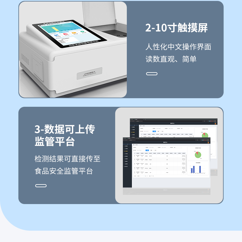 | 儀器采用臺式一體化系統(tǒng)檢測技術(shù),將分光光度模塊、新型農(nóng)殘檢測模塊、數(shù)字化管理模塊、無線通訊模塊高度集成于一體,支持檢測200種食品安全檢測項(xiàng)目,同時預(yù)留升級檢測方法。 | 儀器檢測模塊標(biāo)準(zhǔn)化、智能化,可隨意自由組合。檢測箱體內(nèi)置多個標(biāo)準(zhǔn)檢測單元,檢測模塊可以調(diào)整配置。 | 儀器采用全新安卓智能系統(tǒng),主控芯片采用 ARM Cortex-A7,RK3288/4核處理器,10.1寸高清液晶觸摸豎屏,更加**的UI交互界面,運(yùn)轉(zhuǎn)快捷;儀器配備無線通信模塊: 4G(APN)通訊模塊、Wifi模塊,藍(lán)牙傳輸,同時具有雙USB接口以及RJ45接口能以多種方式實(shí)現(xiàn)數(shù)據(jù)保存和數(shù)據(jù)傳輸功能。 | 創(chuàng)新檢測模式: | ★檢測通道:≥12通道;采用精密旋轉(zhuǎn)比色池設(shè)計(jì),使用同芯片同光源校準(zhǔn)精度,解決不同光源之間的誤差值。1-12通道間誤差0.1%。(**號:ZL202022821055.2) | ★儀器具有自動識別比色皿檢測功能,即:將樣品比色皿放入儀器后,點(diǎn)擊樣品檢測,儀器自動識別比色皿進(jìn)行通道檢測。 | 進(jìn)口高精光源: | 高精度進(jìn)口四波長冷光源,通道配置 410、520、590、630nm 波長光源,一個光源芯片驅(qū)動一個光源,誤差極小,每臺設(shè)備單獨(dú)**校準(zhǔn)光源,**比對,同時參照四種不同波段光源全方位覆蓋市面上99%的農(nóng)殘食品項(xiàng)目檢測。 | 智能化操作系統(tǒng): | 便捷操作系統(tǒng):設(shè)備檢測時可在同一檢測界面自動對應(yīng)相關(guān)檢測通道一次性選擇1-12個樣品名稱,無須退出界面,節(jié)省操作時間。 | 數(shù)據(jù)集成系統(tǒng):設(shè)備首頁自動統(tǒng)計(jì)檢測數(shù)據(jù)包含:周檢測數(shù)據(jù)、月檢測數(shù)據(jù),全部檢測總數(shù)量,均包含檢測總數(shù),合格數(shù),不合格數(shù),以及相關(guān)柱形分析圖,對各項(xiàng)檢測數(shù)據(jù)清晰掌握,無需電腦查詢,更加快捷直觀。 | 項(xiàng)目預(yù)設(shè)系統(tǒng):支持添加單個及多個相同或不相同的任務(wù)預(yù)設(shè),一鍵快速調(diào)取,每一個任務(wù)分別可以設(shè)置不同的樣品、批次、編號、來源、備注、抽樣信息、檢測信息、受檢信息、復(fù)核信息等更多信息。無縫鏈接平臺和APP實(shí)時查看下發(fā)任務(wù)。 | 數(shù)據(jù)監(jiān)管系統(tǒng):同步對接監(jiān)管平臺,數(shù)據(jù)可局域網(wǎng)和互聯(lián)網(wǎng)數(shù)據(jù)上傳,檢測結(jié)果可選擇直接傳至食品安全監(jiān)管平臺。集成OSS輸出存儲服務(wù)、區(qū)分設(shè)備定向管理應(yīng)用,進(jìn)行區(qū)域食品安全監(jiān)管及大數(shù)據(jù)分析處理與數(shù)據(jù)統(tǒng)計(jì),檢測區(qū)域食品安全長短期動態(tài),達(dá)到食品安全問題預(yù)估、預(yù)警。 | 自定義打印系統(tǒng):內(nèi)置全新打印系統(tǒng),新創(chuàng)自定義打印方式,可按需靈活設(shè)置開啟或關(guān)閉:產(chǎn)品合格證(國家農(nóng)業(yè)部標(biāo)準(zhǔn)要求),二維碼,抽樣信息、檢測信息,受檢信息、復(fù)核信息、抽樣日期、檢測日期等信息的打印。 | 系統(tǒng)遠(yuǎn)程更新功能:可定向分客戶分儀器更新系統(tǒng),按照不同客戶后期實(shí)際需求添加項(xiàng)目,無需機(jī)器返廠,即可遠(yuǎn)程實(shí)時升級全新系統(tǒng),節(jié)省時間成本及避免運(yùn)輸造成設(shè)備損壞。 | 儀器主機(jī)采用一體化防水、抗壓、防撞擊、防腐蝕箱體設(shè)計(jì),同時配備交直流供電,可連接車載電源,可選配大容量充電鋰電池,滿足現(xiàn)場野外檢測需求。 | 安全證書,放心保障:儀器具有中國計(jì)量科學(xué)研究院校準(zhǔn)證書,**認(rèn)證。 |