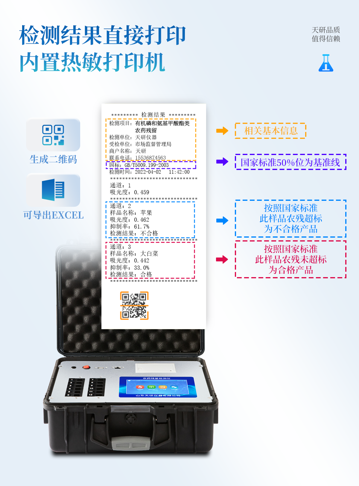 | 隨著人民生活水平的不斷提升,市場(chǎng)對(duì)茶葉的把控愈加嚴(yán)格。針對(duì)現(xiàn)狀,我司專(zhuān)門(mén)研發(fā)生產(chǎn)--茶葉專(zhuān)用的農(nóng)藥殘留速測(cè)儀;定位茶農(nóng)、茶商、茶葉企業(yè)使用。 此外還可用于果蔬茶生產(chǎn)基地和農(nóng)貿(mào)批發(fā)銷(xiāo)售市場(chǎng)現(xiàn)場(chǎng)檢測(cè),餐館、學(xué)校、食堂、家庭果蔬加工前的安全速測(cè)等。 | 檢測(cè)通道: 5個(gè)檢測(cè)通道,可以同時(shí)測(cè)試多個(gè)樣品,每個(gè)樣品由程序控制分別獨(dú)立工作,不會(huì)互相干擾。 | 顯示方式:≥5英寸液晶觸摸屏顯示,人性化中文操作界面,讀數(shù)直觀(guān)、簡(jiǎn)單。 | 配備嵌入式高速熱敏打印機(jī),可選擇手動(dòng)打印或者自動(dòng)打印,三分鐘出打印結(jié)果。 | 光源采用進(jìn)口超高亮發(fā)光二極管,具有低功耗、穩(wěn)定性強(qiáng)、高靈敏度,高檢測(cè)精度,高重復(fù)性精度,光源可控、響應(yīng)速度快等優(yōu)點(diǎn)。 | 采用標(biāo)準(zhǔn)USB接口設(shè)計(jì),免驅(qū)動(dòng)安裝,方便數(shù)據(jù)的存貯和移動(dòng),并可隨時(shí)與計(jì)算機(jī)直接相連,并且可用計(jì)算機(jī)控制儀器。實(shí)現(xiàn)數(shù)據(jù)查詢(xún)、瀏覽、分析、統(tǒng)計(jì)、打印等。 | 智能化程度高,儀器具有自檢功能:具有開(kāi)機(jī)自檢和調(diào)零功能,具有自動(dòng)檢測(cè)重復(fù)性功能 | 內(nèi)置強(qiáng)大的數(shù)據(jù)庫(kù),可在儀器上直接選擇樣品名稱(chēng)、檢測(cè)指標(biāo)、送檢單位等信息,也可在儀器上直接編輯錄入樣品名稱(chēng)、檢測(cè)指標(biāo)、送檢單位等信息并保存進(jìn)樣品數(shù)據(jù)庫(kù)。 | 支持Wifi網(wǎng)絡(luò),數(shù)據(jù)可局域網(wǎng)和互聯(lián)網(wǎng)數(shù)據(jù)上傳,檢測(cè)結(jié)果直接傳至食品安全監(jiān)管平臺(tái)。進(jìn)行區(qū)域食品安全監(jiān)管及大數(shù)據(jù)分析處理,檢測(cè)區(qū)域食品安全長(zhǎng)短期動(dòng)態(tài),達(dá)到食品安全問(wèn)題預(yù)估、預(yù)警 |