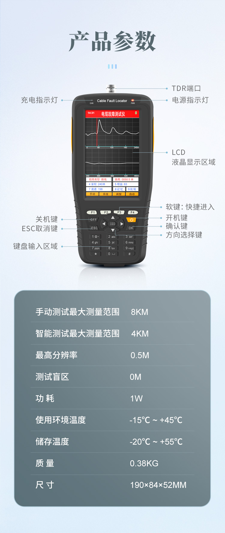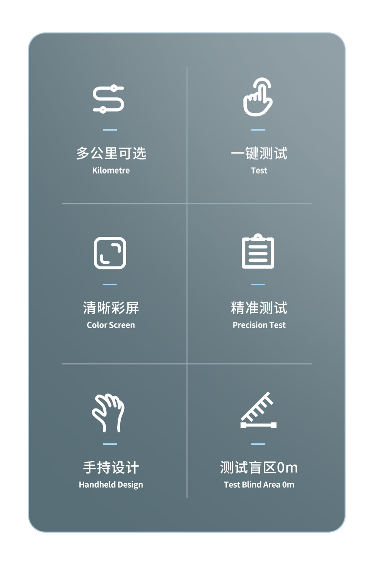 | 手動(dòng)測試最大測量范圍 8Km | 智能測試最大測量范圍 4Km | **分辨率 0.5m | 測試盲區(qū) 0m | 功耗 1W | 質(zhì)量 0.38KG | 體積 190×84×52mm3 | 使用環(huán)境溫度 -15℃ ~ +45℃ | 儲存溫度 -20℃ ~ +55℃ |
