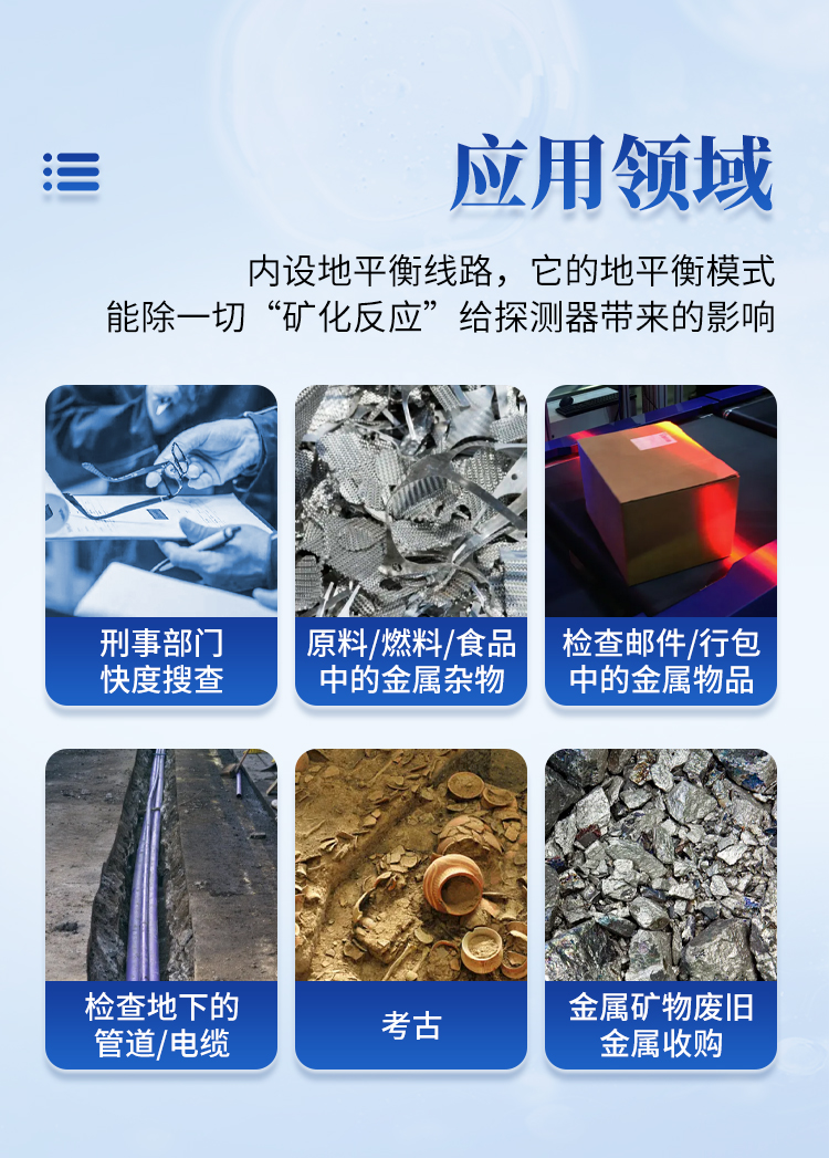 | (1)公安刑事部門快度搜查 | (2)檢測(cè)原料、燃料、食品中的 金屬雜物 | (3)檢查郵件、行包中的金屬物品 | (4)檢查地下的管道、電纜 | (5)考古 | (6)發(fā)現(xiàn)隱埋在地下的金銀寶物和金屬礦物廢舊金屬收購(gòu) |