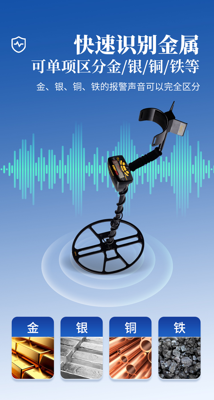 | ●探測(cè)盤:全新配置一款15存“DD”防水探測(cè)盤,可以擴(kuò)大該儀器的探測(cè)范圍 | ●識(shí)別能力:可以單項(xiàng)區(qū)分金,銀,銅,鐵等 | ●聲音識(shí)別能力:金、銀、銅、鐵的報(bào)警聲音可以完全區(qū)分 | ●高靈敏度:提高了更強(qiáng)的探測(cè)靈敏度,增加機(jī)器的探測(cè)深度 | ●耳機(jī):配置一個(gè)原廠配置的高清耳機(jī) | ●定位: 可以快速的定位地下金屬的準(zhǔn)確位置 | ●接收/拒絕:通過(guò)識(shí)別按鈕可以進(jìn)行單項(xiàng)選擇探測(cè),例如:選擇黃金,該儀器只對(duì)黃金進(jìn)行報(bào)警 | ●硬幣深度顯示:在主機(jī)的右側(cè)有個(gè)顯示小金屬的深度 | ●電量狀況顯示: 可以顯示電源現(xiàn)有的電量 | ●定位按鈕: 可以精準(zhǔn)定位金屬的位置 | ●五種探測(cè)模式: 可以選擇默認(rèn)探測(cè)模式,也可以自定義探測(cè)模式 | 珠寶模式(可以刪除鐵,找到細(xì)小的金屬,比如戒指,耳環(huán),項(xiàng)鏈等) | 自定義模式(可以單項(xiàng)選擇性探測(cè),選擇自己想要探測(cè)的金屬類型) | 遺跡模式(可以將鐵刪除,只探測(cè)有色金屬提高地下金屬探測(cè)效率) | 硬幣模式(這種識(shí)別模式的目的是排除酸性垃圾,許多拉環(huán)和標(biāo)簽紙檢) | 全金屬模式(可以探測(cè)所有的金屬、金、銀、銅、鐵等) |