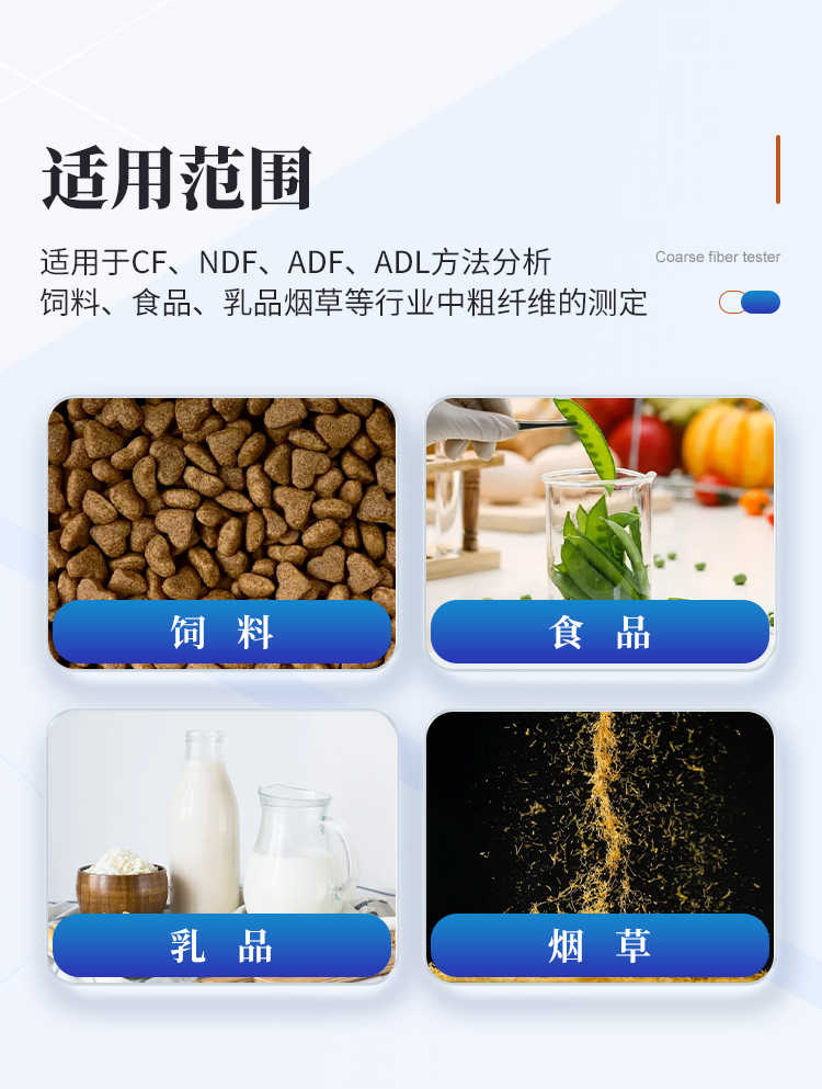 適用于CF、NDF、ADF、ADL方法分析飼料、食品、乳品煙草等行業(yè)中粗纖維的測(cè)定。