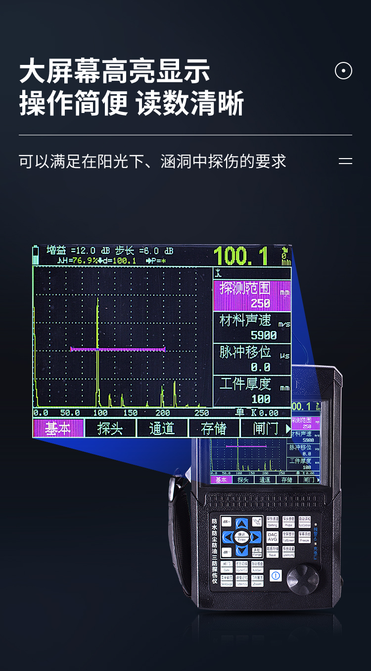 | ● 鋰電池供電,工作時間8小時; | ● 堅固耐用,防水防塵,抗干擾能力好; | ● 大屏幕高亮顯示,可以適合在陽光下、涵洞中探傷的要求; | ● 閘 門: 進波門、失波門; | ● 單閘門讀數、雙閘門讀數; | ● 內置USB接口,插入SD卡,可探傷過程錄像; | ● 報 警: 蜂鳴報警,LED 燈報警; | ● 具有防水、防油、防塵三防功能,使用壽命延長,是常規(guī)探傷儀使用壽命的幾倍。 |