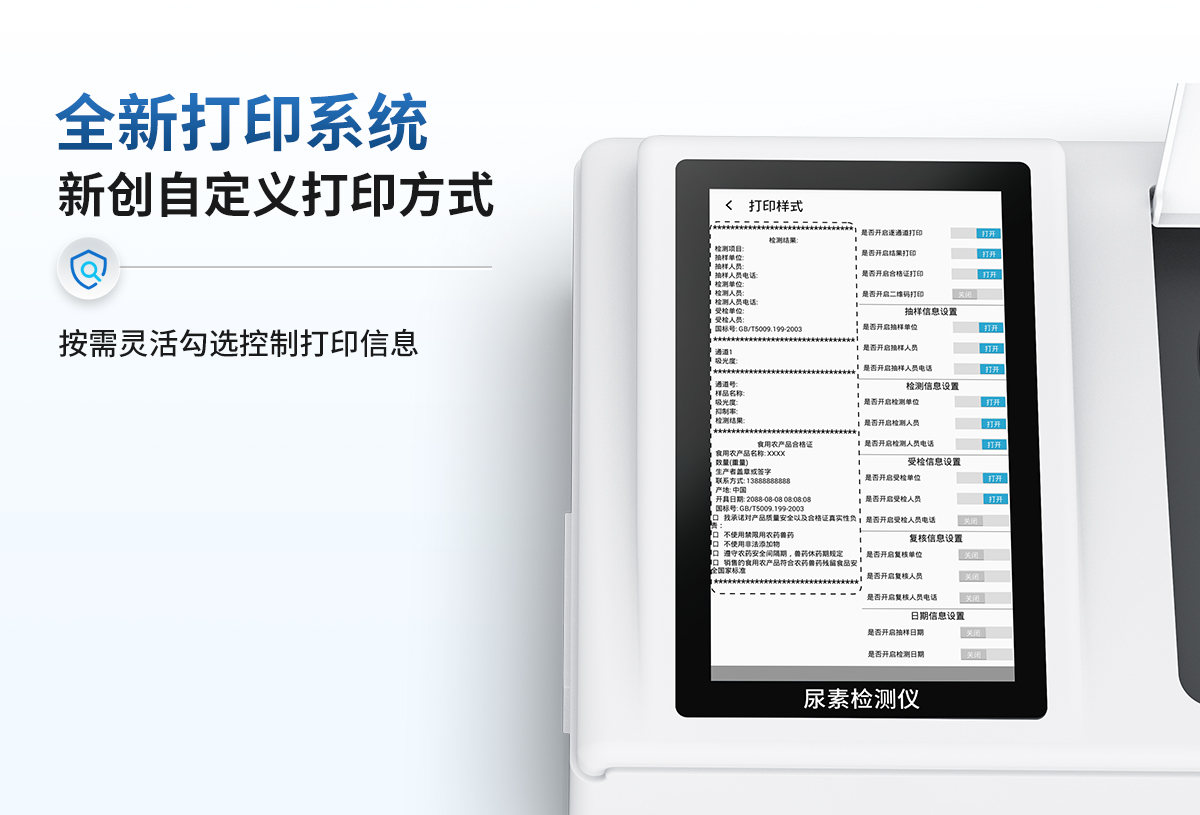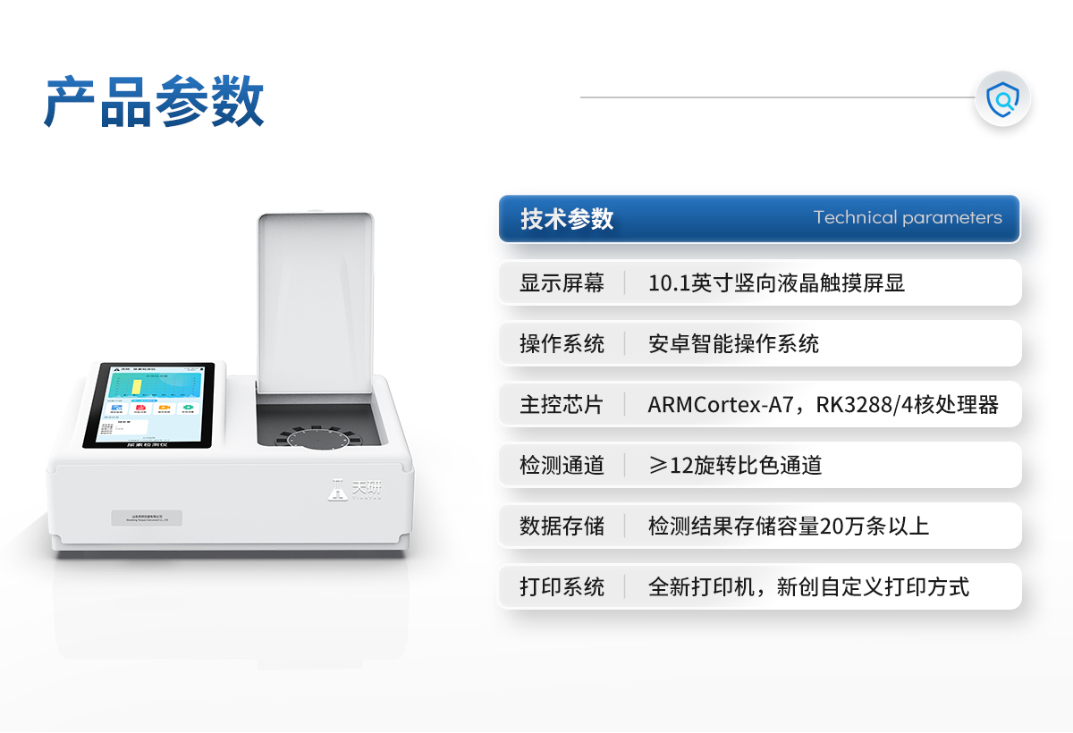 | 儀器采用臺式一體化系統(tǒng)檢測技術,將分光光度模塊、數(shù)字化管理模塊、無線通訊模塊高度集成于一體,可支持檢測60種食品安全檢測項目,同時預留升級檢測方法。 | 儀器檢測模塊標準化、智能化,檢測項目可隨意自由組合。檢測箱體內(nèi)置多個標準檢測單元,檢測模塊可以調(diào)整配置。 | 顯示屏幕:儀器采用10.1英寸豎向液晶觸摸屏顯,搭配運行安卓智能操作系統(tǒng),主控芯片采用ARM Cortex-A7,RK3288/4核處理器,主頻1.88Ghz,操作方便,性能更強。 | 檢測通道:≥12通道;采用精密旋轉(zhuǎn)比色池設計,使用同芯片同光源校準精度,解決不同光源之間的誤差值,更加準確**。(1-12通道間誤差0.1%,**號:ZL202022821055.2) | 儀器光源:高精度進口四波長冷光源,每個通道均配置 410、520、590、630nm 波長光源,標配**的光路切換裝置,**光路切換功能可實現(xiàn)64波長,并且所有檢測項目可實現(xiàn)所有通道同時檢測。 | 設備可一鍵校準,自動保存校準數(shù)據(jù),自動對比校驗,得到精準光源,采用Android SP存儲數(shù)據(jù),光源數(shù)據(jù)永不丟失,方便每一次使用。 | 通訊接口:配備無線通信模塊、4G(APN)通訊模塊、藍牙傳輸,同時具有雙USB接口以及RJ45網(wǎng)線接口,可以多方式實現(xiàn)數(shù)據(jù)保存及數(shù)據(jù)傳輸。 | 存儲方式:支持U盤存儲,標準USB接口,免驅(qū)動安裝。檢測結(jié)果存儲容量20萬條以上,可生成Excel表格進行拷貝,并具有登錄保護功能。 | 智能化操作系統(tǒng): | 便捷操作系統(tǒng):設備檢測時可在同一檢測界面自動對應相關檢測通道一次性選擇1-12個樣品名稱,無須退出界面,節(jié)省操作時間。 | 數(shù)據(jù)集成系統(tǒng):設備首頁自動統(tǒng)計檢測數(shù)據(jù)包含:周檢測數(shù)據(jù)、月檢測數(shù)據(jù),全部檢測總數(shù)量,均包含檢測總數(shù),合格數(shù),不合格數(shù),以及相關柱形分析圖,對各項檢測數(shù)據(jù)清晰掌握,無需電腦查詢,更加快捷直觀。 | 數(shù)據(jù)庫系統(tǒng):十幾項數(shù)據(jù)庫分類管理儀器:包含項目類型、項目數(shù)據(jù)、檢測數(shù)據(jù)、歷史記錄、國標信息、曲線信息、采樣信息、檢測信息、受檢信息、復核信息、圖表信息、光源校準信息、打印樣式信息、樣品庫信息等等,數(shù)據(jù)庫之間互相協(xié)調(diào)聯(lián)動保證數(shù)據(jù)的真實完整性。同時產(chǎn)品數(shù)據(jù)庫以及歷史檢測記錄支持一鍵檢索功能。 | 限量規(guī)判系統(tǒng):具有限量查詢、添加物質(zhì)合規(guī)判定系統(tǒng)。檢測出結(jié)果后,系統(tǒng)自動調(diào)用系統(tǒng)數(shù)據(jù)庫中相關國標進行比對判定,客觀顯示判定結(jié)果是否合格。 | 項目預設系統(tǒng):儀器具有任務預設模塊,一鍵提前預設,給出方便快捷的新檢測方案,每一個任務分別可以設置不同的樣品、批次、編號、來源、備注、抽樣信息、檢測信息、受檢信息、復核信息等更多信息。樣品送檢時一鍵調(diào)取保存信息,并可多次調(diào)取,大大提高檢測效率。 | 數(shù)據(jù)監(jiān)管系統(tǒng):同步對接監(jiān)管平臺,數(shù)據(jù)可局域網(wǎng)和互聯(lián)網(wǎng)數(shù)據(jù)上傳,檢測結(jié)果可選擇直接傳至食品安全監(jiān)管平臺。進行區(qū)域食品安全監(jiān)管及大數(shù)據(jù)分析處理與數(shù)據(jù)統(tǒng)計,檢測區(qū)域食品安全長短期動態(tài),達到食品安全問題預估、預警。 | 全新打印系統(tǒng):內(nèi)置全新打印機,新創(chuàng)自定義打印方式,可按需靈活勾選控制:二維碼,抽樣信息、檢測信息,受檢信息、復核信息、抽樣日期、檢測日期等信息的打印。 | A4紙版本報告打印功能(可選配):設備擁有兩種結(jié)果展示方式,可以自動生成A4打印模板和小票打印模板兩種樣式,可通過WiFi及網(wǎng)線等方式鏈接外置打印機可進行打印。 | 供電模式:儀器交直流兩用,直流12V供電,可連接車載電源,可配6ah大容量充電鋰電池,電量可實時顯示,方便戶外流動測試。 | 儀器具備遠程升級功能,可定向分客戶分儀器更新,開機后自動更新,并可持續(xù)性免費更新系統(tǒng)版本,無需像傳統(tǒng)產(chǎn)品返廠更新,節(jié)省時間及人力成本并避免了物流運輸返廠升級導致設備損壞的潛在風險。 |