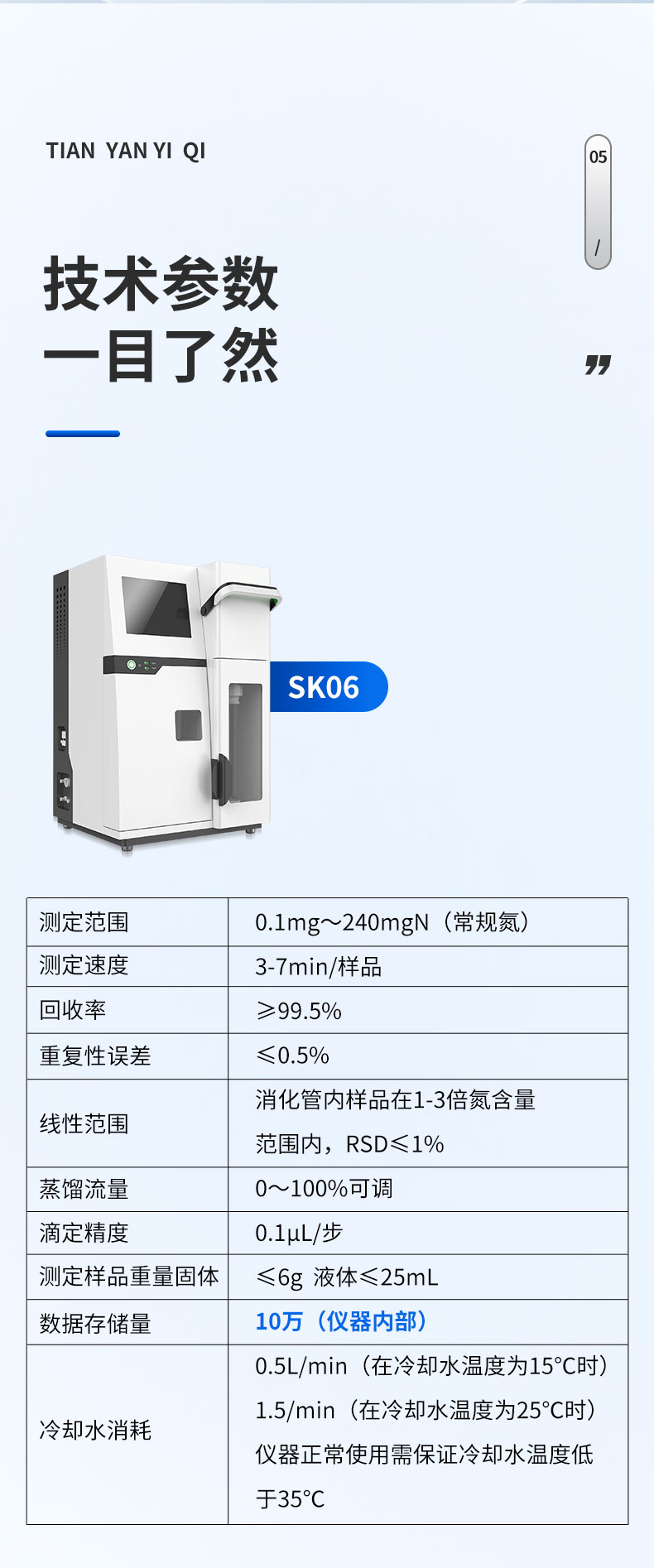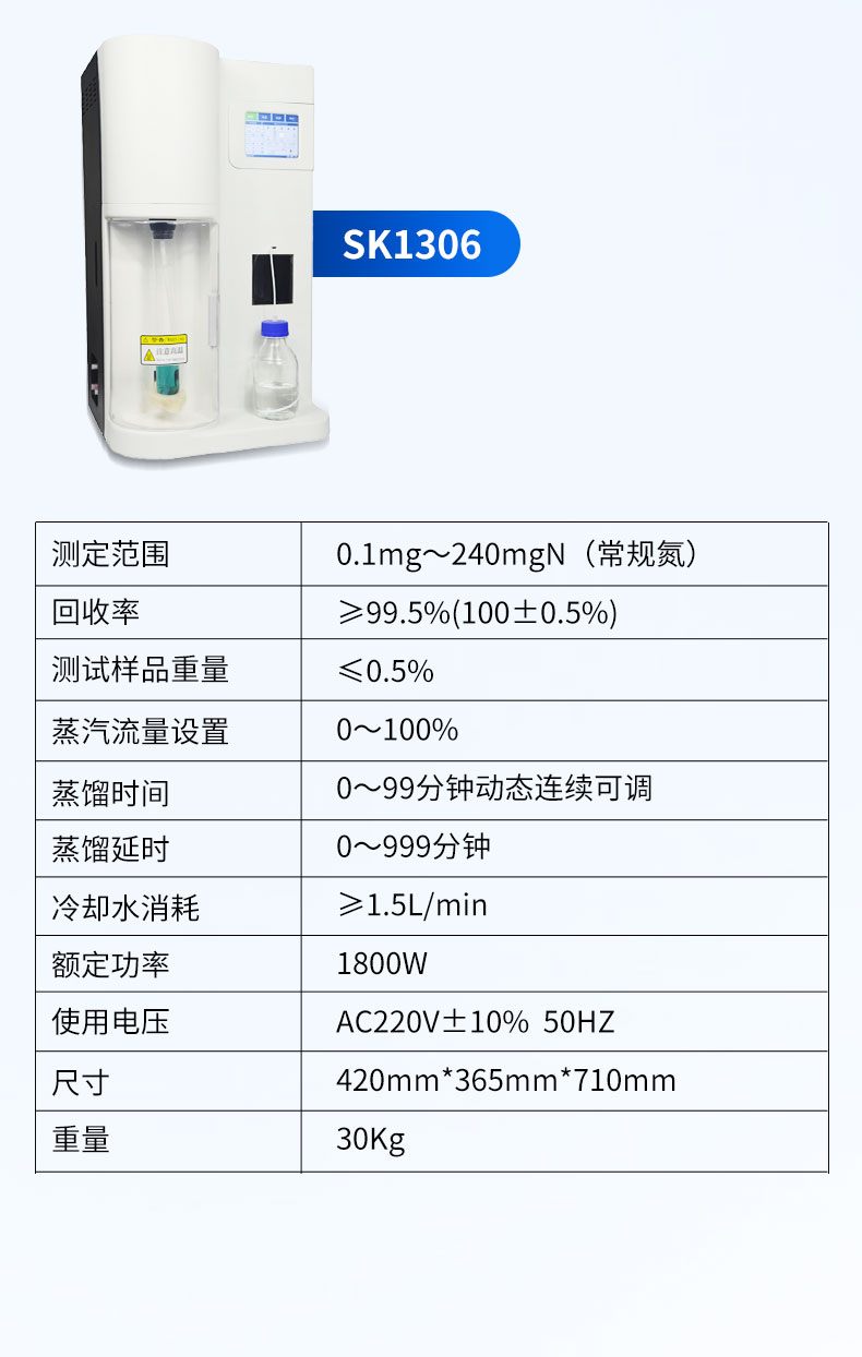 | 1. 測(cè)試范圍:0.1mg~240mgN | 2.☆回收率:≥99.5%(100±0.5%) | 3. 重復(fù)性誤差:±0.5% | 4. ☆測(cè)試樣品重量:固體≤6g 液體≤25ml | 5. 蒸汽流量設(shè)置:0~100% | 6. 蒸餾時(shí)間:0~99分鐘動(dòng)態(tài)連續(xù)可調(diào) | 7. 蒸餾延時(shí):0~999分鐘 | 8. 冷卻水消耗:≥1.5L/min | 9.額定功率:1800W | 10.使用電壓:AC220V±10% 50HZ | 11.尺寸:420mm*365mm*710mm | 12.重量:30Kg |