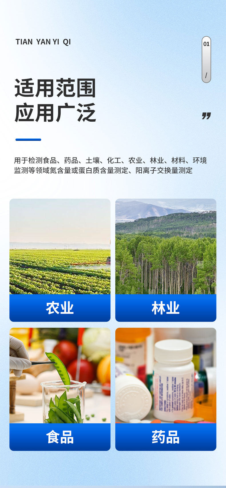 用于檢測(cè)食品、藥品、土壤、化工、農(nóng)業(yè)、林業(yè)、材料、環(huán)境監(jiān)測(cè)等領(lǐng)域氮含量或蛋白質(zhì)含量測(cè)定、陽(yáng)離子交換量測(cè)定。