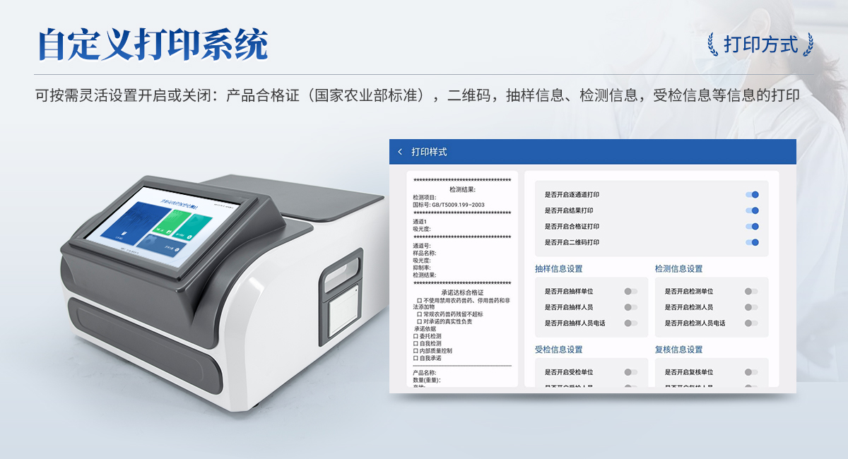 | 1. 試劑位置:3個 | 2. 檢測形式:旋轉48通道比色盤,可任意選擇檢測通道,自動對應選擇通道。 | 3. 系統配置:10.1寸高清液晶觸摸屏,采用ARM Cortex-A7,RK3288/4核處理器,運行內存1GB。Android7.1.1 系統分辨率1280×800。 | 4.恒溫系統:具有自動加溫溫控系統,精準恒溫37℃,精度±0.1℃。 | 5.添加系統:儀器按照試劑要求自動、按時、按量加入試劑,并且自動對未正常放置的樣本或異常的樣本進行檢查并提示。 | 6.清洗功能:儀器具備回流及自動清洗管路功能,避免試劑污染。 | 7.混勻功能:設備具備自動混勻功能。 | 8.光源校準:設備可自動校準,確保檢測準確度。 | 9.實時監(jiān)控:儀器測試過程中屏幕顯示運行狀態(tài),可實時查看。 | 10.數據存儲:內部存儲16GB,可存儲500萬條數據。 | 11.樣品多選功能:設備具備樣品一鍵多選功能,選擇樣品自動匹配檢測通道。 | 12.項目預設:可提前設置單個及多個相同或不相同的檢測任務,可單次或者多次調取,減少檢測時間。 | 13.自定義打印系統:內置自定義打印系統,可按需靈活設置開啟或關閉:產品合格證(國家農業(yè)部標準),二維碼,抽樣信息、檢測信息,受檢信息等信息的打印。 | 14.A4版本報告打印功能:設備可自動生成A4版報告,A4報告帶二維碼,可掃描二維碼生成電子版,并可識別真?zhèn)巍?/td> | 15.傳輸方式:儀器配備無線通信模塊: 4G(APN)通訊模塊、Wifi模塊,藍牙傳輸模塊,同時具有USB接口以及RJ45接口能以多種方式實現數據保存和數據傳輸功能,設備數據可以同步上傳至平臺。 | 16.數據監(jiān)管系統:設備自帶監(jiān)管平臺,并可同步對接監(jiān)管平臺,數據可局域網和互聯網數據上傳,檢測結果可直接傳至食品安全監(jiān)管平臺。達到食品安全問題預估、預警。 | 17.系統遠程更新功能:無需設備返廠,即可遠程實時升級全新系統,節(jié)省時間成本及避免運輸造成設備損。 |