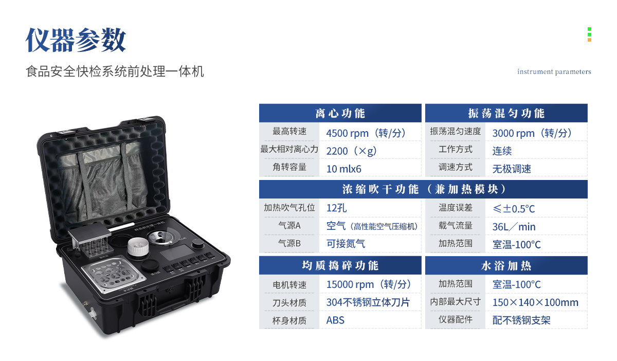產(chǎn)品介紹: 應(yīng)國內(nèi)用戶的實(shí)際需求,自行研制開發(fā)的新型儀器——QC05型樣品前處理一體機(jī)。樣品前處理集成箱將樣本前處理過程中樣品濃縮、水浴恒溫、離心分層、均質(zhì)、振蕩混勻等步驟所需設(shè)備進(jìn)行集成,僅需一臺(tái)樣品前處理集成箱設(shè)備即可完成所有樣本前處理過程,并且方便攜帶,不僅適用于現(xiàn)場檢測使用,還可用