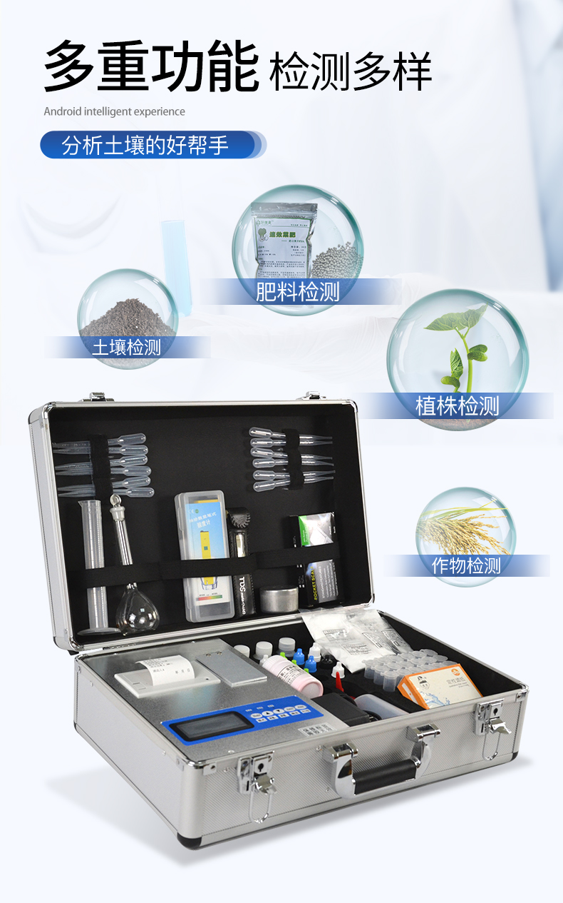 產(chǎn)品簡介: 配套齊全:該儀器集藥、器、儀為一體,攜帶方便,相當于一個小型移動實驗室,無需用戶自配附件,亦可靈活野外流動測試。適于農(nóng)業(yè)服務(wù)部門或農(nóng)資經(jīng)銷商、高教院校、科研院所、合作社、肥料廠商、大種植戶測土施肥和鑒別肥料真假及環(huán)保檢測應(yīng)用。 檢測功能全:測試項目國內(nèi)外全面,除標