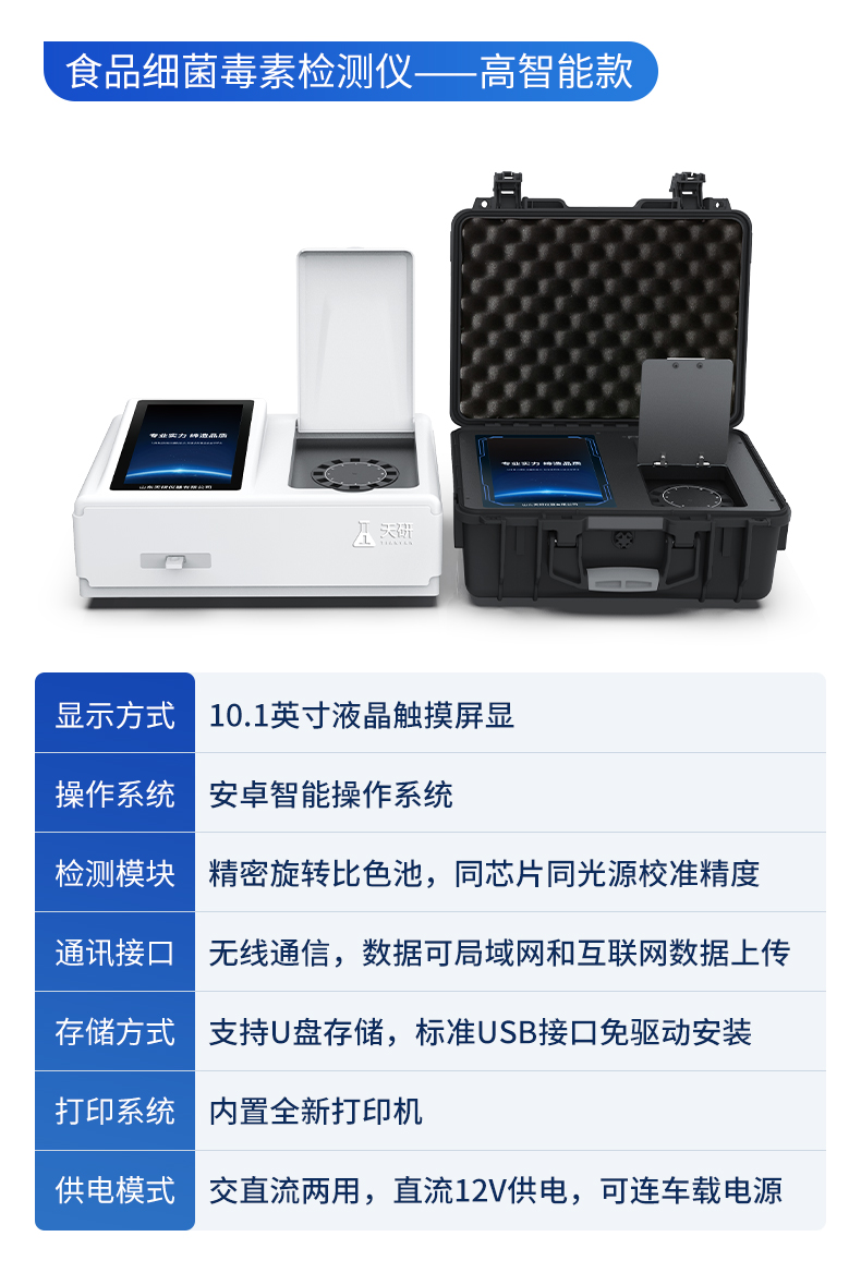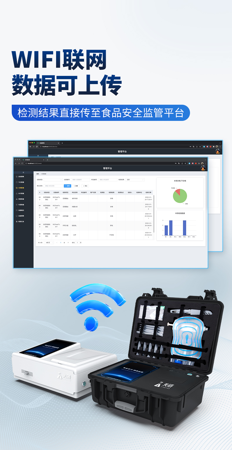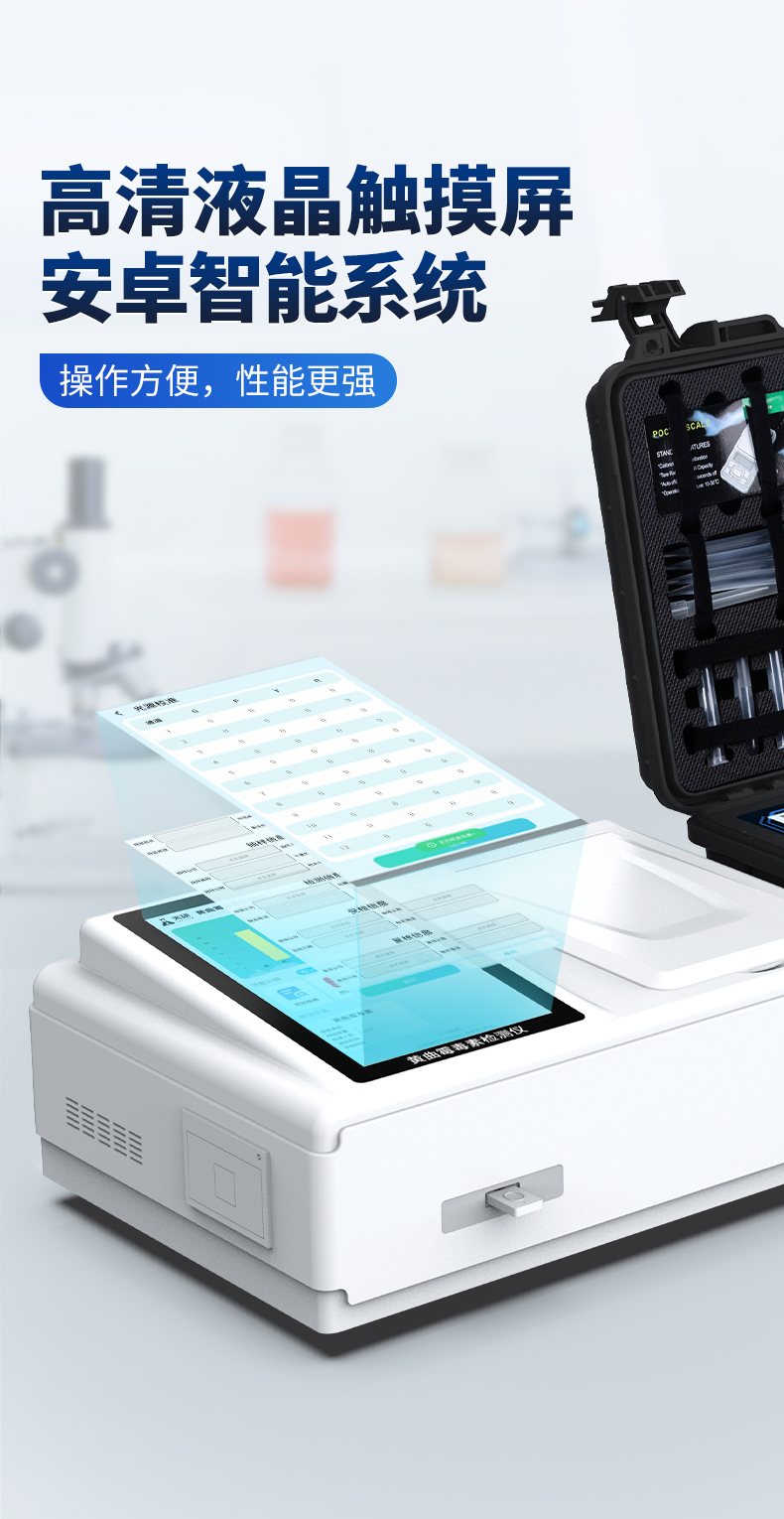 | 1、儀器采用10.1英寸液晶觸摸屏顯,搭配運(yùn)行安卓智能操作系統(tǒng),主控芯片采用ARM Cortex-A7,RK3288/4核處理器,主頻1.88Ghz,運(yùn)轉(zhuǎn)速度更快速,性能更強(qiáng)。 | 2、儀器功能包括:膠體金檢測(cè)模塊、數(shù)字化管理模塊、無(wú)線通訊模塊等,可以滿足同一軟件下實(shí)現(xiàn)所有檢測(cè)項(xiàng)目的檢測(cè),并在同一窗口展示檢測(cè)結(jié)果。 | 3.一體化臺(tái)式快檢設(shè)備,采用交直流兩用供電方式,可連接車載電源,配備6ah大容量充電鋰電池,可以滿足現(xiàn)場(chǎng)及流動(dòng)檢測(cè)使用的需求。儀器尺寸:43×35×20cm, 主機(jī)凈重:5.1kg | 4、系統(tǒng)自帶數(shù)據(jù)集成模塊,設(shè)備首頁(yè)自動(dòng)統(tǒng)計(jì)檢測(cè)數(shù)據(jù)包含:周檢測(cè)數(shù)據(jù)、月檢測(cè)數(shù)據(jù),全部檢測(cè)總數(shù)量,均包含檢測(cè)總數(shù),合格數(shù),不合格數(shù),以及相關(guān)柱形分析圖,對(duì)各項(xiàng)檢測(cè)數(shù)據(jù)清晰掌握,無(wú)需電腦查詢,更加快捷直觀。 | 5、儀器具有任務(wù)預(yù)設(shè)模塊,可在樣品送檢前提前預(yù)設(shè)樣品名稱、檢測(cè)指標(biāo)、送檢單位等信息,樣品送檢時(shí)一鍵調(diào)取保存信息,檢測(cè)更加方便快捷。 | 6、膠體金檢測(cè)模塊: | 直插式自動(dòng)掃描方式,可實(shí)時(shí)顯示金標(biāo)卡實(shí)時(shí)圖像,系統(tǒng)自動(dòng)分析并呈現(xiàn)出CT曲線圖,CT線自動(dòng)識(shí)別,無(wú)需手動(dòng)調(diào)整,完成檢測(cè)后自動(dòng)退出檢測(cè)卡。 | 結(jié)果判定線可修改,對(duì)照值標(biāo)定值可保存,斷電不丟失數(shù)據(jù)。 | 兼容市場(chǎng)上其他膠體金卡,使用耗材不受限制,極大增強(qiáng)用戶使用體驗(yàn)。 | 7、儀器檢測(cè)系統(tǒng)擁有龐大數(shù)據(jù)庫(kù),并且構(gòu)建了完善的檢索、修訂功能。食品庫(kù)涵蓋多種樣品名稱,可按需添加或刪除、編輯樣品名稱;產(chǎn)品數(shù)據(jù)庫(kù)以及歷史檢測(cè)記錄支持一鍵檢索功能。 | 8、系統(tǒng)打印自定義化,打印格式多樣化,產(chǎn)品合格證(國(guó)家標(biāo)準(zhǔn)要求),二維碼,抽樣信息、檢測(cè)信息,受檢信息、復(fù)核信息、抽樣日期、檢測(cè)日期等信息結(jié)果,可按需求自行設(shè)置打印內(nèi)容。 | 9、A4紙版本報(bào)告打印功能(可選配):設(shè)備擁有兩種結(jié)果展示方式,可以自動(dòng)生成A4打印模板和小票打印模板兩種樣式,可通過(guò)WiFi及網(wǎng)線等方式鏈接外置打印機(jī)可進(jìn)行打印 | 10、儀器具有 wifi 聯(lián)網(wǎng)上傳、RJ45網(wǎng)線連接功能,可以快速上傳數(shù)據(jù)。同步對(duì)接監(jiān)管平臺(tái),數(shù)據(jù)可局域網(wǎng)和互聯(lián)網(wǎng)數(shù)據(jù)上傳,檢測(cè)結(jié)果直接傳至食品安全監(jiān)管平臺(tái)。進(jìn)行區(qū)域食品安全監(jiān)管及大數(shù)據(jù)分析處理與數(shù)據(jù)統(tǒng)計(jì),檢測(cè)區(qū)域食品安全長(zhǎng)短期動(dòng)態(tài),達(dá)到食品安全問(wèn)題預(yù)估、預(yù)警。 | 11、設(shè)備支持U盤(pán)存儲(chǔ),標(biāo)準(zhǔn)USB接口,免驅(qū)動(dòng)安裝。檢測(cè)結(jié)果存儲(chǔ)容量20萬(wàn)條以上,可生成Excel表格,進(jìn)行一鍵拷貝,并具有登錄保護(hù)功能,可設(shè)置用戶名及密碼,規(guī)范不同人員操作權(quán)限,防止非工作人員操作,并且可以進(jìn)行重新校準(zhǔn)、鎖定、恢復(fù)出廠設(shè)置功能。儀器固件可升級(jí),后期檢測(cè)項(xiàng)目可擴(kuò)充。 | 12、儀器具備遠(yuǎn)程升級(jí)功能,可定向分客戶分儀器更新,開(kāi)機(jī)后自動(dòng)更新,并可持續(xù)性免費(fèi)更新系統(tǒng)版本,無(wú)需像傳統(tǒng)產(chǎn)品返廠更新,節(jié)省時(shí)間及人力成本并避免了物流運(yùn)輸返廠升級(jí)導(dǎo)致設(shè)備損壞的潛在風(fēng)險(xiǎn)。 |