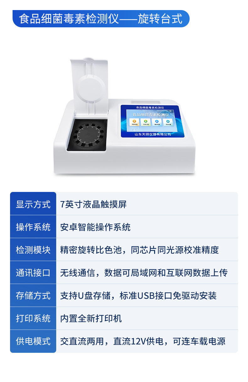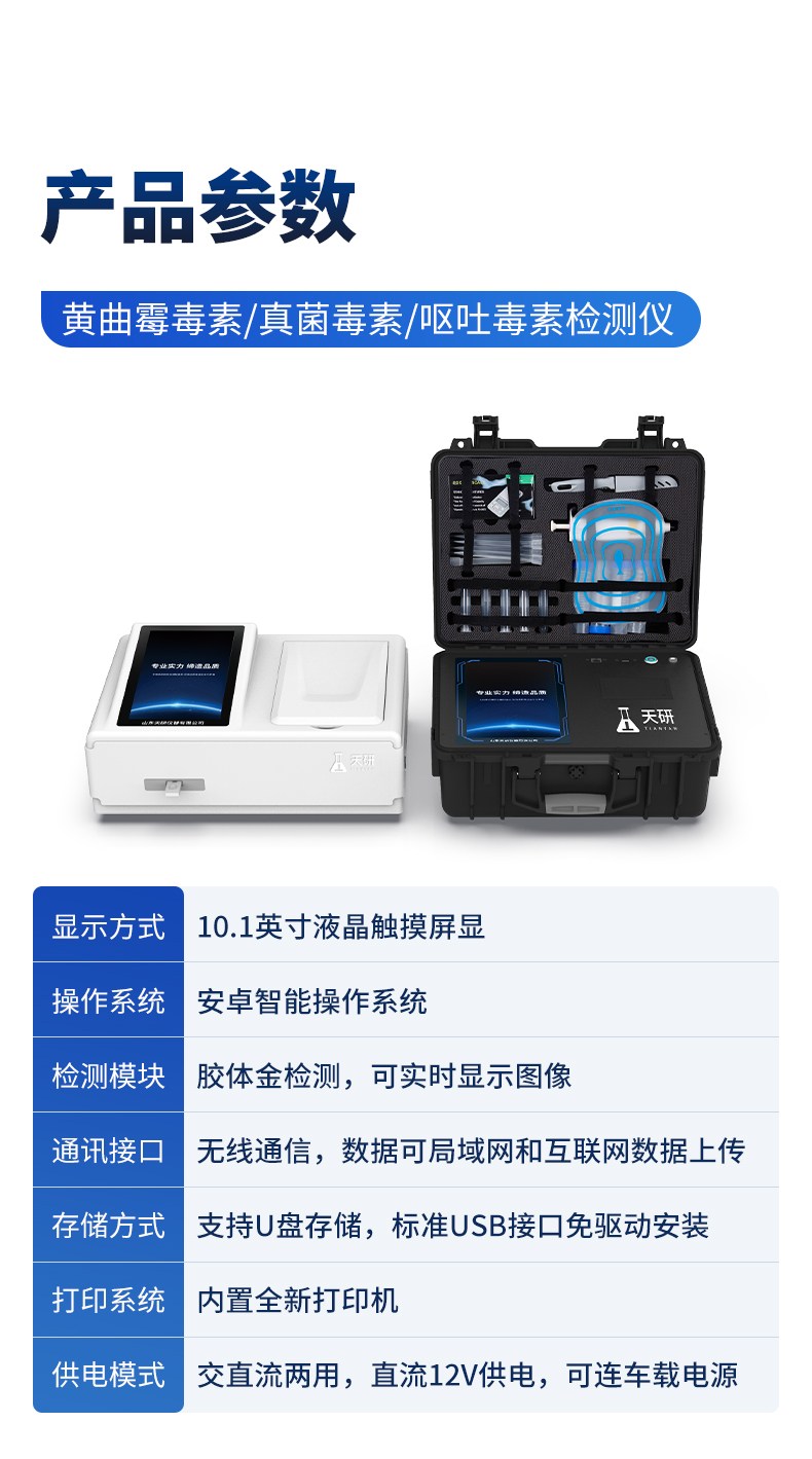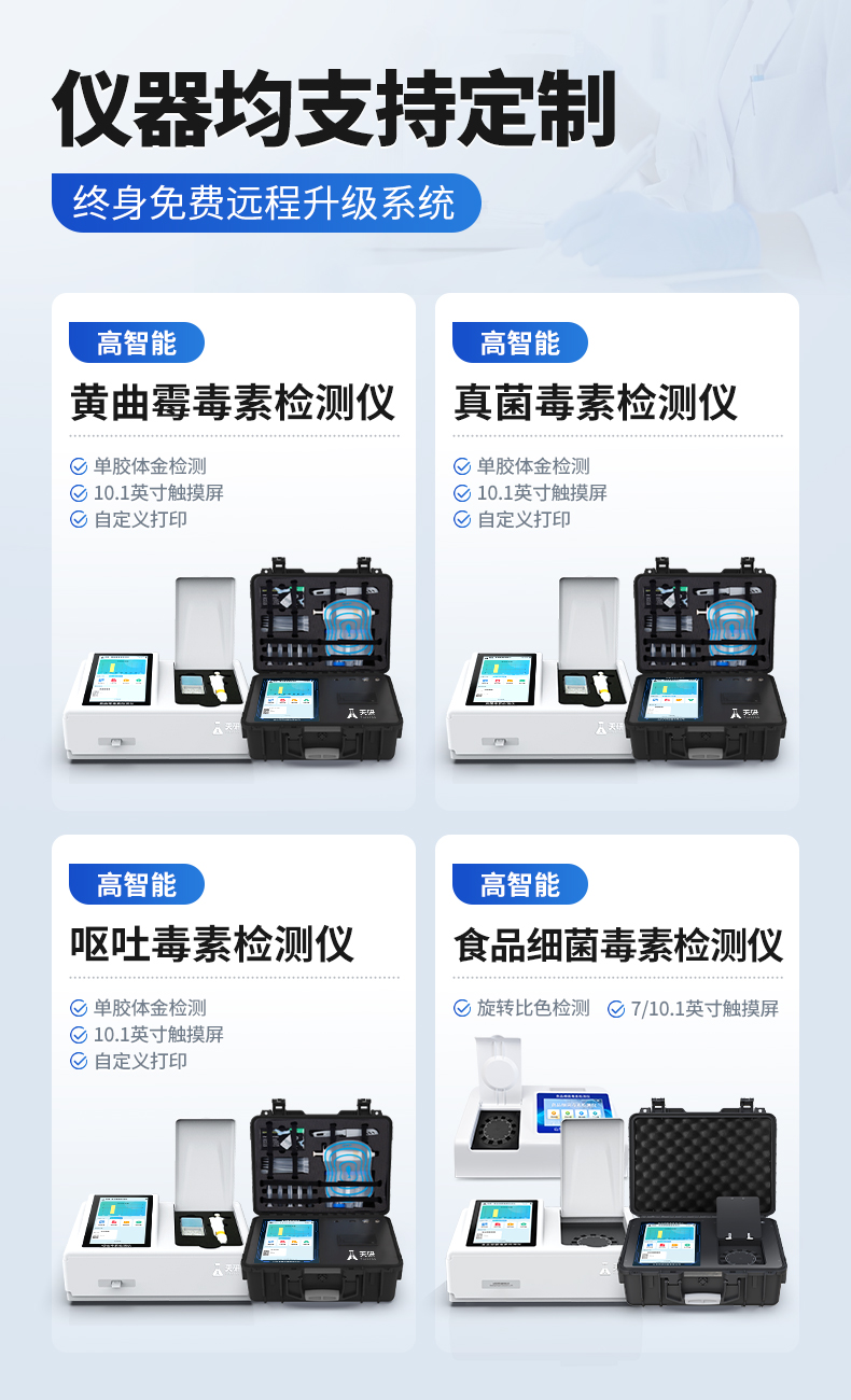 | 1、儀器采用10.1英寸液晶觸摸屏顯,搭配運(yùn)行安卓智能操作系統(tǒng),主控芯片采用ARM Cortex-A7,RK3288/4核處理器,主頻1.88Ghz,運(yùn)轉(zhuǎn)速度更快速,性能更強(qiáng)。 | 2、儀器功能包括:膠體金檢測(cè)模塊、數(shù)字化管理模塊、無(wú)線通訊模塊等,可以滿足同一軟件下實(shí)現(xiàn)所有檢測(cè)項(xiàng)目的檢測(cè),并在同一窗口展示檢測(cè)結(jié)果。 | 3.一體化臺(tái)式快檢設(shè)備,采用交直流兩用供電方式,可連接車載電源,配備6ah大容量充電鋰電池,可以滿足現(xiàn)場(chǎng)及流動(dòng)檢測(cè)使用的需求。儀器尺寸:43×35×20cm, 主機(jī)凈重:5.1kg | 4、系統(tǒng)自帶數(shù)據(jù)集成模塊,設(shè)備首頁(yè)自動(dòng)統(tǒng)計(jì)檢測(cè)數(shù)據(jù)包含:周檢測(cè)數(shù)據(jù)、月檢測(cè)數(shù)據(jù),全部檢測(cè)總數(shù)量,均包含檢測(cè)總數(shù),合格數(shù),不合格數(shù),以及相關(guān)柱形分析圖,對(duì)各項(xiàng)檢測(cè)數(shù)據(jù)清晰掌握,無(wú)需電腦查詢,更加快捷直觀。 | 5、儀器具有任務(wù)預(yù)設(shè)模塊,可在樣品送檢前提前預(yù)設(shè)樣品名稱、檢測(cè)指標(biāo)、送檢單位等信息,樣品送檢時(shí)一鍵調(diào)取保存信息,檢測(cè)更加方便快捷。 | 6、膠體金檢測(cè)模塊: | 直插式自動(dòng)掃描方式,可實(shí)時(shí)顯示金標(biāo)卡實(shí)時(shí)圖像,系統(tǒng)自動(dòng)分析并呈現(xiàn)出CT曲線圖,CT線自動(dòng)識(shí)別,無(wú)需手動(dòng)調(diào)整,完成檢測(cè)后自動(dòng)退出檢測(cè)卡。 | 結(jié)果判定線可修改,對(duì)照值標(biāo)定值可保存,斷電不丟失數(shù)據(jù)。 | 兼容市場(chǎng)上其他膠體金卡,使用耗材不受限制,極大增強(qiáng)用戶使用體驗(yàn)。 | 7、儀器檢測(cè)系統(tǒng)擁有龐大數(shù)據(jù)庫(kù),并且構(gòu)建了完善的檢索、修訂功能。食品庫(kù)涵蓋多種樣品名稱,可按需添加或刪除、編輯樣品名稱;產(chǎn)品數(shù)據(jù)庫(kù)以及歷史檢測(cè)記錄支持一鍵檢索功能。 | 8、系統(tǒng)打印自定義化,打印格式多樣化,產(chǎn)品合格證(國(guó)家標(biāo)準(zhǔn)要求),二維碼,抽樣信息、檢測(cè)信息,受檢信息、復(fù)核信息、抽樣日期、檢測(cè)日期等信息結(jié)果,可按需求自行設(shè)置打印內(nèi)容。 | 9、A4紙版本報(bào)告打印功能(可選配):設(shè)備擁有兩種結(jié)果展示方式,可以自動(dòng)生成A4打印模板和小票打印模板兩種樣式,可通過(guò)WiFi及網(wǎng)線等方式鏈接外置打印機(jī)可進(jìn)行打印 | 10、儀器具有 wifi 聯(lián)網(wǎng)上傳、RJ45網(wǎng)線連接功能,可以快速上傳數(shù)據(jù)。同步對(duì)接監(jiān)管平臺(tái),數(shù)據(jù)可局域網(wǎng)和互聯(lián)網(wǎng)數(shù)據(jù)上傳,檢測(cè)結(jié)果直接傳至食品安全監(jiān)管平臺(tái)。進(jìn)行區(qū)域食品安全監(jiān)管及大數(shù)據(jù)分析處理與數(shù)據(jù)統(tǒng)計(jì),檢測(cè)區(qū)域食品安全長(zhǎng)短期動(dòng)態(tài),達(dá)到食品安全問(wèn)題預(yù)估、預(yù)警。 | 11、設(shè)備支持U盤(pán)存儲(chǔ),標(biāo)準(zhǔn)USB接口,免驅(qū)動(dòng)安裝。檢測(cè)結(jié)果存儲(chǔ)容量20萬(wàn)條以上,可生成Excel表格,進(jìn)行一鍵拷貝,并具有登錄保護(hù)功能,可設(shè)置用戶名及密碼,規(guī)范不同人員操作權(quán)限,防止非工作人員操作,并且可以進(jìn)行重新校準(zhǔn)、鎖定、恢復(fù)出廠設(shè)置功能。儀器固件可升級(jí),后期檢測(cè)項(xiàng)目可擴(kuò)充。 | 12、儀器具備遠(yuǎn)程升級(jí)功能,可定向分客戶分儀器更新,開(kāi)機(jī)后自動(dòng)更新,并可持續(xù)性免費(fèi)更新系統(tǒng)版本,無(wú)需像傳統(tǒng)產(chǎn)品返廠更新,節(jié)省時(shí)間及人力成本并避免了物流運(yùn)輸返廠升級(jí)導(dǎo)致設(shè)備損壞的潛在風(fēng)險(xiǎn)。 |