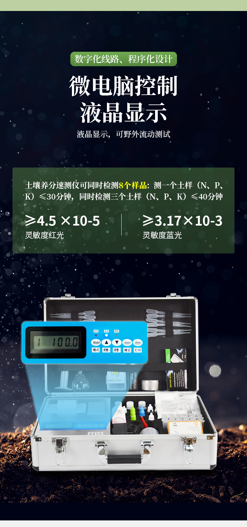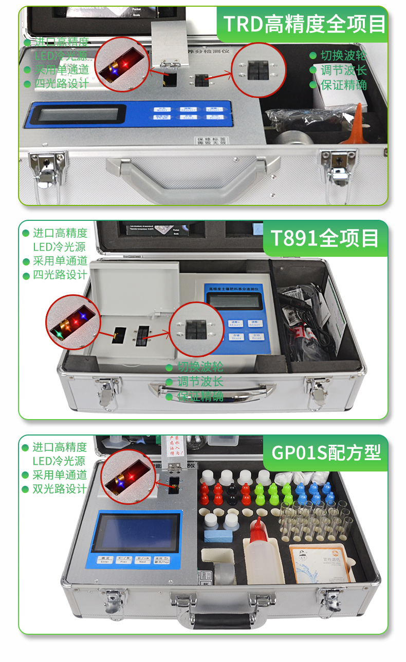 | 全項目土壤肥料養(yǎng)分檢測儀功能全:測試項目國內(nèi)外最全(各類藥劑均可選購)。 | 配套齊全:該儀器集藥、器、儀為一體,攜帶方便,相當(dāng)于一個小型實驗室。適于農(nóng)業(yè)服務(wù)部門或農(nóng)資經(jīng)銷商、肥料廠商測土施肥和鑒別肥料真假。 | 操作簡便、速度快捷,成品藥劑開瓶即用,無須配置。 |