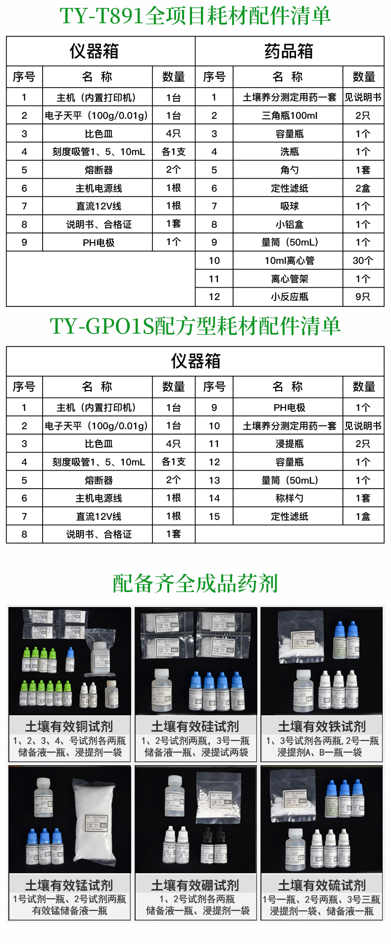 | 藥 品 箱 | 土壤養(yǎng)分測定用藥一套:見說明書 | 三角瓶100ml :2只 | 小反應(yīng)瓶 :9只 | 容量瓶 :1個 | 洗瓶 :1個 | 角勺 :1套 | 定性濾紙 :2盒 | 吸球 :1個 | 小鋁盒 :1個 | 量筒(50mL) :1個 | 10ml離心管 :40個 | 離心管架 :1個 |