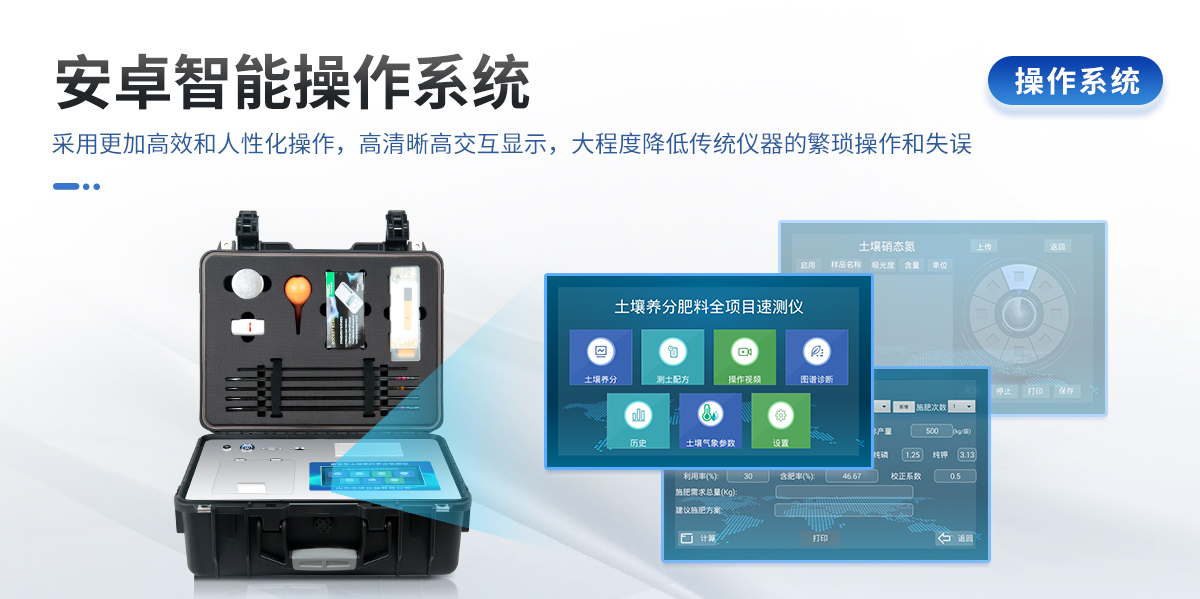 | 安卓智能操作系統(tǒng)Android 7.1版本,主控芯片采用ARM Cortex-A7,RK3288/4核處理器,主頻1.88Ghz,運(yùn)轉(zhuǎn)速度更快速,穩(wěn)定性更強(qiáng)。 | 可檢測(cè)各種土壤、肥料、作物、食品、水質(zhì)、環(huán)境等共200多個(gè)測(cè)試項(xiàng)目,一機(jī)多用,功能齊全。 | 測(cè)試速度更快!無(wú)需空白對(duì)照和標(biāo)準(zhǔn)校準(zhǔn),省卻以往繁瑣的操作步驟,一鍵式操作,直接讀取數(shù)據(jù),**率,低消耗。 | 12個(gè)旋轉(zhuǎn)檢測(cè)通道,一次性可快速檢測(cè)12個(gè)樣品,極大提升檢測(cè)效率,降低檢測(cè)成本。 | 采用高精度濾光片技術(shù)自主**分析方法(**號(hào):ZL 2020 2 1763837.9),**認(rèn)證。 | 具有自身保護(hù)功能,內(nèi)置人臉識(shí)別攝像頭可掃臉登錄,也可設(shè)置用戶名和密碼,防止非工作人員操作查看實(shí)驗(yàn)數(shù)據(jù)。 | 檢測(cè)過(guò)程中內(nèi)置校準(zhǔn)功能,智能恒流穩(wěn)壓,光強(qiáng)自動(dòng)校準(zhǔn),確保檢測(cè)準(zhǔn)確度,取得中國(guó)計(jì)量科學(xué)研究院的《校準(zhǔn)證書》 | 內(nèi)置傳感器航空接口,插拔方便,配備FDR傳感器、環(huán)境多要素傳感器。 | FDR傳感器為土壤三參數(shù)一體式,可同時(shí)測(cè)量土壤水分含量、土壤環(huán)境溫度、土壤電導(dǎo)率(鹽分)方便快捷。 | 環(huán)境多要素傳感器為6要素一體式,可同時(shí)測(cè)量空氣溫度、空氣濕度、露點(diǎn)、大氣壓力、光照度、二氧化碳。 | 儀器標(biāo)配wifi無(wú)線上傳、4G聯(lián)網(wǎng)傳輸、GPRS無(wú)線遠(yuǎn)傳,快速上傳數(shù)據(jù)。 | 配有智慧云農(nóng)業(yè)平臺(tái),儀器連入無(wú)線網(wǎng)絡(luò)后,可將檢測(cè)數(shù)據(jù)可選擇性或批量無(wú)線上傳,方便用戶進(jìn)行數(shù)據(jù)管理和長(zhǎng)期分析。 | 儀器配同時(shí)具有USB接口、以太網(wǎng)接口,內(nèi)置大容量?jī)?nèi)存,并可隨時(shí)用U盤拷貝數(shù)據(jù)。 | 可用手機(jī)隨時(shí)登錄云平臺(tái)在線移動(dòng)查看歷史數(shù)據(jù) | 內(nèi)置作物專家施肥系統(tǒng),可對(duì)百余種全國(guó)農(nóng)業(yè)經(jīng)濟(jì)作物、果樹(shù)等的目標(biāo)產(chǎn)量計(jì)算推薦施肥量,依據(jù)施肥配方科學(xué)指導(dǎo)農(nóng)業(yè)生產(chǎn)。測(cè)土配方施肥結(jié)果可打印,打印內(nèi)容包含:作物種類、肥料種類、目標(biāo)產(chǎn)量、需求總量、建議施肥方案。 | 內(nèi)置植物營(yíng)養(yǎng)診斷標(biāo)準(zhǔn)圖譜,根據(jù)各農(nóng)作物營(yíng)養(yǎng)缺失的圖片,進(jìn)行葉面對(duì)比,診斷豐缺。 | 4波長(zhǎng)專業(yè)測(cè)試?yán)涔庠矗t、藍(lán)、綠、橙),光源波長(zhǎng)穩(wěn)定,長(zhǎng)時(shí)間連續(xù)工作光源無(wú)溫漂現(xiàn)象,壽命長(zhǎng)達(dá)10萬(wàn)小時(shí)級(jí)別,重現(xiàn)性好,準(zhǔn)確度高。 | 比色池部分采用標(biāo)準(zhǔn)1cm比色皿,無(wú)機(jī)械位移及磨損,光路測(cè)試定位**,有效屏蔽外光干擾,保證檢測(cè)結(jié)果優(yōu)于國(guó)標(biāo)要求。 | 儀器系統(tǒng)內(nèi)帶有樣品前處理操作視頻,各種樣品檢測(cè)方法點(diǎn)擊視頻模塊即可觀看,檢測(cè)人員無(wú)需自學(xué)說(shuō)明書,指導(dǎo)教學(xué)方便快速,方便新手快速操作。 | 內(nèi)置新一代高速熱敏打印機(jī)(無(wú)需色帶),打印內(nèi)容包含:檢測(cè)單位、檢測(cè)人員、檢測(cè)項(xiàng)目、通道號(hào)、吸光度、養(yǎng)分含量(mg/kg)、檢測(cè)時(shí)間、以及二維碼等信息 | 高靈敏7寸真彩觸摸屏,采用更加**和人性化操作,高清晰高交互顯示,大程度降低傳統(tǒng)儀器的繁瑣操作和失誤,并取得多項(xiàng)《軟件著作權(quán)》。 | 內(nèi)置時(shí)鐘功能,方便操作時(shí)間記錄,長(zhǎng)期歷史追溯。 | 可設(shè)置多賬戶賬號(hào)密碼登錄,**UI交互界面,不同的用戶可自由添加編輯檢測(cè)信息,保存后可長(zhǎng)期使用。 | GPS功能:可在野外作業(yè)時(shí)記錄經(jīng)緯度地點(diǎn),滿足特殊用戶需求。 | 內(nèi)置低電壓提示功能,可在檢測(cè)時(shí)明確電量,避免測(cè)試數(shù)據(jù)偏移,同時(shí)具有斷電保護(hù)功能,斷電自動(dòng)保存數(shù)據(jù),防止數(shù)據(jù)丟失。 | 交直流兩用供電方式,內(nèi)置大容量充電鋰電池,滿電狀態(tài)下可連續(xù)工作10余小時(shí),同時(shí)可外接車載電源蓄電 | 儀器具有中英文切換功能,可滿足出口要求。 | 高強(qiáng)度PVC工程塑料手提箱設(shè)計(jì),堅(jiān)固耐用,便于攜帶。 |