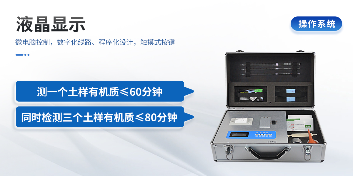 | 配套齊全:土壤有機質速測儀該儀器集藥、器、儀為一體,攜帶方便,相當于一個小型實驗室。適于農業(yè)服務部門或農資經(jīng)銷商、肥料廠商測土施肥和鑒別肥料真假。 | 操作簡便、速度快捷,成品藥劑開瓶即用,無須配置。 | 性能可靠:工作穩(wěn)定性優(yōu)于國家標準JJG179-90指標的6倍,重復性達到光柵型分光光度計指標水平。 |