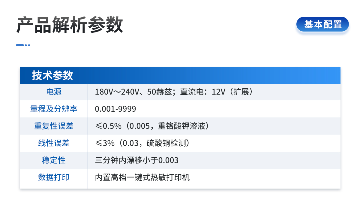 | 電源:交流電:180V~240V、50赫茲;直流電:12V(擴展) | 量程及分辨率:0.001-9999 | 穩(wěn)定性:三分鐘內漂移小于0.003 | 線性誤差:≤3%(0.03,硫酸銅檢測) | 重復性誤差:≤0.5%(0.005,重鉻酸鉀溶液) | 靈敏度:紅光≥4.5 ×10-5 藍光≥3.17×10-3 | 波長范圍:紅光620±8nm 藍光440±8nm | 測試速度:測一個土樣有機質≤60分鐘(含前處理時間) | 可同時檢測8個土樣≤個小時(含前處理時間) | 數(shù)據(jù)打?。簝戎酶邫n一鍵式熱敏打印機(國內首家**設計) |