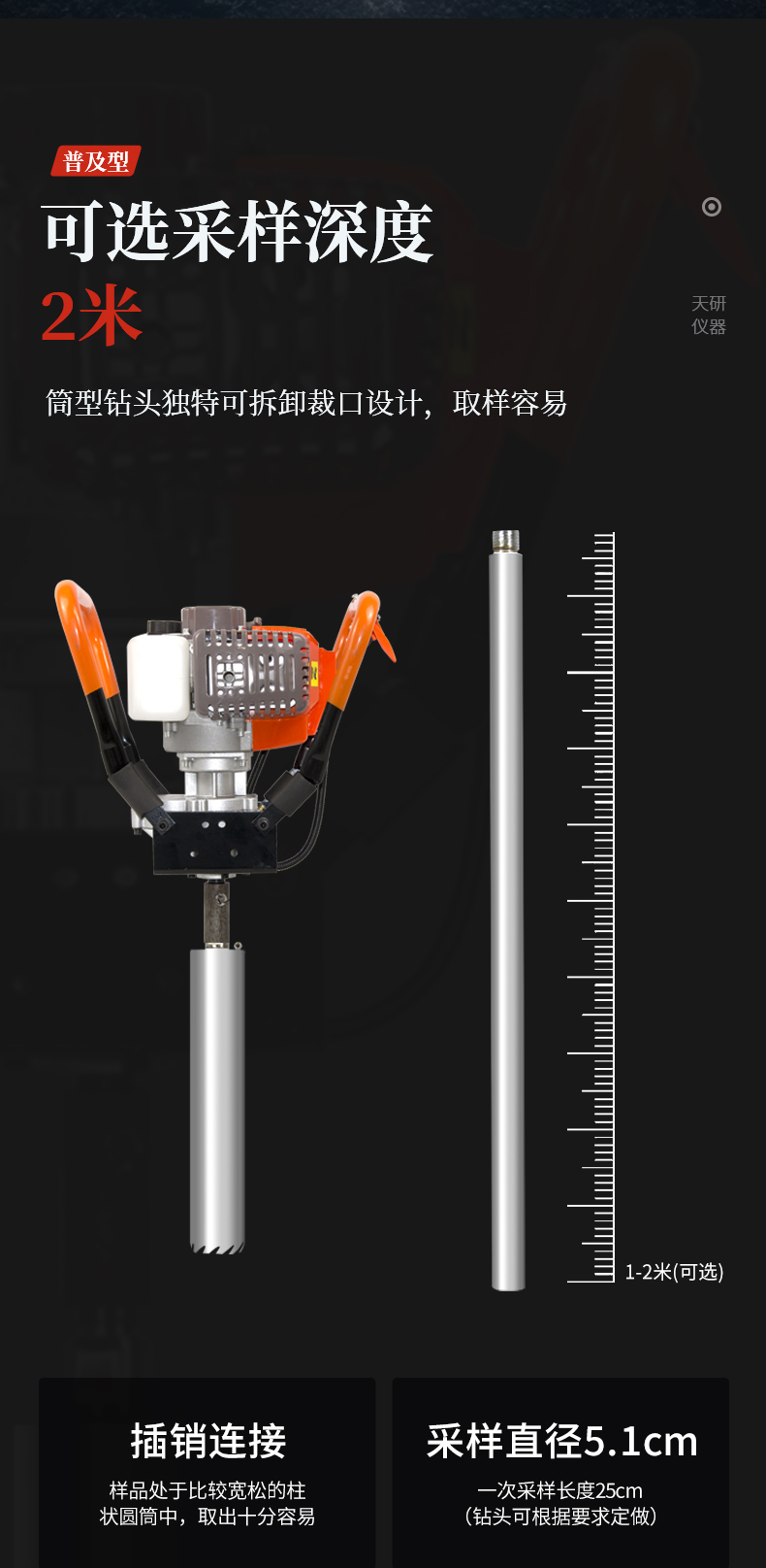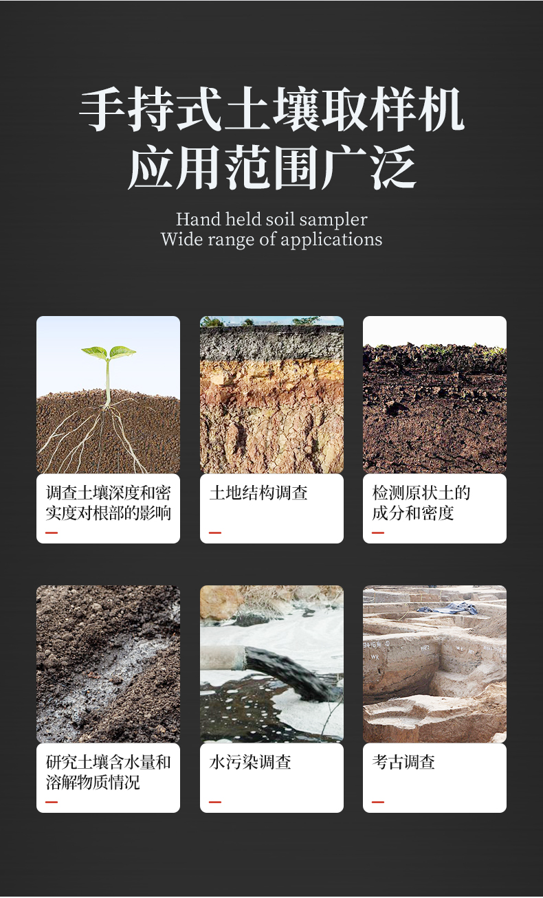 | 旋轉(zhuǎn)式,上下沒有擾動,不會破壞土壤剖面結(jié)構(gòu) | 采樣量大,插銷連接,易于拆卸。 | 鉆頭帶有鋸齒,通過沖擊錘鉆入土壤,入土容易。 | 筒型鉆頭獨(dú)特可拆卸裁口設(shè)計,取樣容易。 | 樣品處于比較寬松的柱狀圓筒中,取出十分容易 | 狀土壤很難被壓縮(保持原狀) | 采集一個樣本就可以研究整個土壤剖面情況 | 比開挖一個采樣坑要節(jié)約時間和減少樣本破壞 | 可有效地用于所有類型的土壤 |