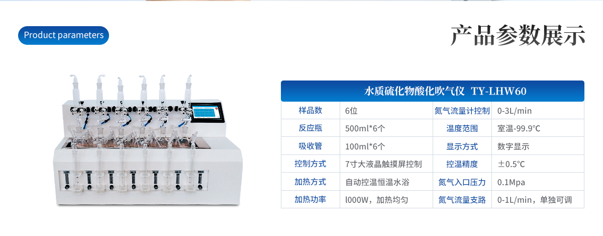 水樣中的硫化物經(jīng)酸化,生成的硫化氫隨載氣(氮氣)進(jìn)入吸收瓶/吸收顯色管中被吸收溶液(乙酸鋅-乙酸鈉溶液或2%氫氧化鈉溶液)吸收,選擇相應(yīng)的分析方法對吸收瓶/吸收顯色管中吸收的硫離子進(jìn)行分析測定。硫化物吹氣儀根據(jù)2022年新國標(biāo)水質(zhì)硫化物的測定-亞甲基藍(lán)分光光度法(典量法)標(biāo)準(zhǔn)開發(fā)生產(chǎn)的。水質(zhì)硫化物測定的樣品前處理需要。
