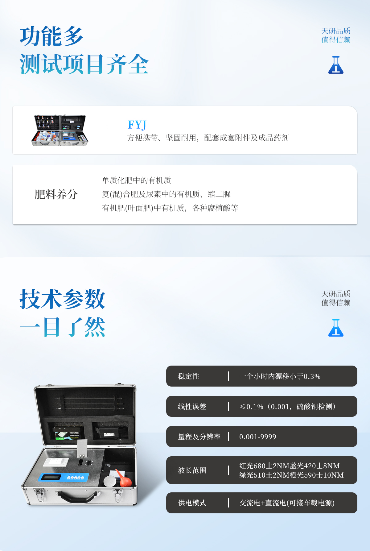 | 肥料養(yǎng)分專用檢測儀功能全:測試項目國內外最全(各類藥劑均可選購)。 | 配套齊全,該儀器集藥、器、儀為一體,攜帶方便,相當于一個小型實驗室,用戶只需提供蒸餾水即可在要求時間內完成全部操作。適于農(nóng)業(yè)服務部門或農(nóng)資經(jīng)銷商鑒別肥料真假、肥料廠商肥料生產(chǎn)中控、農(nóng)資質檢部門進行農(nóng)資打假,規(guī)范農(nóng)資市場。 | 性能可靠:工作穩(wěn)定性優(yōu)于國家標準JJG179-90指標的10倍以上,重復性達到光柵型分光光度計指標水平。 |