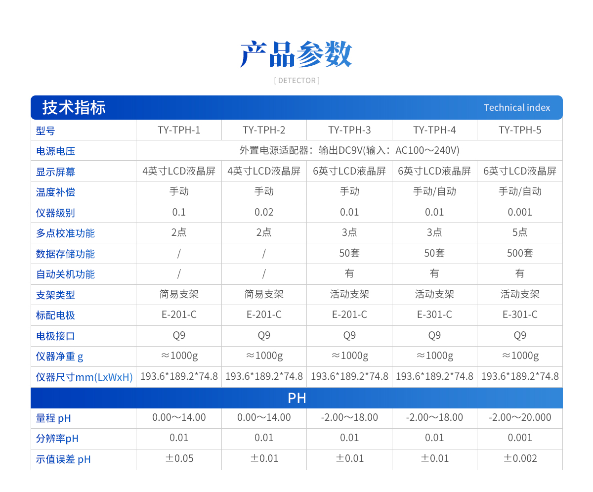 產(chǎn)品概述:TPH系列臺式酸度計(jì)是一臺實(shí)驗(yàn)室常規(guī)分析測量儀器,它適用于醫(yī)藥、環(huán)保、衛(wèi)生、地質(zhì)探礦、高等院校和科研單 位的實(shí)驗(yàn)室,測量樣品溶液的pH值。產(chǎn)品優(yōu)點(diǎn):1.顯示標(biāo)定、測量和數(shù)據(jù)穩(wěn)定符號及溫度、電極斜率。2.支持背光和恢復(fù)出廠、手動溫補(bǔ)、連續(xù)測量模式功能。3.支持?jǐn)?shù)據(jù)存儲、刪除和查閱(PH50-3/4/5)及數(shù)據(jù)打印和