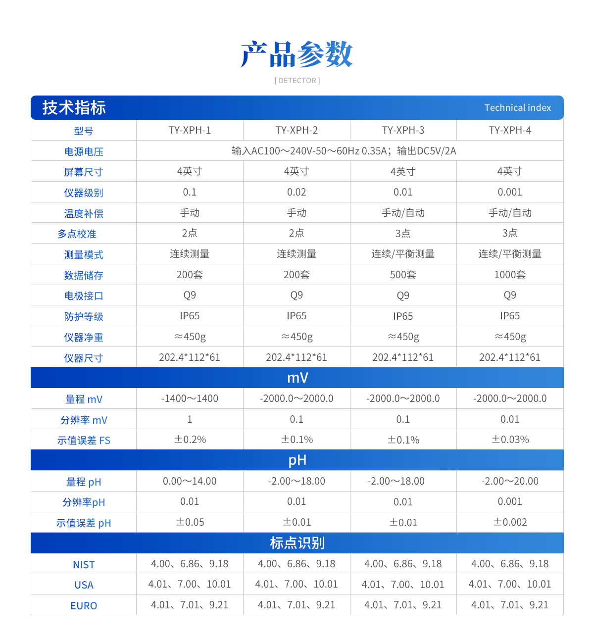 產(chǎn)品概述:XPH系列便攜式酸度計是一款實驗室pH測量儀器,可廣泛應(yīng)用高校、環(huán)保、醫(yī)藥、食品、衛(wèi)生、地質(zhì)探礦、冶金、海洋探測等領(lǐng)域,常見的酸雨檢測、工業(yè)廢水、地表水、飲用水、飲料、日化產(chǎn)品、紡織品等,均需要進行pH測量。產(chǎn)品優(yōu)點:1.支持IP65防護等級。2.支持自動識別NIST、USA、EURO最多三點標定功能。3.支持背光和恢