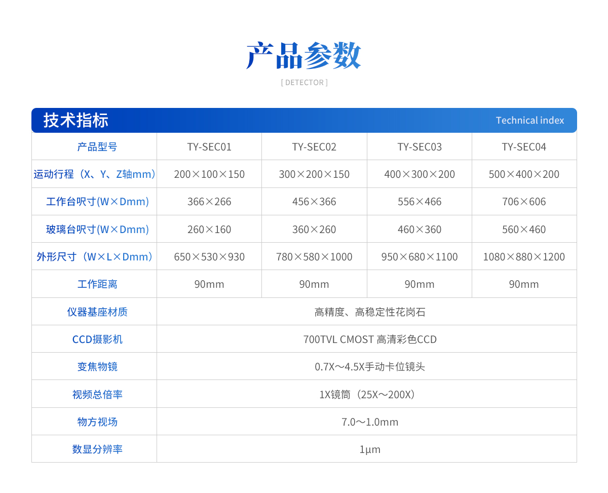 | 高穩(wěn)定性高精度花崗石材質(zhì) | 700TVL COMST模擬信號(hào)相機(jī) | 0、7~4、5 X手動(dòng)卡位鏡頭(萊斯) | 高精度位移傳感電子尺,分辨率:1μm (精微) | 咸陽(yáng)藍(lán)博P級(jí)精密V型導(dǎo)軌(LB) | 西德無牙光桿精密傳動(dòng)(西德)、高精密T型絲桿(特制) | LED恒流環(huán)形冷光源 | 綠色單顆LED冷光源+雙組透鏡均光平行底光模組 | UWC3200 | DTV 2、5T手動(dòng)影像測(cè)量軟件 | DTV 定制 | AC/DC |