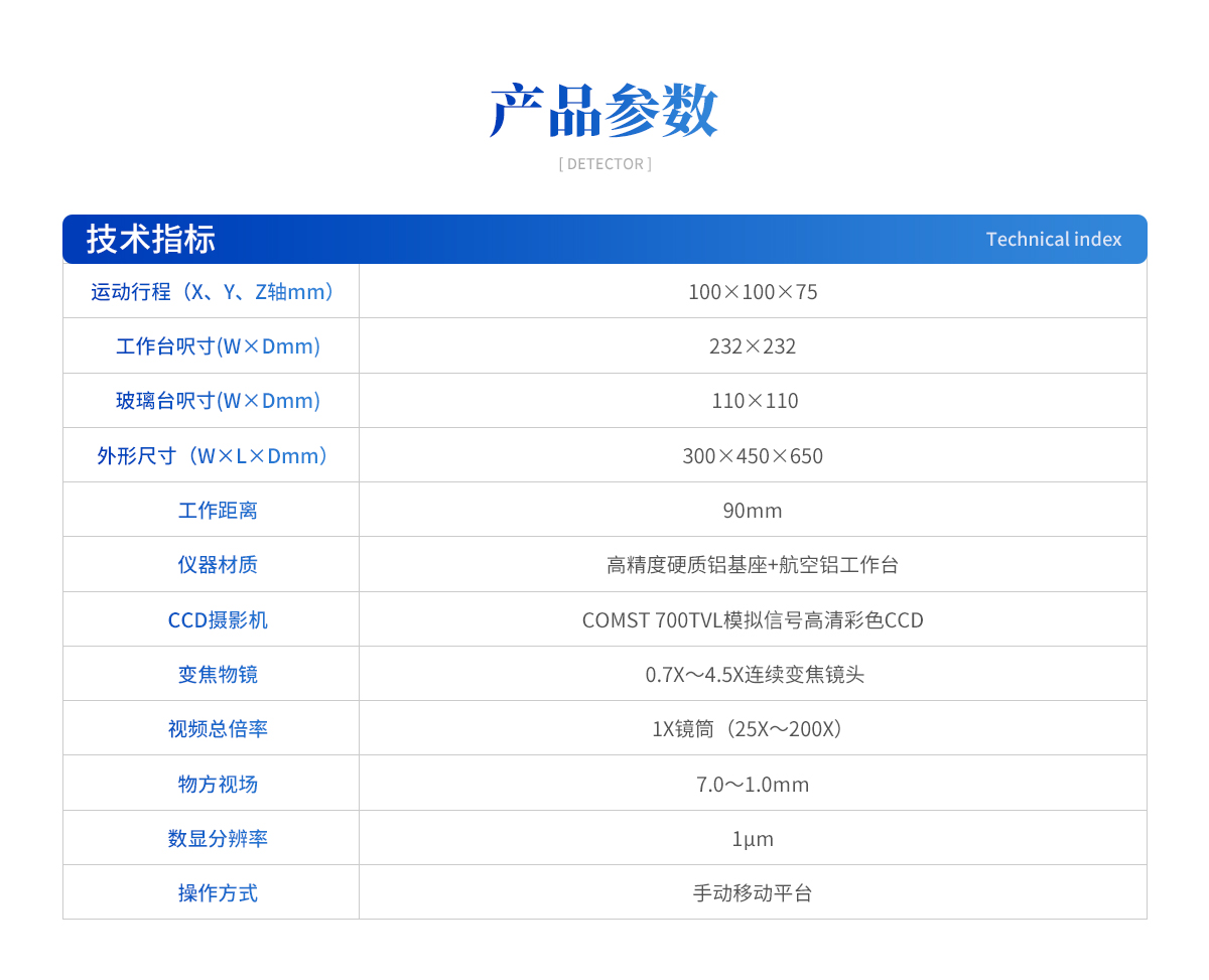 | 1、運(yùn)動(dòng)行程(X、Y、Z軸mm):100×100×75; 2、 工作臺(tái)呎寸(W×Dmm): 232×232 3、 玻璃臺(tái)呎寸(W×Dmm): 110×110 4、 外形尺寸(W×L×Dmm): 300×450×650 5、 工作距離:90mm 6、儀器材質(zhì): 高精度硬質(zhì)鋁基座+航空鋁工作臺(tái) 7、CCD攝影機(jī):COMST 700TVL模擬信號(hào)高清彩色CCD 8、 變焦物鏡: 0.7X~4.5X連續(xù)變焦鏡頭 9、 視頻總倍率:1X鏡筒(25X~200X) 10、 物方視場(chǎng): 7.0~1.0mm 11、 數(shù)顯分辨率:1μm 12、 數(shù)顯分辨率:1μm 13、 操作方式:手動(dòng)移動(dòng)平臺(tái) |